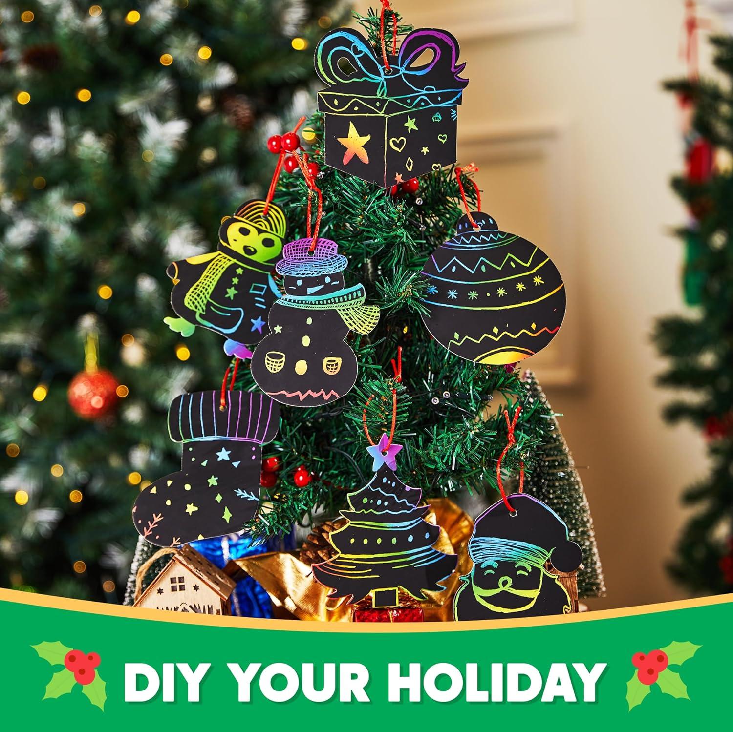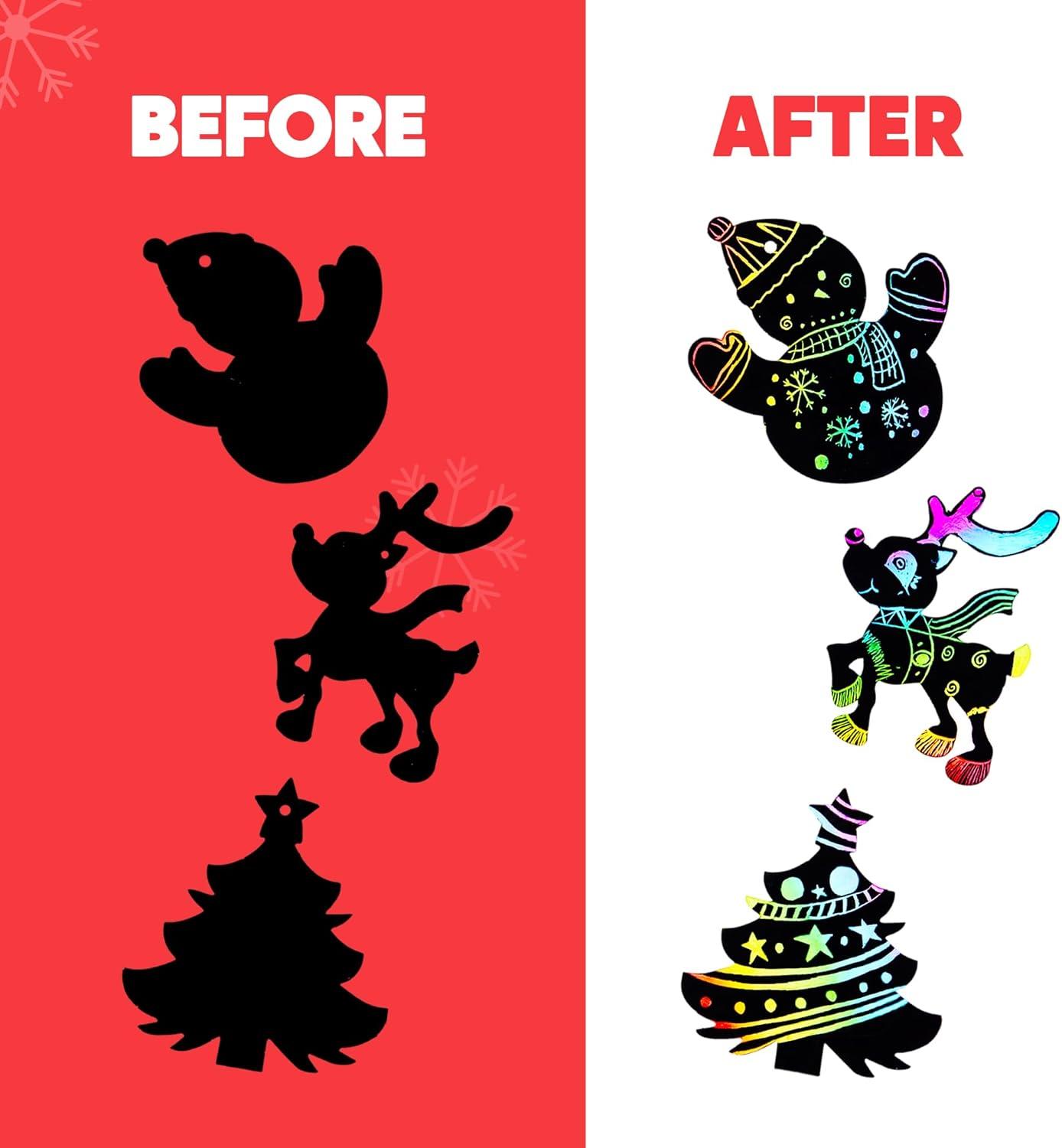 Super valuable Christmas craft kits include 72 scratch paper(8 pcs for 9 patterns), 72 red cords, and 24 drawing sticks.