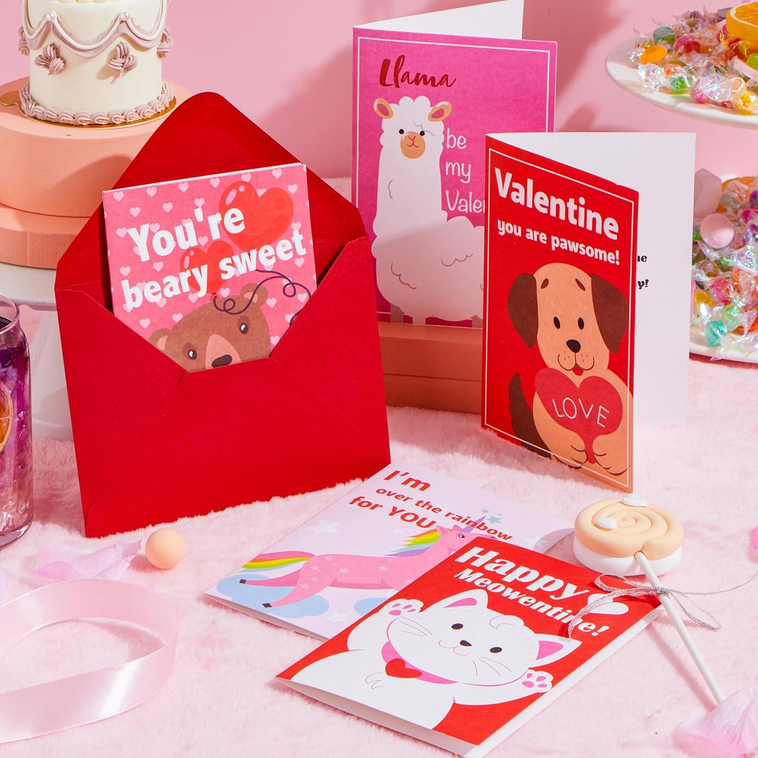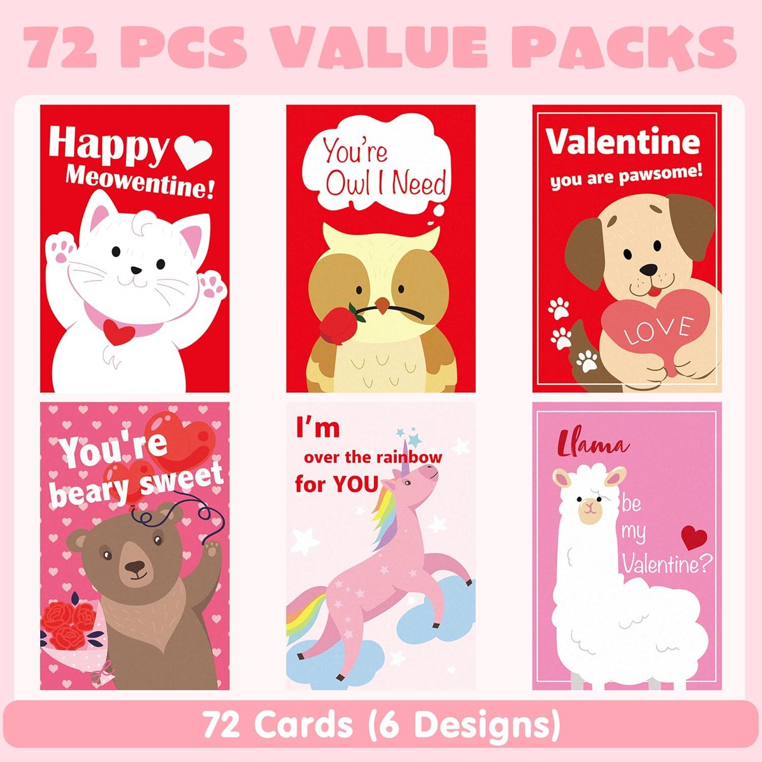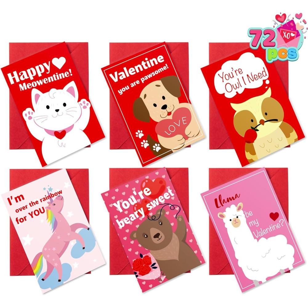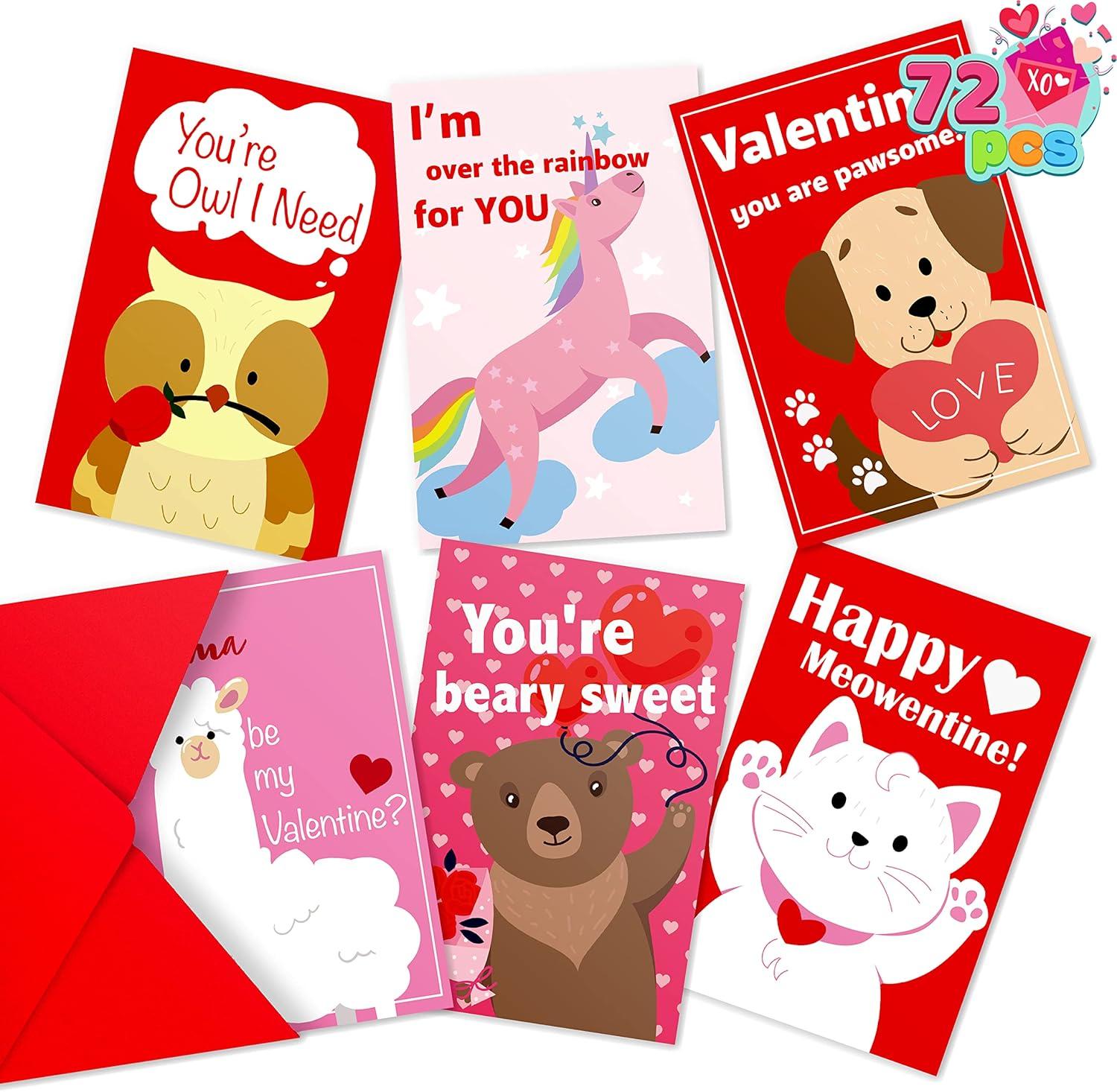 SUPER VALUE PACK. Our Hearts Day Party Favor includes 72 Pcs Valentine's Day Animal Characters Greeting Cards.Our Valentine Greeting Card with Envelopes have 6 different designs. Each card measures 6.1″ tall X 4″ width (after folded).