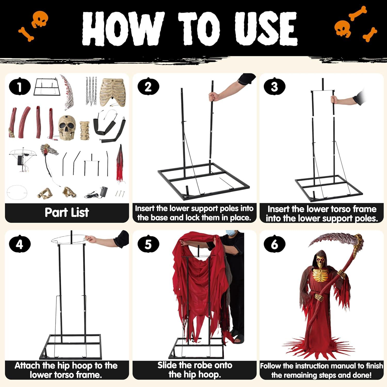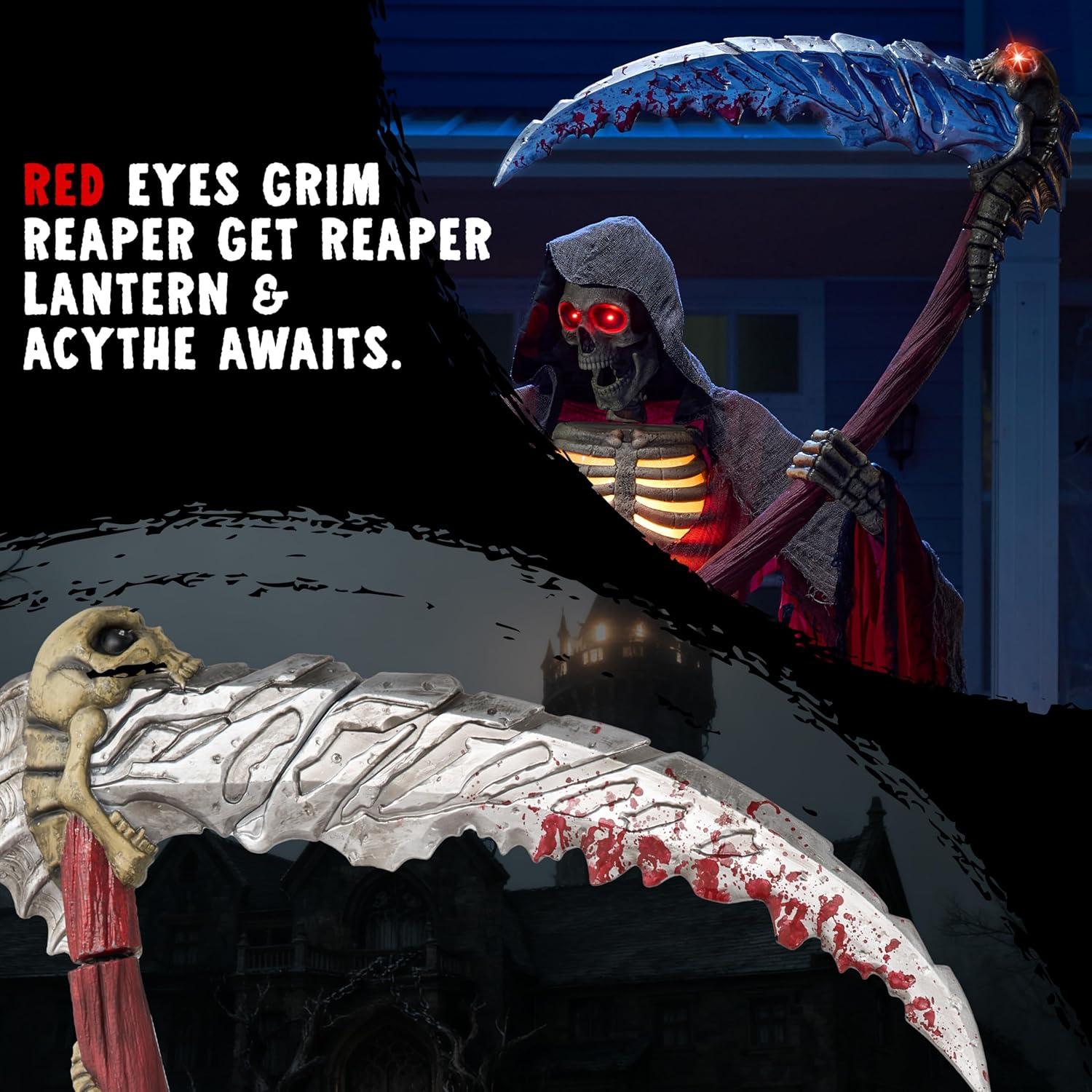 Halloween Animatronics Grim Reaper: This 8.3ft tall giant animatronic Grim Reaper holding a realistic large scythe prop. The Halloween Grim Reaper has rotating head, and its jaw moves, delivering chilling lines. Not only do its eyes glow with red LEDs, but its chest flame lamp also glow menacingly in the dark, witch will dominate your Halloween decorations indoor or Haunted House decor.