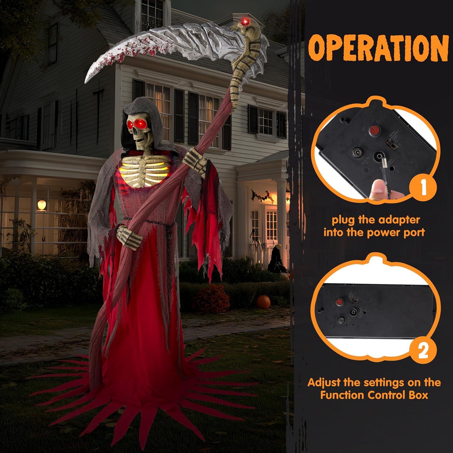 Giant Size: This Halloween Grim Reaper is 8.3ft tall, and the huge scythe makes it look even more terrifying in your house. it's easy to set up, only plug it in and requires no batteries.(PLUG-IN POWERED)