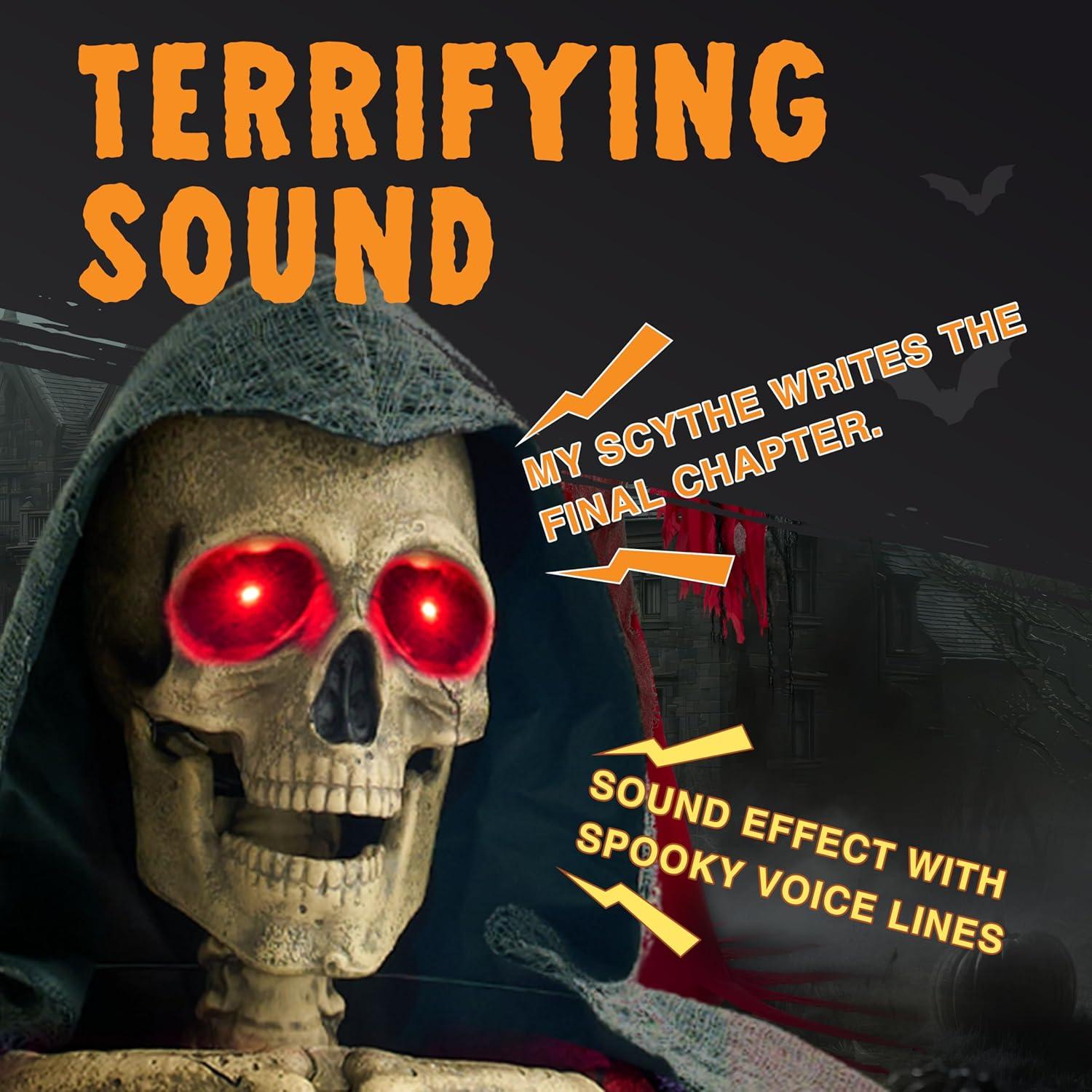 IR Sensor Activated: This Halloween grim reaper animatronic decor has an IR sensor that detects motion and activates instantly when you get close to it, triggering bone-chilling sound, light and motion. Perfect for halloween decor.(Not waterproof)