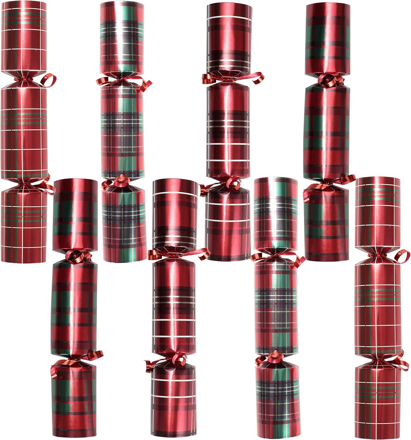 Xmas No-Snap Party Favor: Our Holiday Party Favor Set includes 8 packs of Christmas party table favors with Red Check plaid designs. Each party favor contains a paper crown hat, a Christmas joke paper, and a random gift inside.