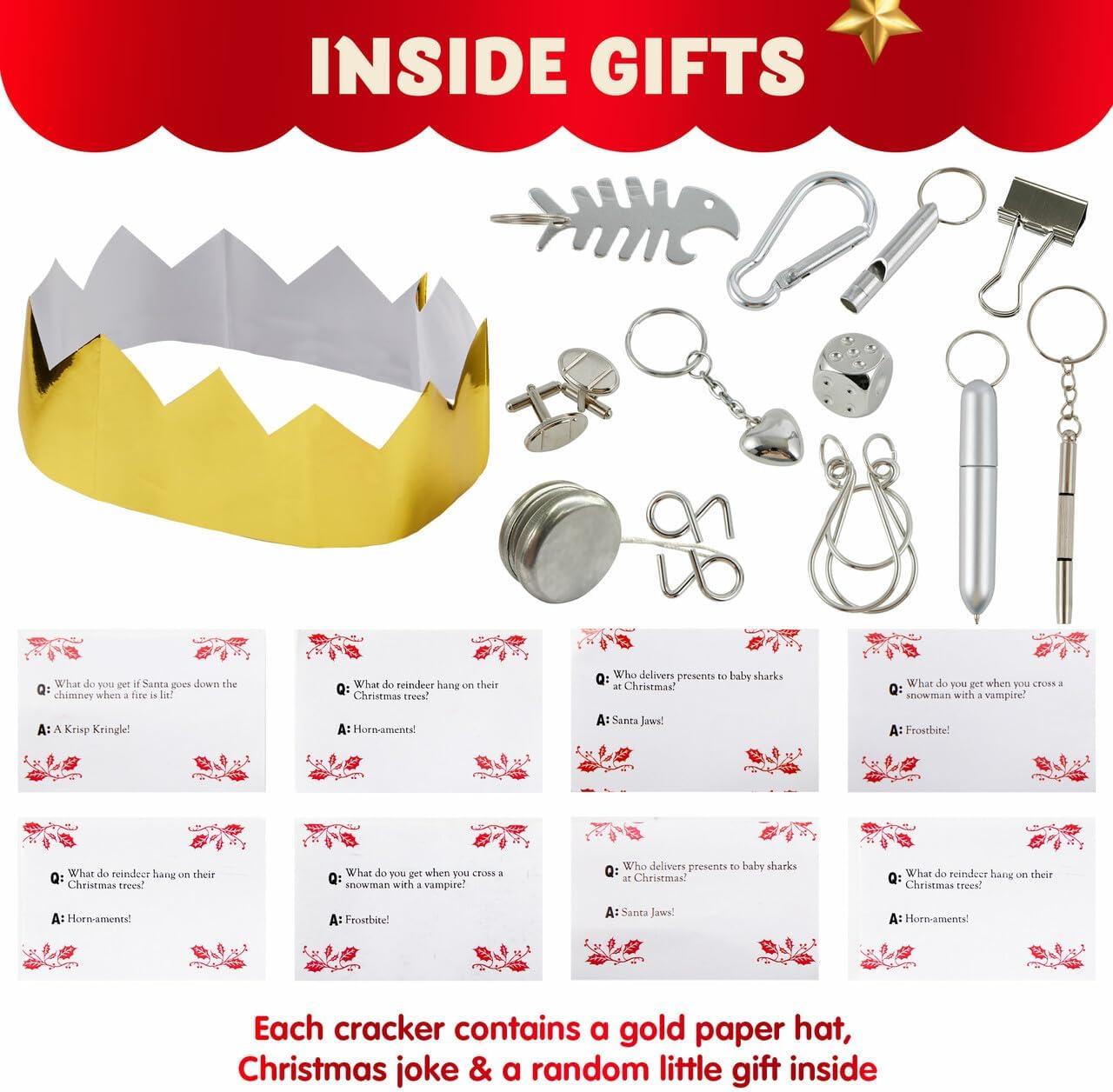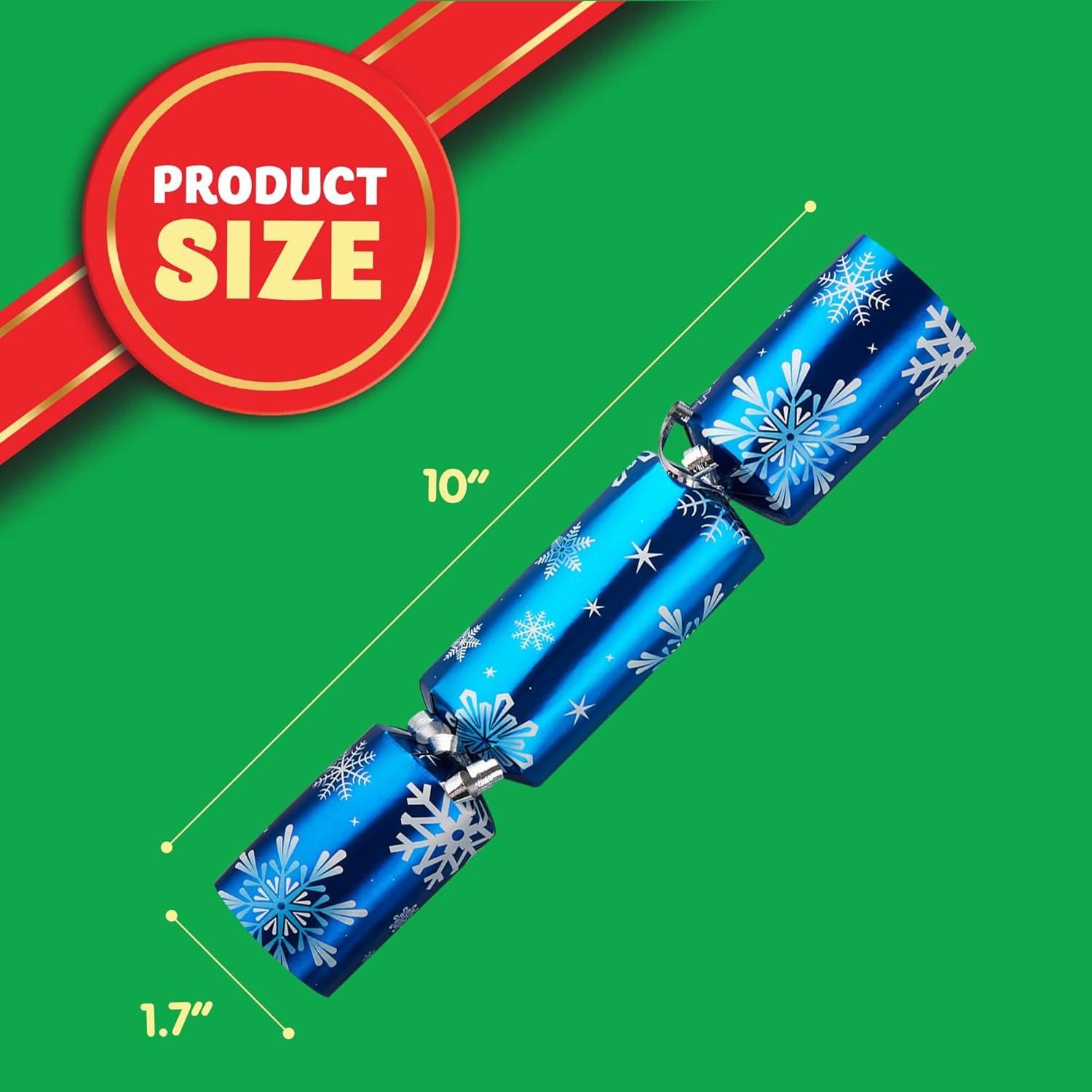SUPER VALUE PACK. Our Holiday Party Favor includes 8 Packs of No Snap Christmas Party Table Favors with Blue and White Snow Flakes Design. Each party favor contains a party paper hat, a Christmas joke paper, and a random gift inside. Gifts include: Screwdrivers with Keyring, Mountaineering Buckle, Metal Puzzle, Heart Shape Keychain, Silvery Dice, Fish Bottle Opener, Cufflinks & Ball Pen.