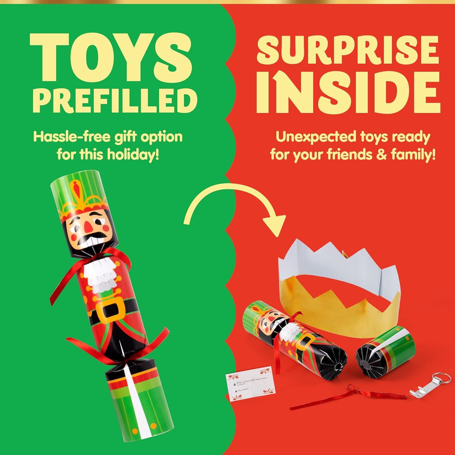 SUPER VALUE PACK. Our Holiday Party Favor includes 8 Packs of Christmas Nutcrackers Party Table Favors (4 assorted designs). Each 10” favor contains a party paper hat, Christmas jokes, and a random little toy or gift inside.