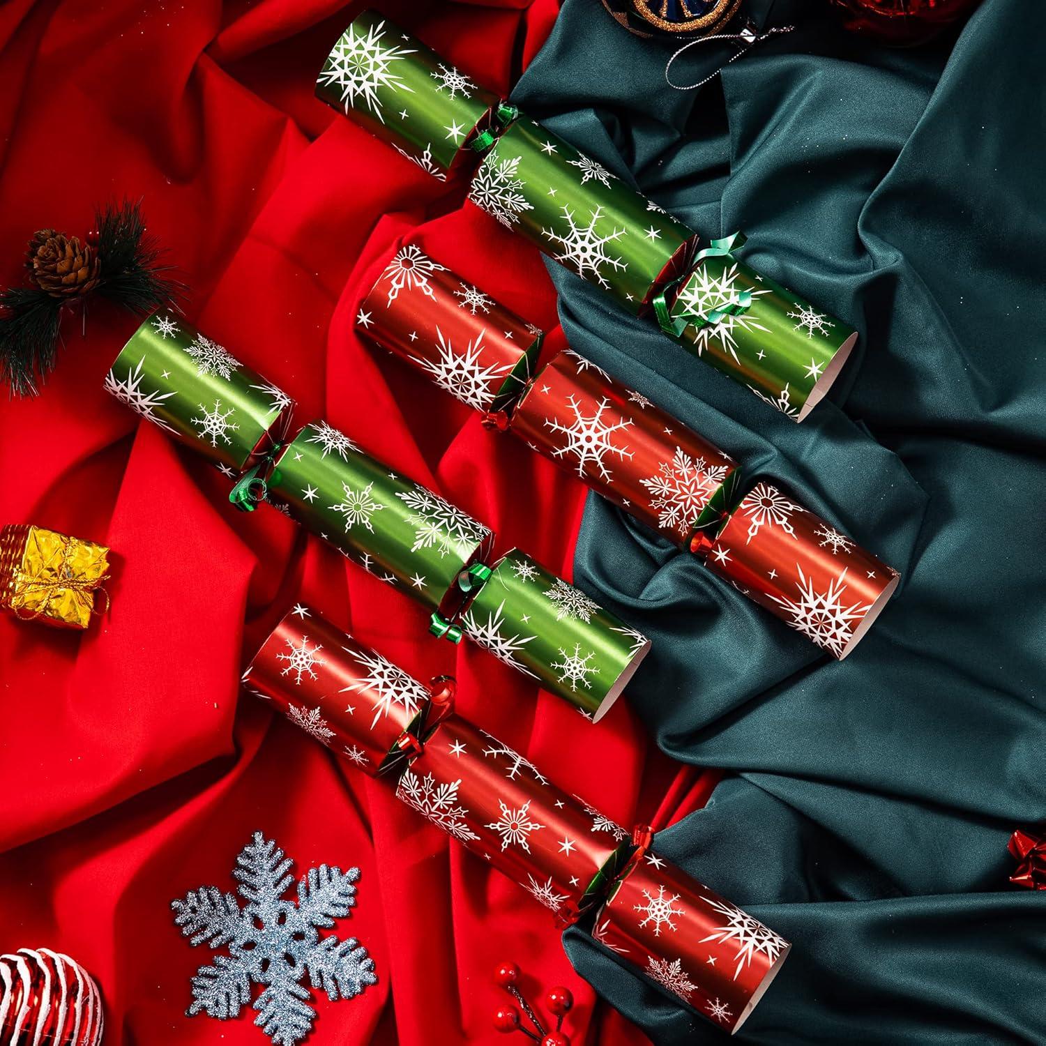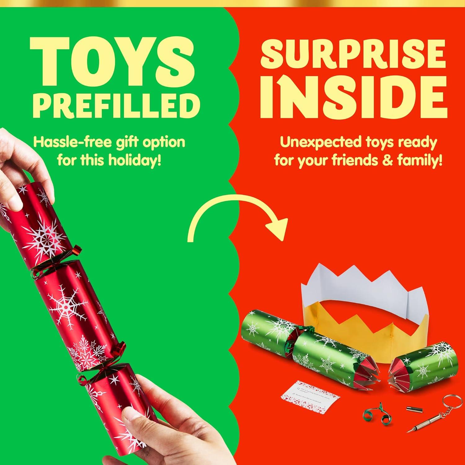 SUPER VALUE PACK. Our Holiday Party Favor includes 8 Packs of No-Snap Christmas Party Table Favors with Red & Green Snowflake Design. Each party favor contains a party paper hat, a Christmas joke paper, and a random gift inside.
