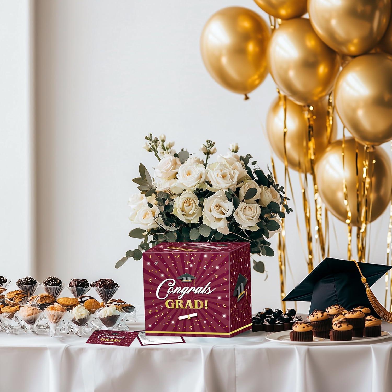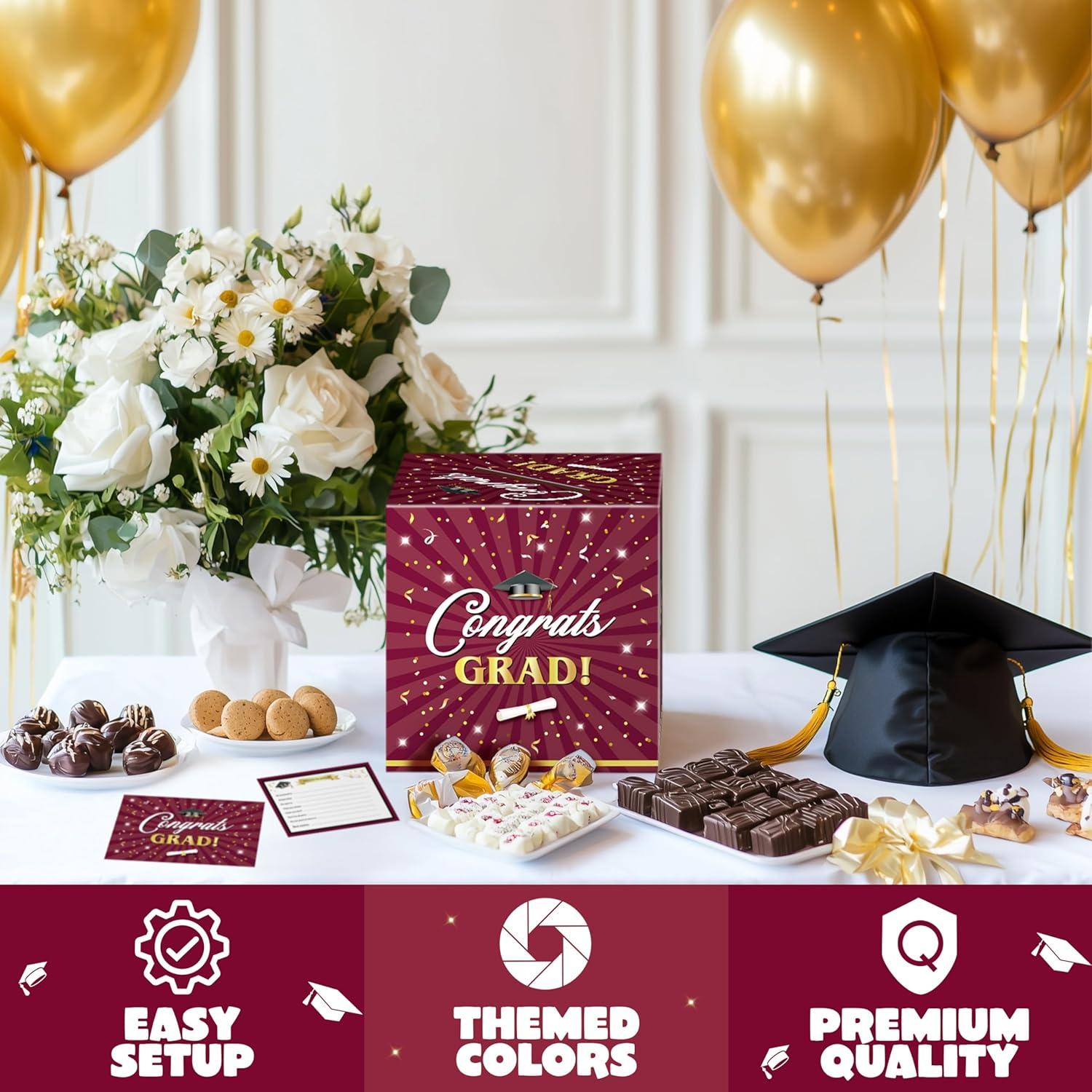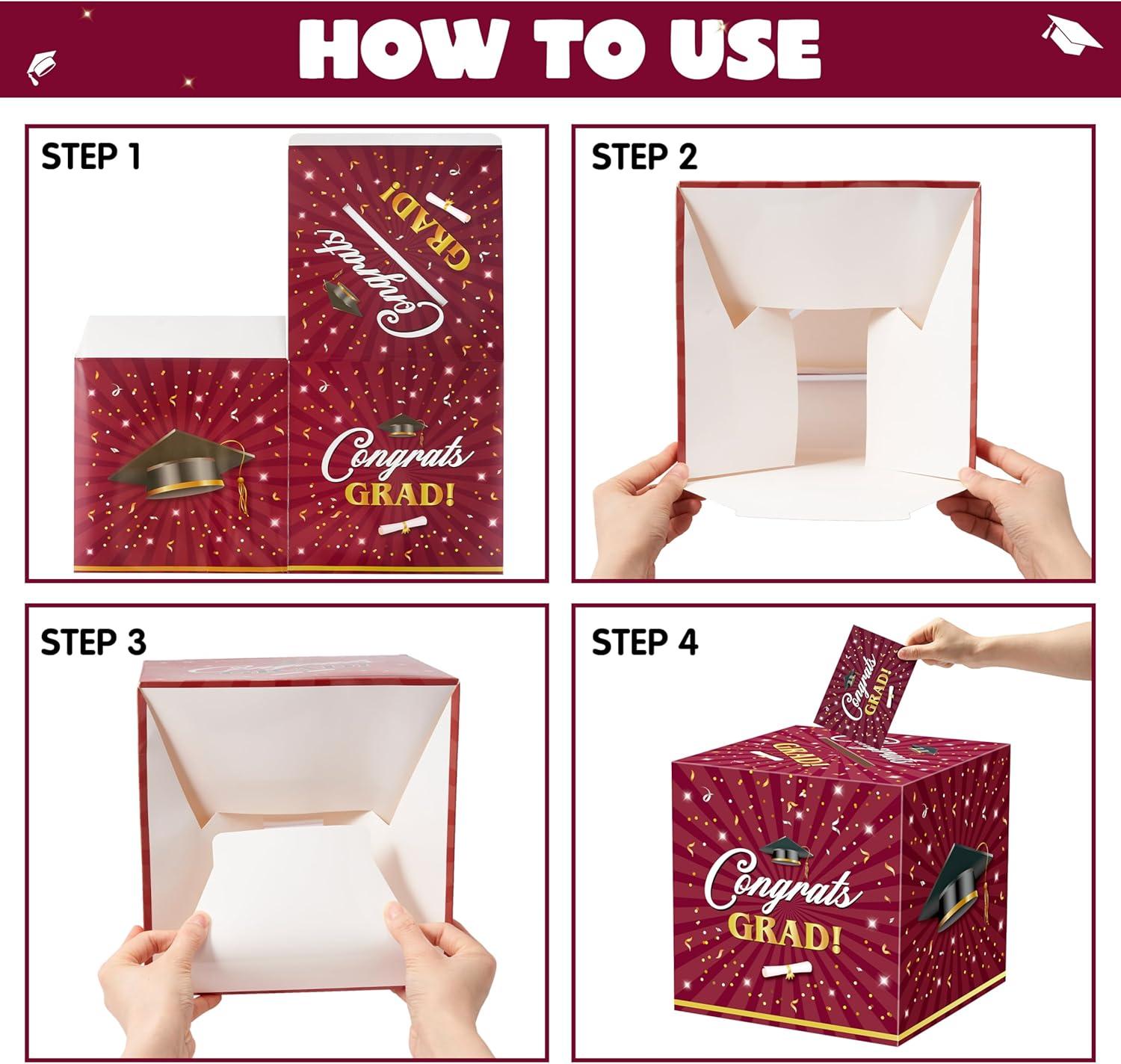 Perfect for Every Occasion: Suitable for college, high school and doctoral graduation party celebrations. You can use them at graduation parties to collect blessing and encouragement cards, and also decorate indoors and outdoors, gift tables, welcome receptions. It can also be used in conjunction with other graduation party decorations. This stylish maroon and white graduation box is also great for storing graduation money, a must-have for 2025 graduation party card boxes!