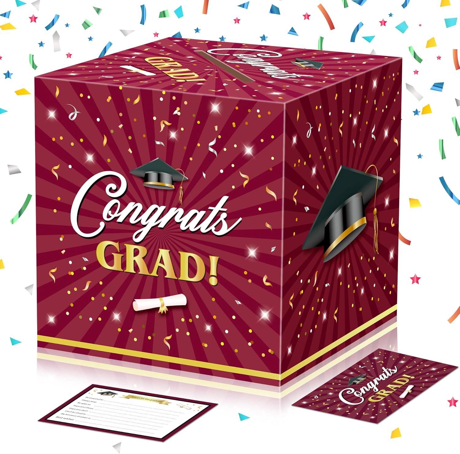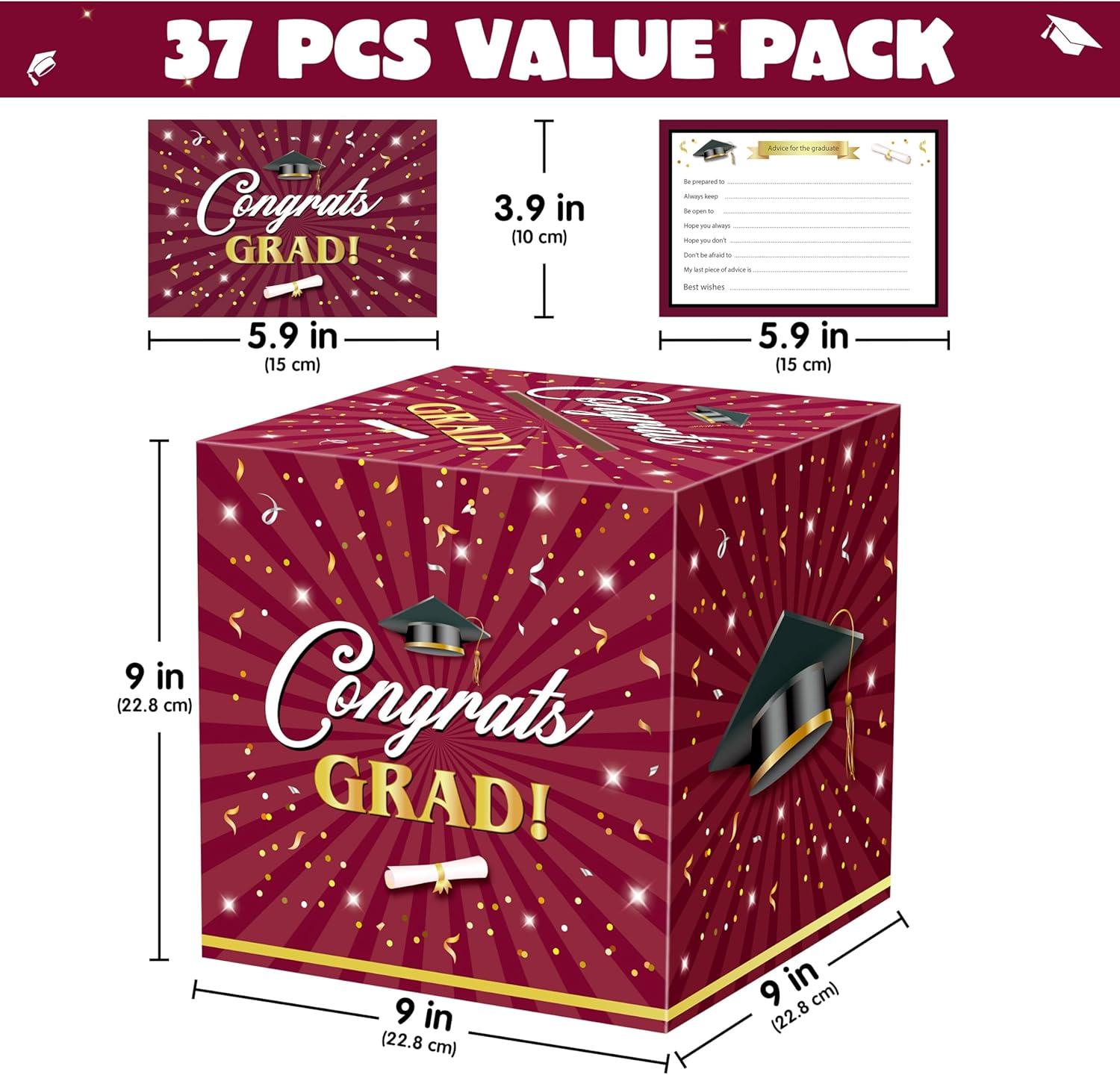 Super Value Package Content: You’ll receive a spacious graduation card box along with 36 pcs of congrats grad cards. The card box measures a generous 9'' x 9'' x 9'', providing the ideal size to collect all your gifts and cards. The cards measure about 5.9'' x 3.9'', it can be placed on the gift table, or used as a centerpiece, and you can easily enjoy your graduation moments through the perfectly positioned slot at the top!