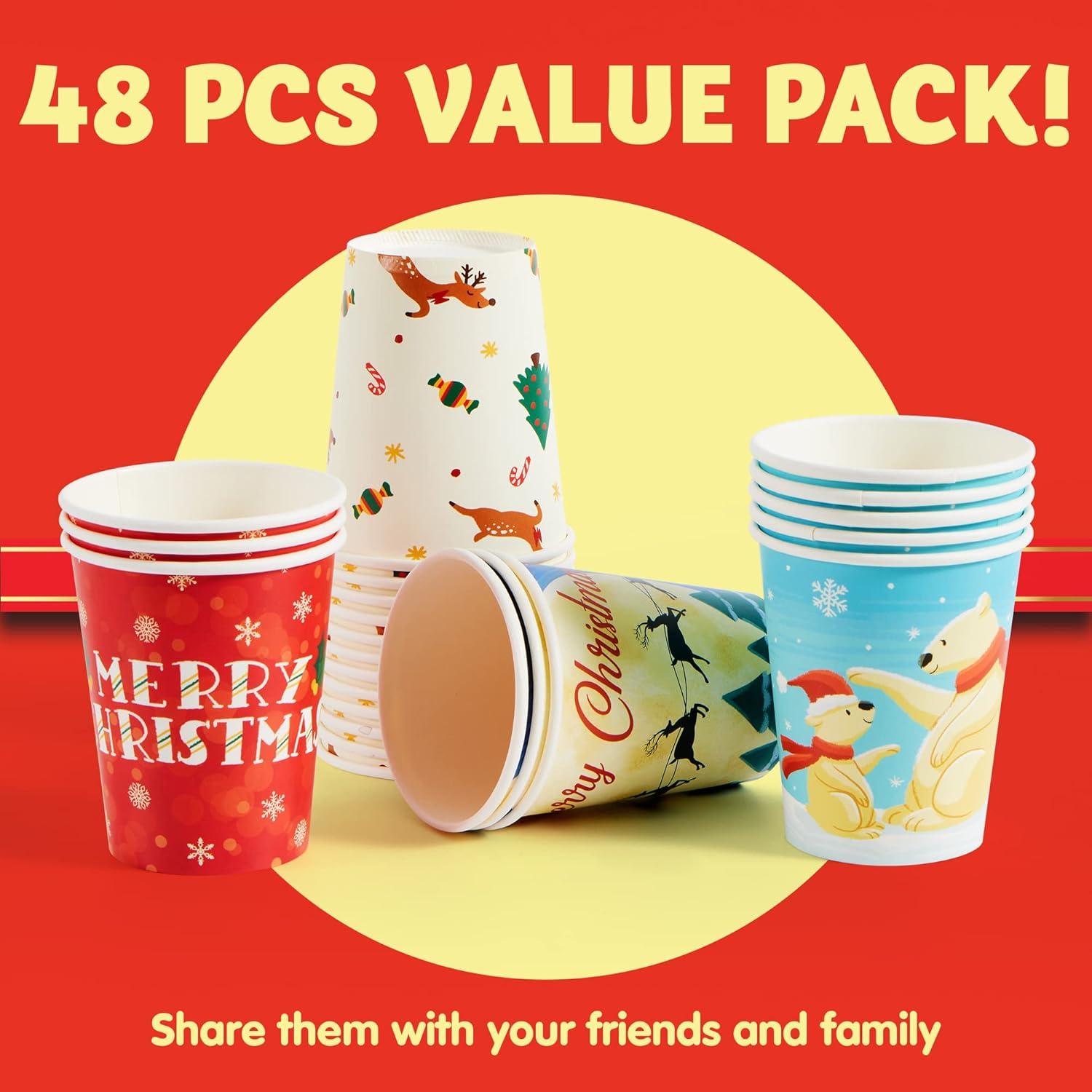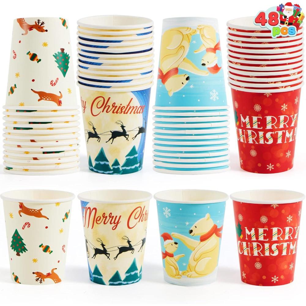 SUPER VALUE PACK. Our Christmas Paper Cups Set includes 48 pieces of Christmas paper cups measuring 9 oz in 4 assorted Holiday designs.