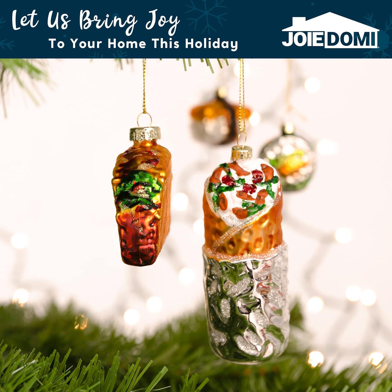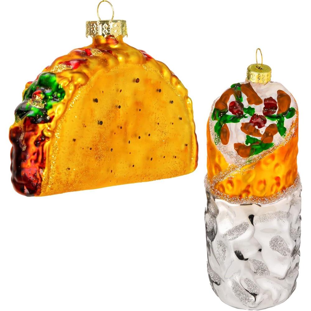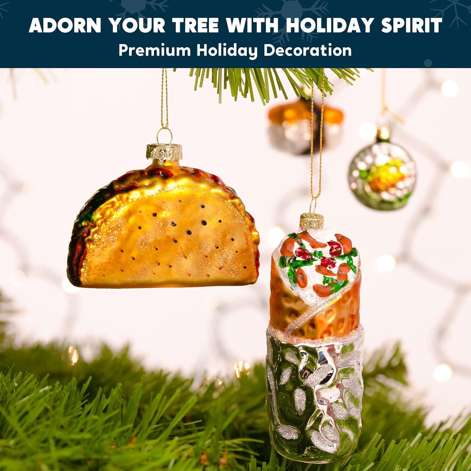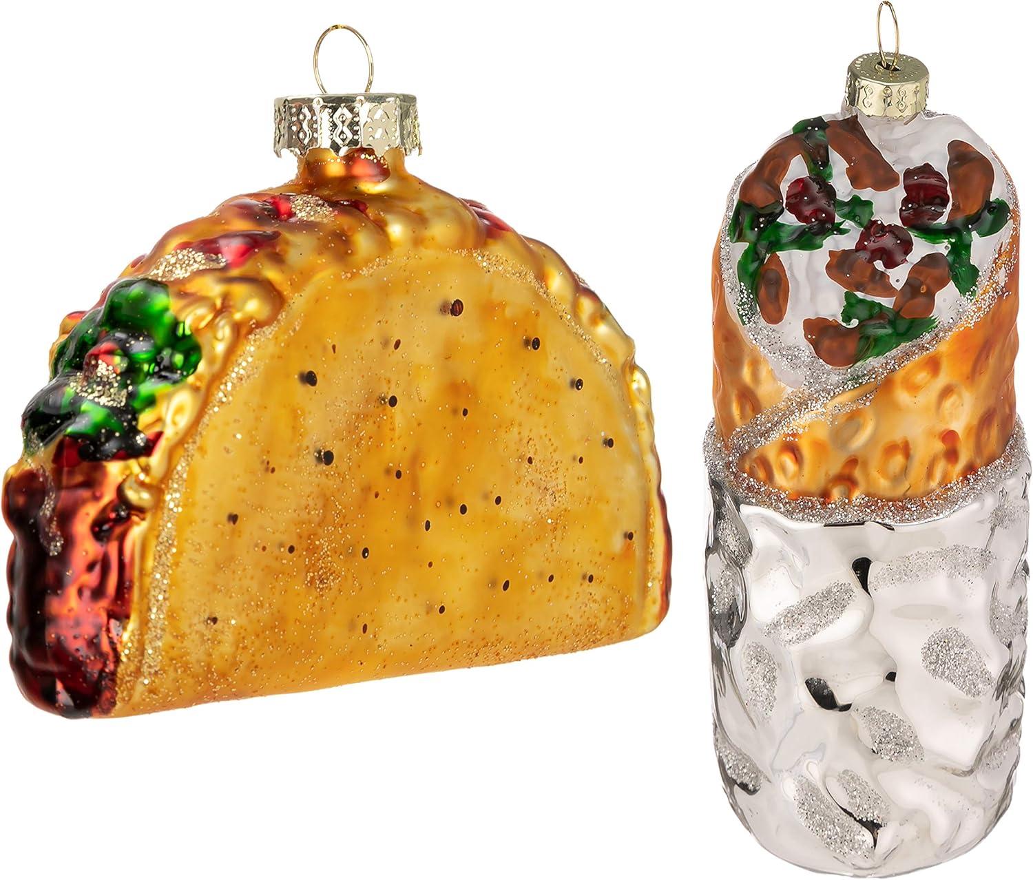 SUPER VALUE PACK: Our Glass Christmas Tree Ornaments Set includes one piece of taco and one piece burrito with hand-painted style. They are glass blown ornaments based on the entity. The size of burrito is 4.3 inch x 1.57 inch and the size of taco is 3.4 inch * 2.25 inch.