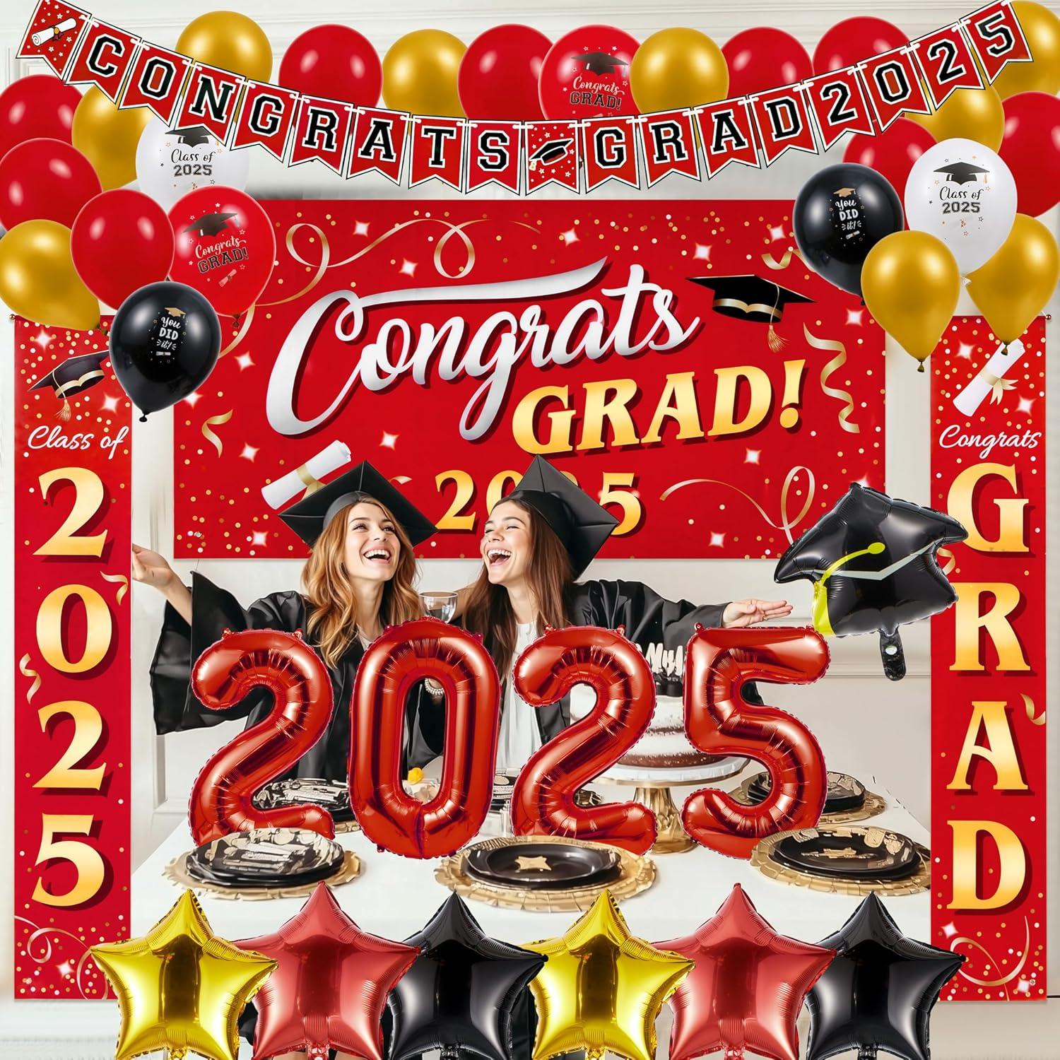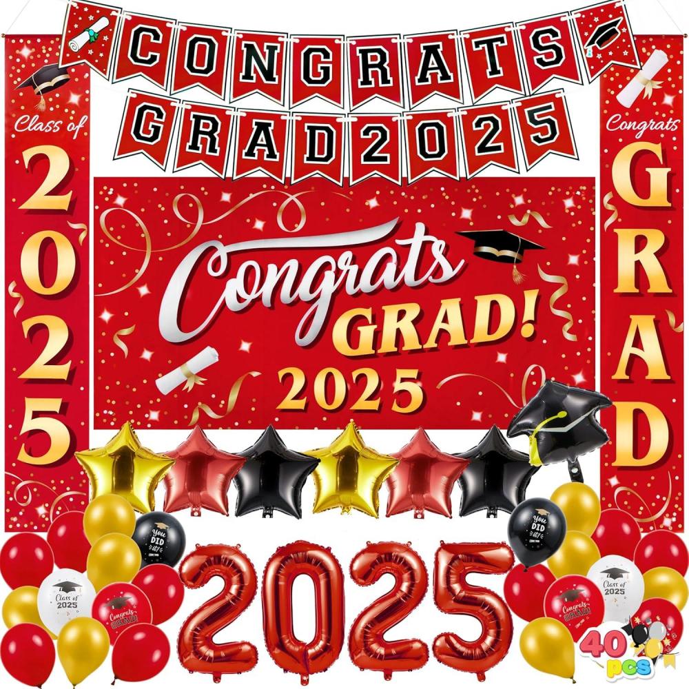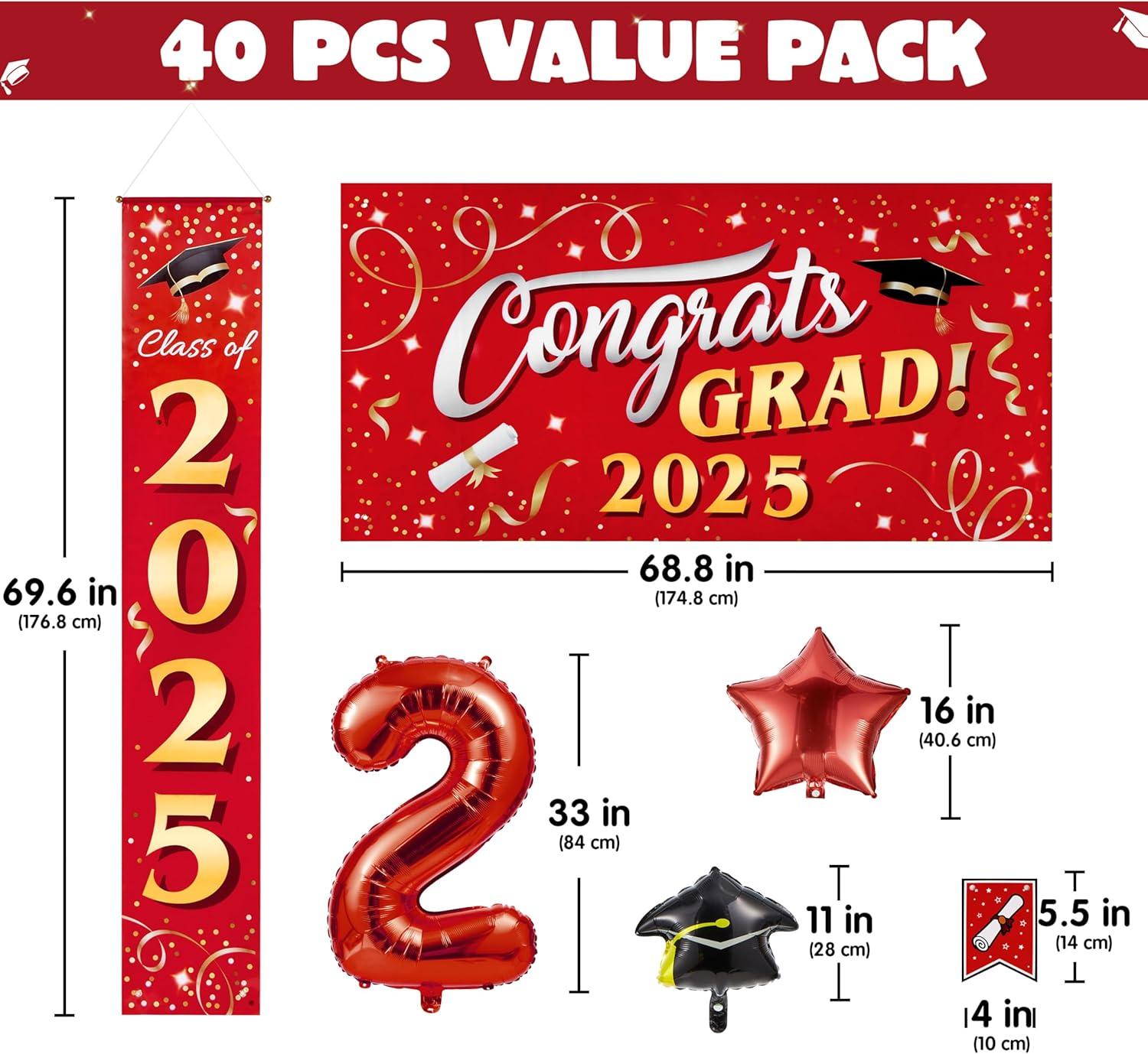 Super Value Pack: Celebrate your achievement with a bang! This set includes 40 decorations featuring 1 backdrop banner, 2 hanging banners, 4 pcs of 32'' gold foil balloons showcasing '2', '0', '2', '5', 1 grad cap foil balloon, 6 pcs of 18'' star foil balloons, 24 pcs of 10'' latex balloons in red, black, white, and gold, plus a card hanging strip. All included in our “Super Value Package Content”!