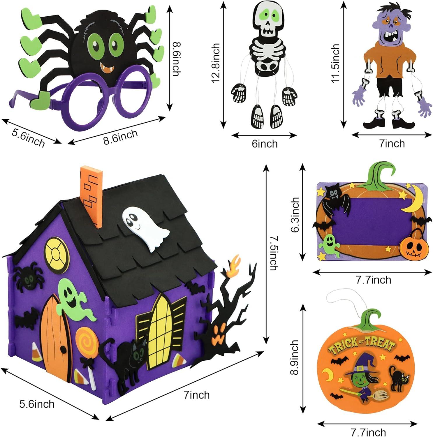 SUPER VALUE PACK. Our foam Halloween party favor includes a 3D Haunted House, Witch Trick or Treat Door Sign Hanger, Halloween Photo Frame, Spider Glasses, and 2 Halloween Characters Decor (Skull and Zombie). This craft kit comes with a unique design more than one hundred accessories and many Halloween characters included.