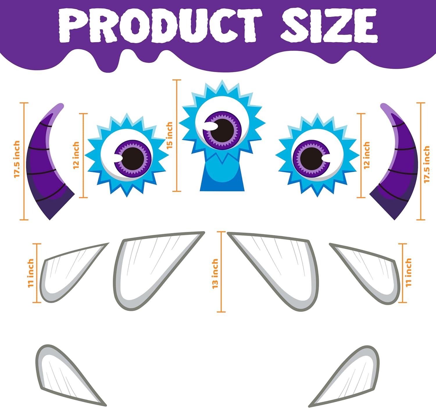 SUPER VALUE: Celebrate Halloween in a fun and safe way at a trunk-or-treat event where kids can go trick-or-treating in a well-lit, contained area. This Halloween trunk or treat kit has everything you need to dress up your vehicle. Includes 1 monster set (3 eyes- 1 of 15″, 2 of 12″, teeth-13″/11″, tongue-a 59″polyester cloth, horns-17.5″), 12 ballons (6 purple, 6 orange), 2 blue strips (78.7″*4.3″), traceless stickers.