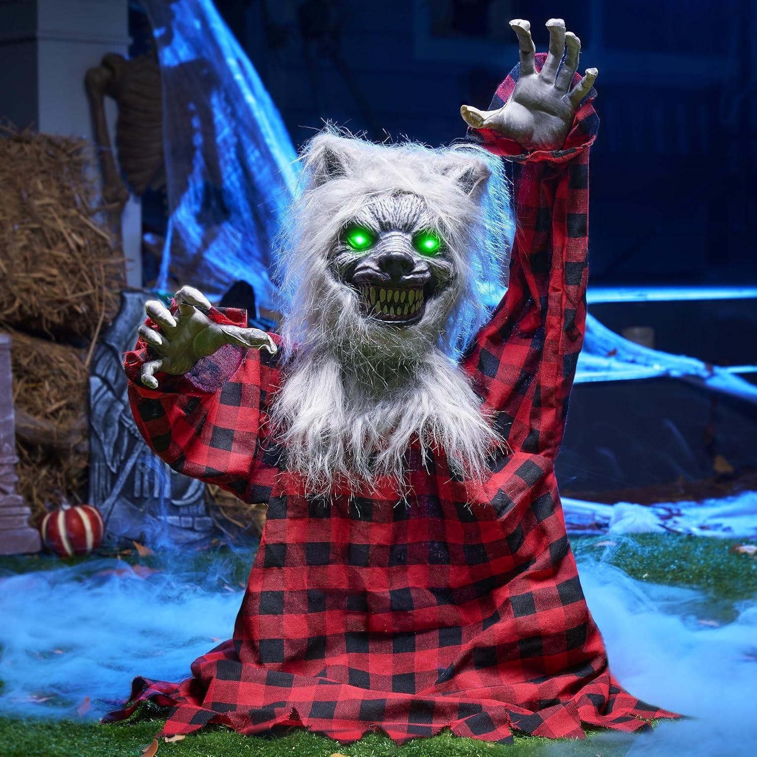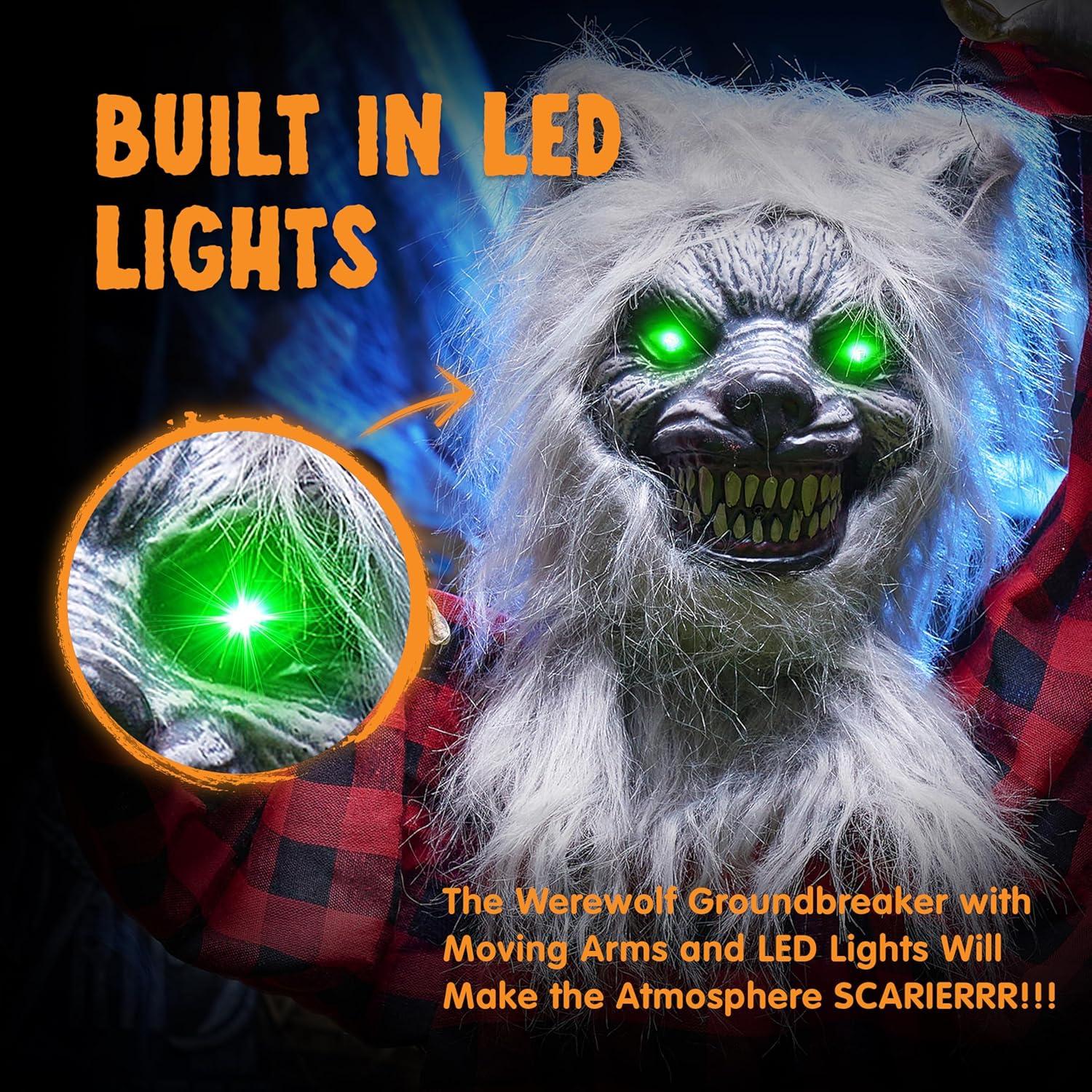 Spooky and Interactive : When you appear within one meter of the Werewolf Groundbreaker and make a sound, watch in amazement as our werewolf's waving arm movements come to life, accompanied by green light eyes and creepy sounds. Werewolf Groundbreaker’s face and teeth are detailed and realistic, that add authenticity to your Halloween decor. Let your Halloween festivities be filled with scares and thrills that'll have your guests screaming for more!