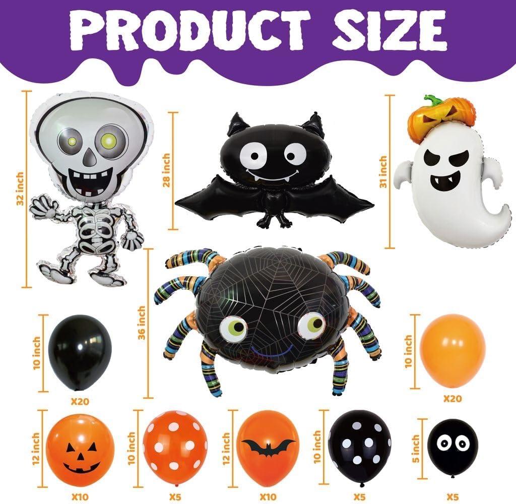 SUPER VALUE PACK: This kit includes 75pcs latex balloons (20 orange balloons-10″, 20 black balloons-10″, 10 orange balloons with Jack-O-Lantern face print-12″, 10 orange balloons with bat print-12″, 5 orange polka dot balloons-10″, 5 black polka dot balloons-10″, 5pcs black balloons with eyes-5″), 4 foil balloons (1 bat-28″, skeleton-32″, spider-36″, ghost with pumpkin hat-31″), 1 roll of balloon stripe and 2 rolls of glue points, giving you a perfect balloon set to decorate your car.