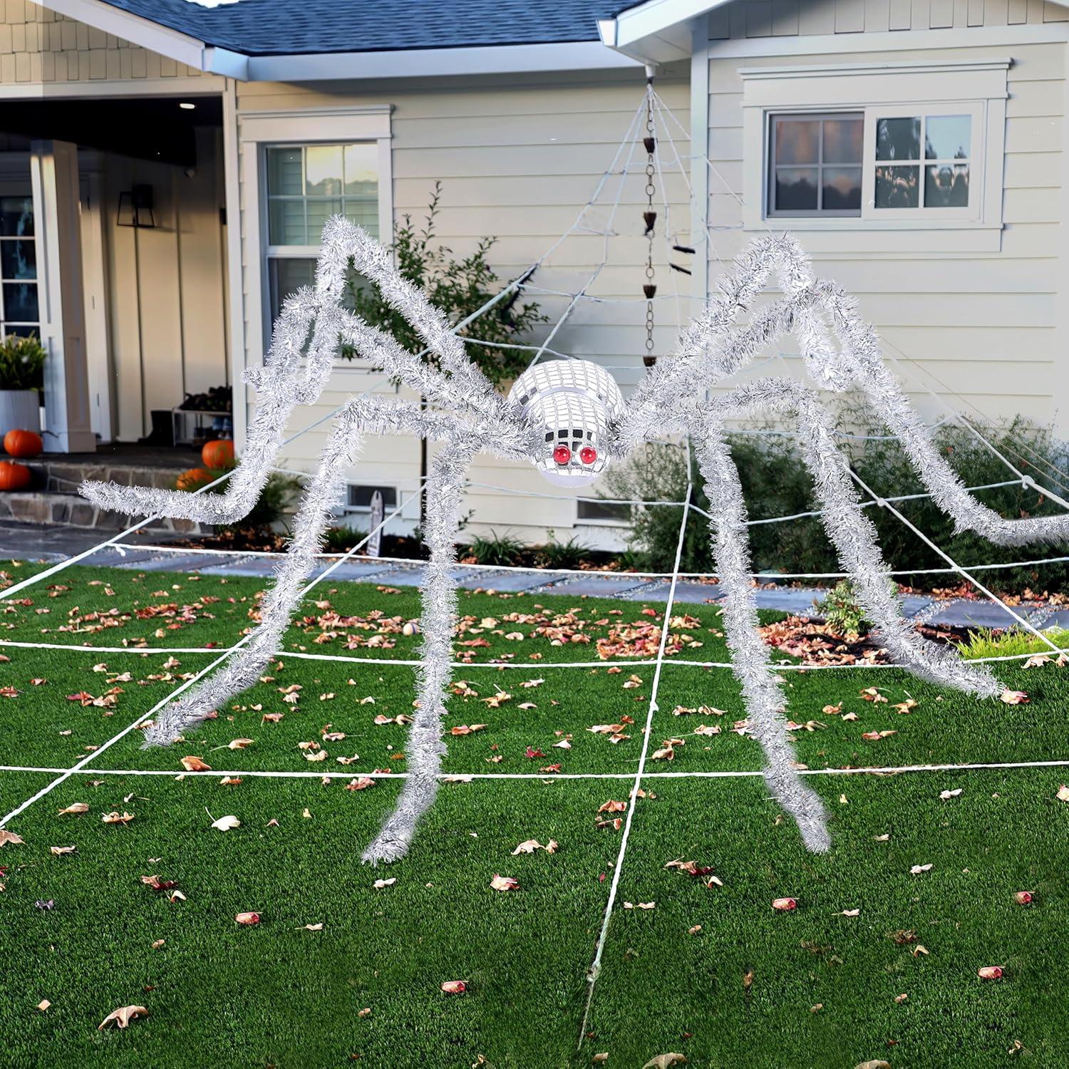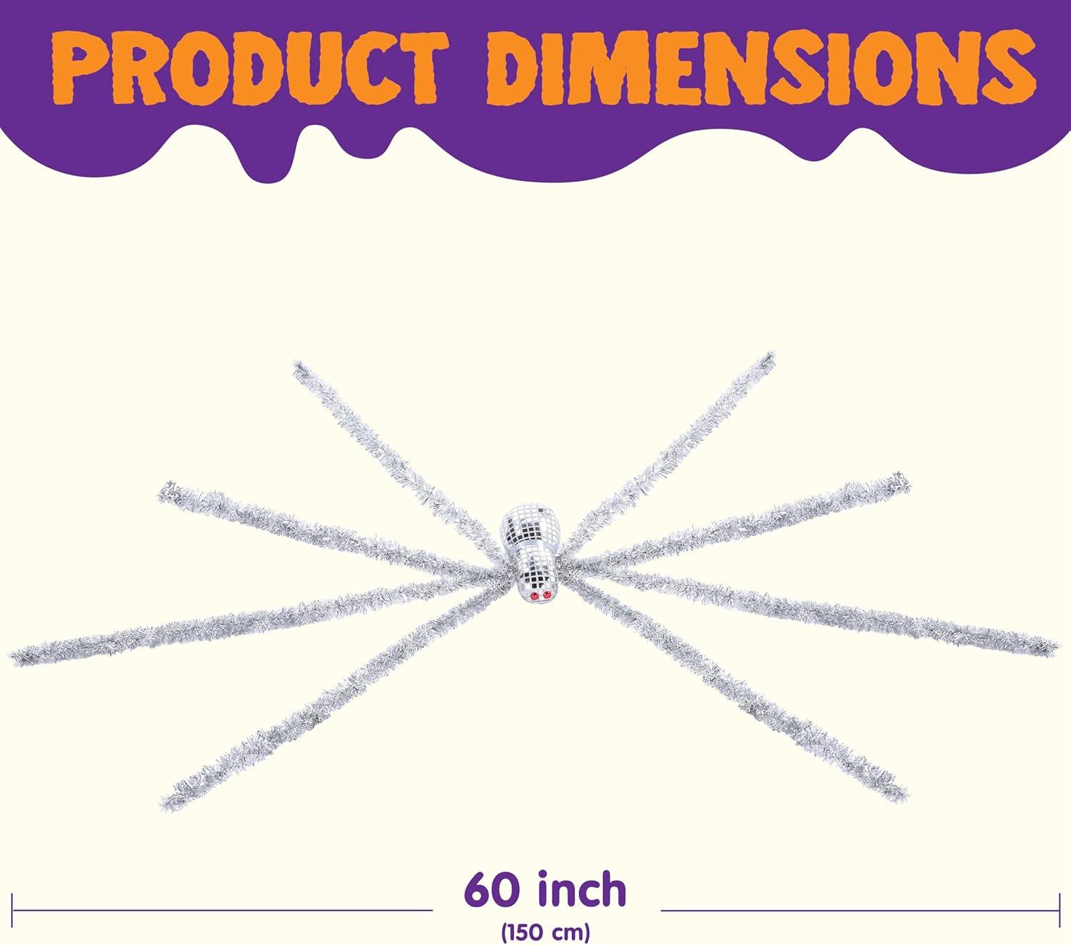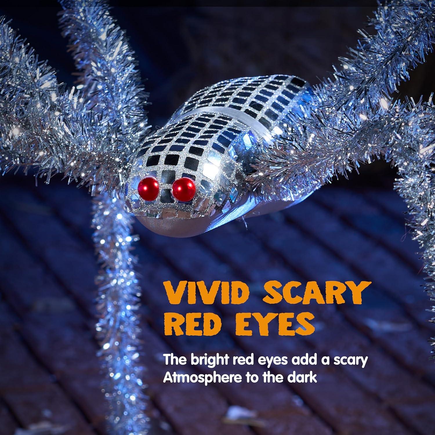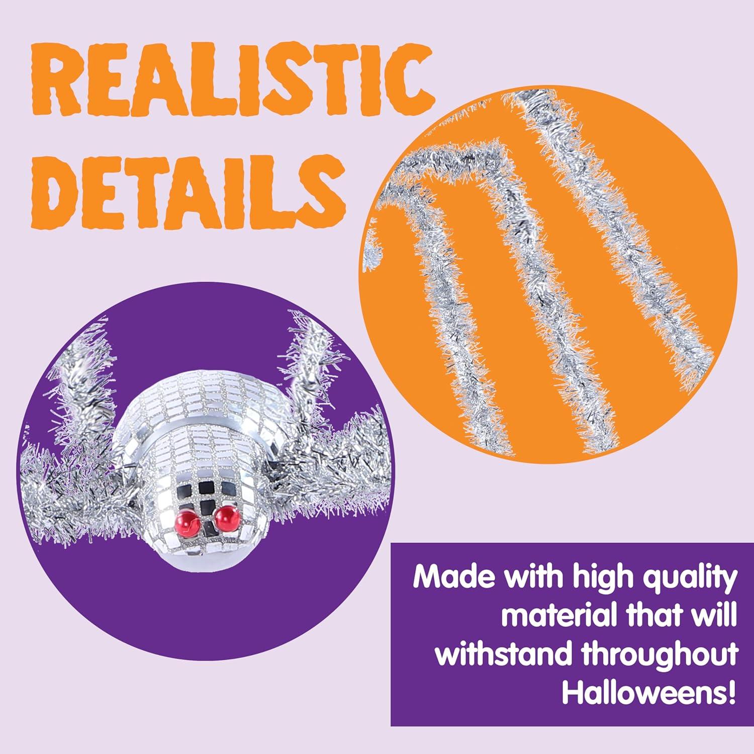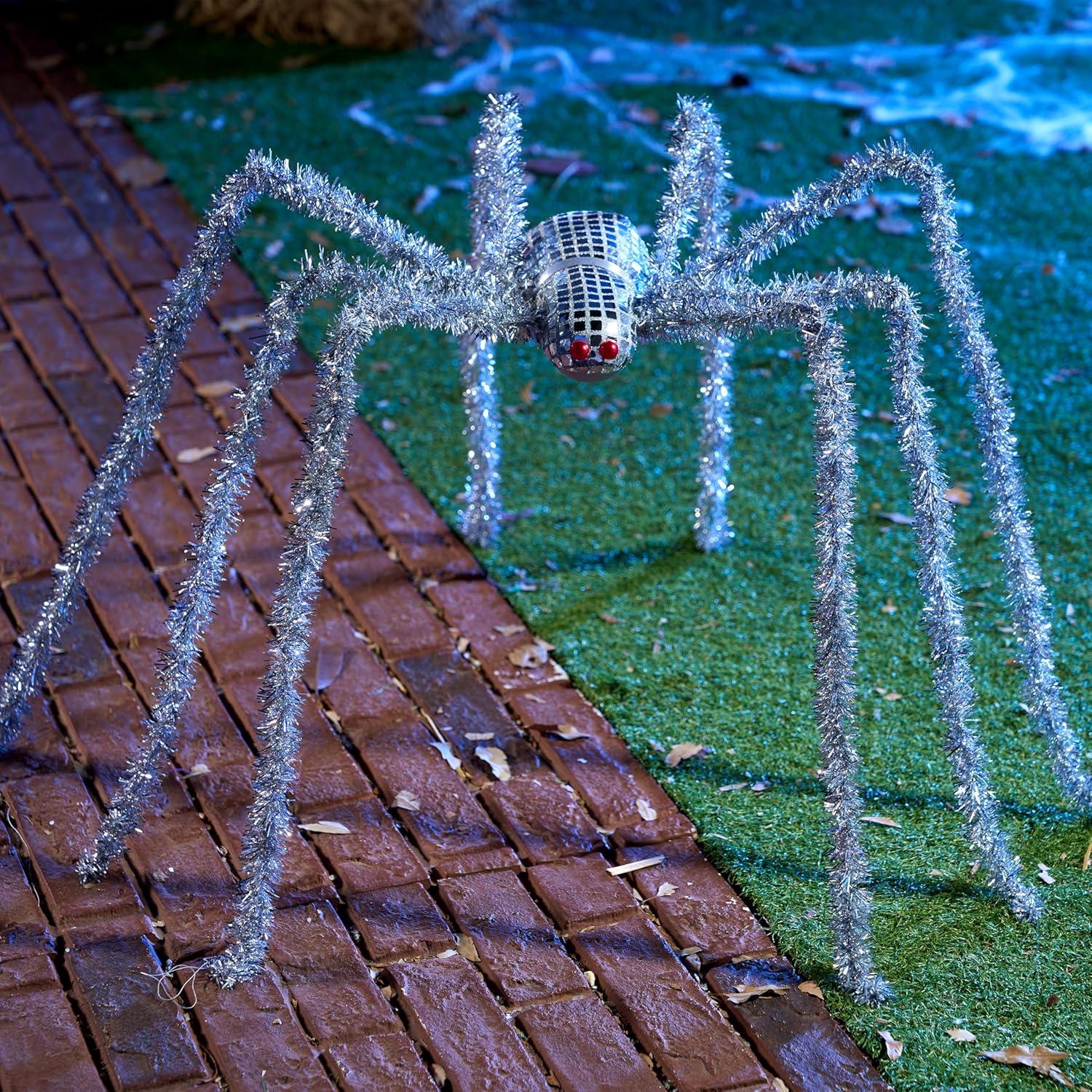 Giant Spider: Dominate your Halloween yard with this disco ball silver spider, engineered with a metallic shimmer finish that mimics moonlight on spider silk. Bend and flex them to create different stances, resulting in a standing height between approximately 10 and 15 inches.