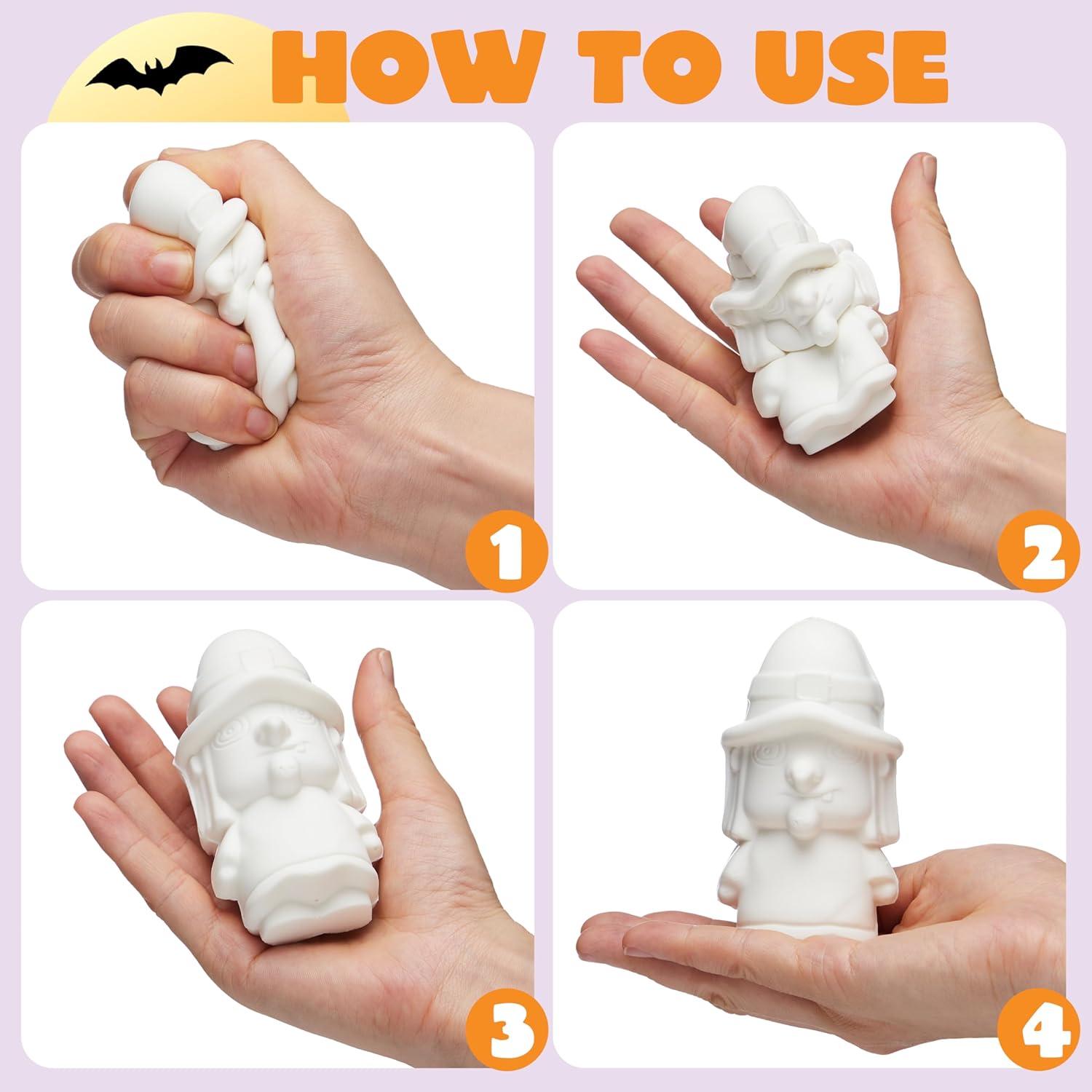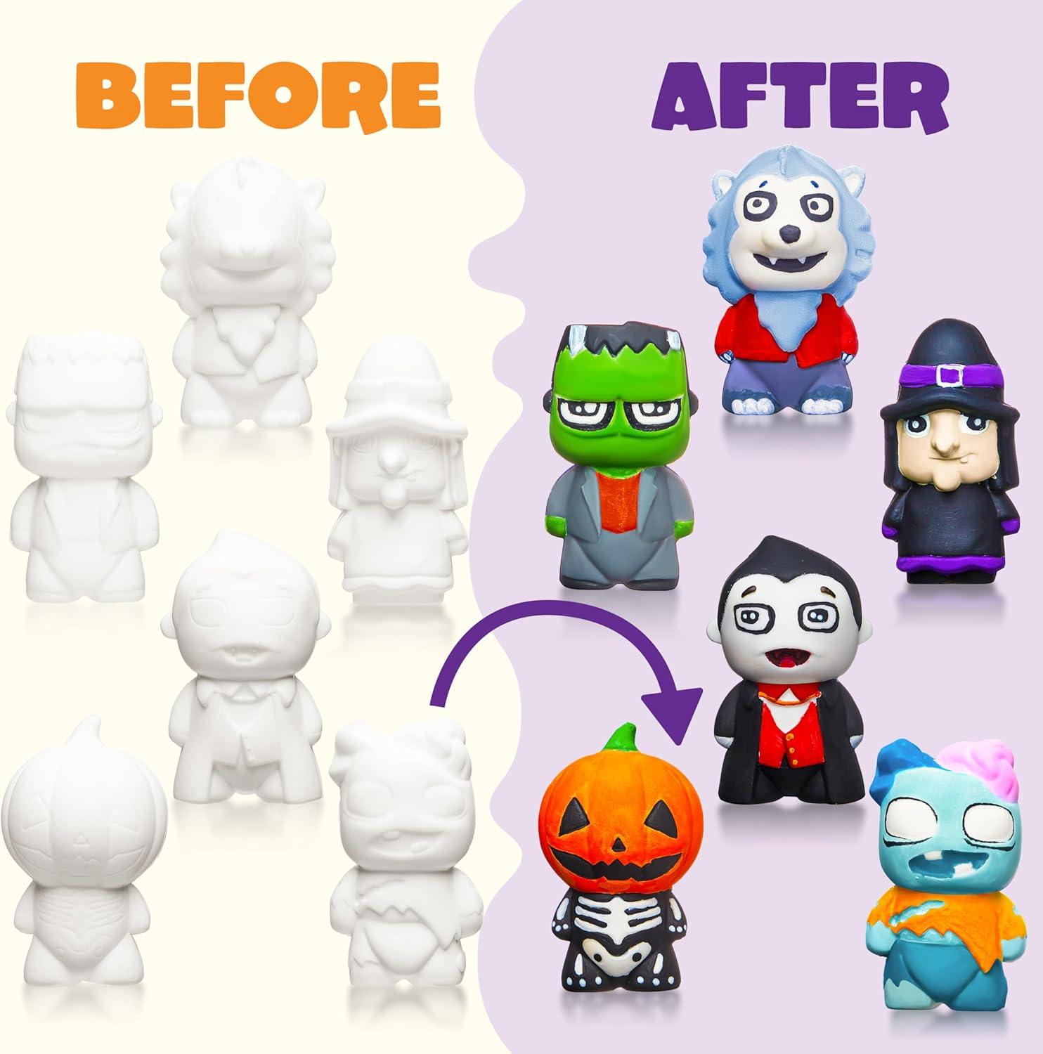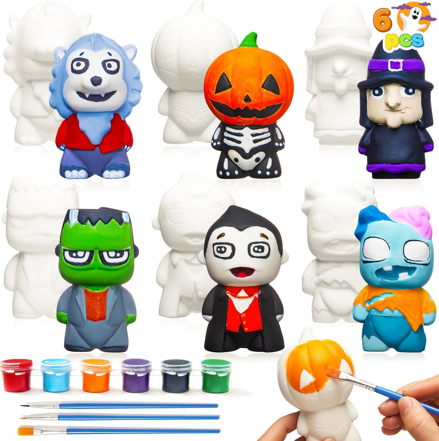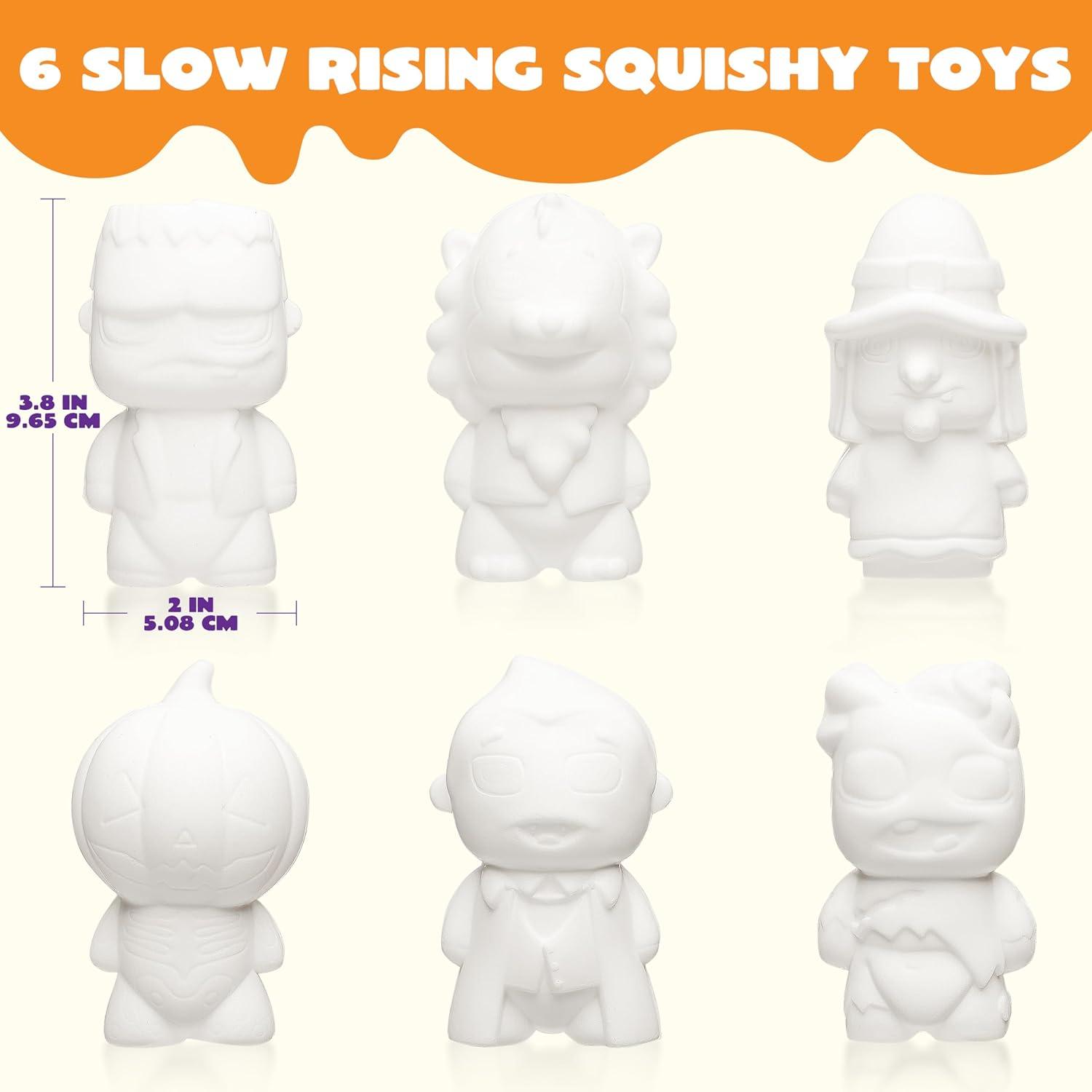 SUPER VALUE PACK. Our coloring Halloween squishy toys come in 6 squishy toys in 6 colors paints, and 3 paintbrushes. Decorate & color your own Halloween squishy toys.