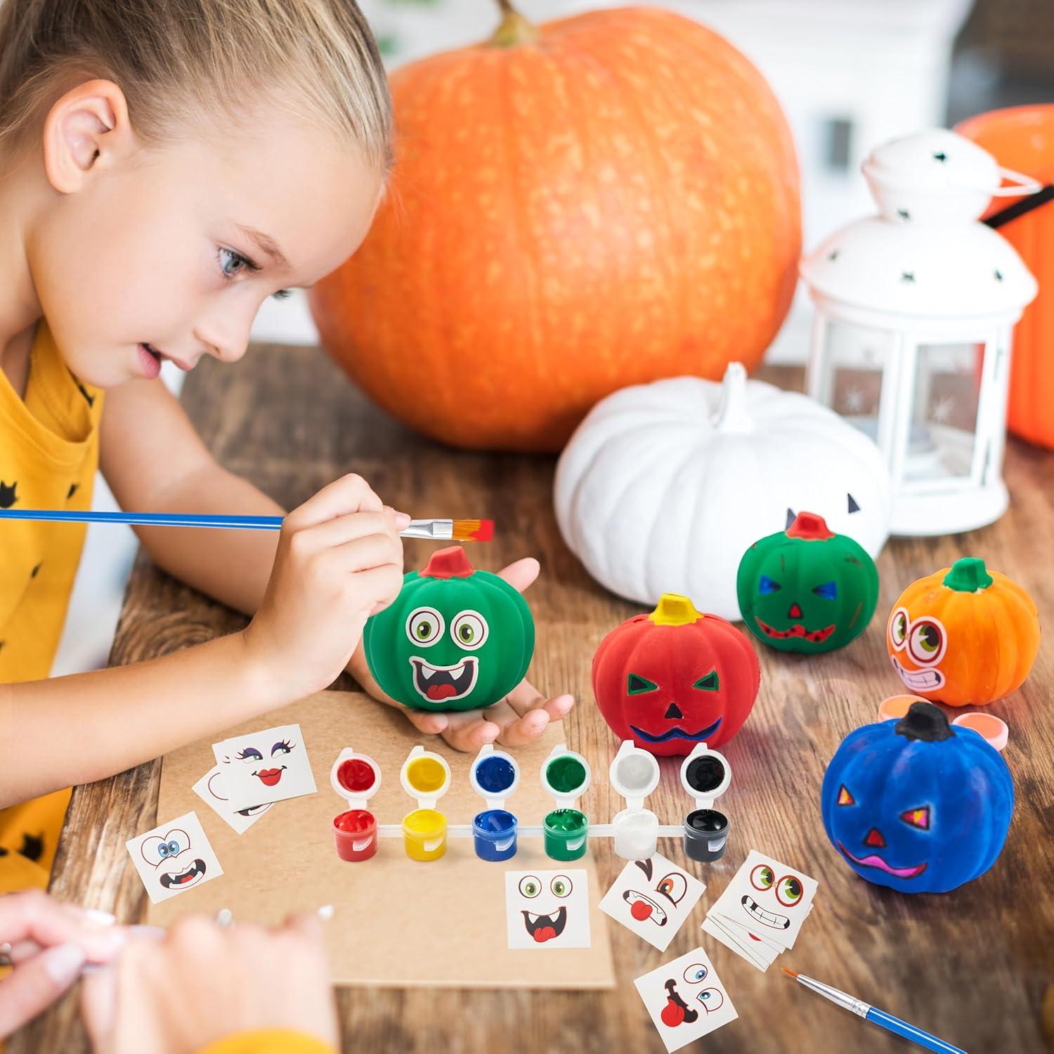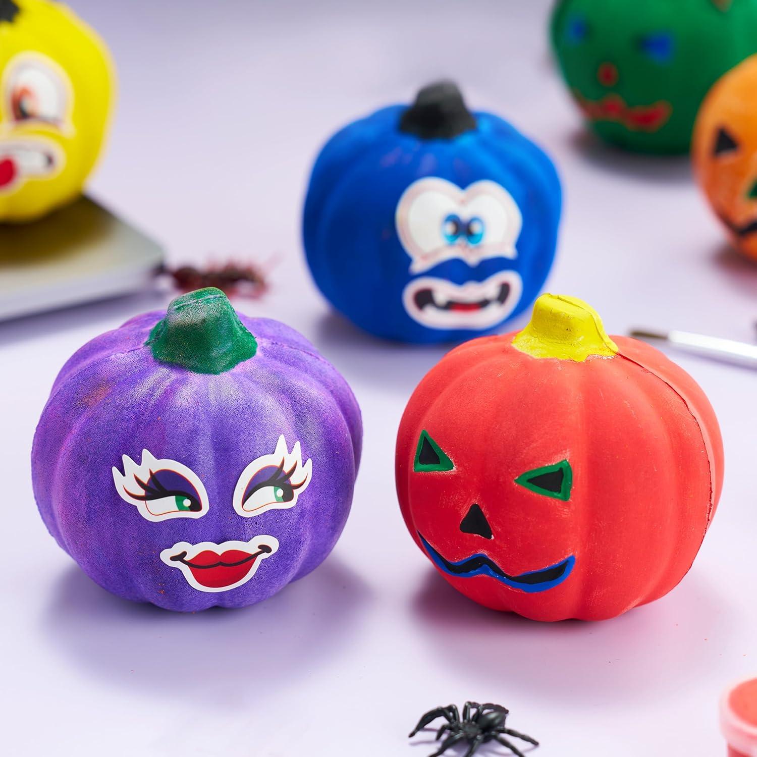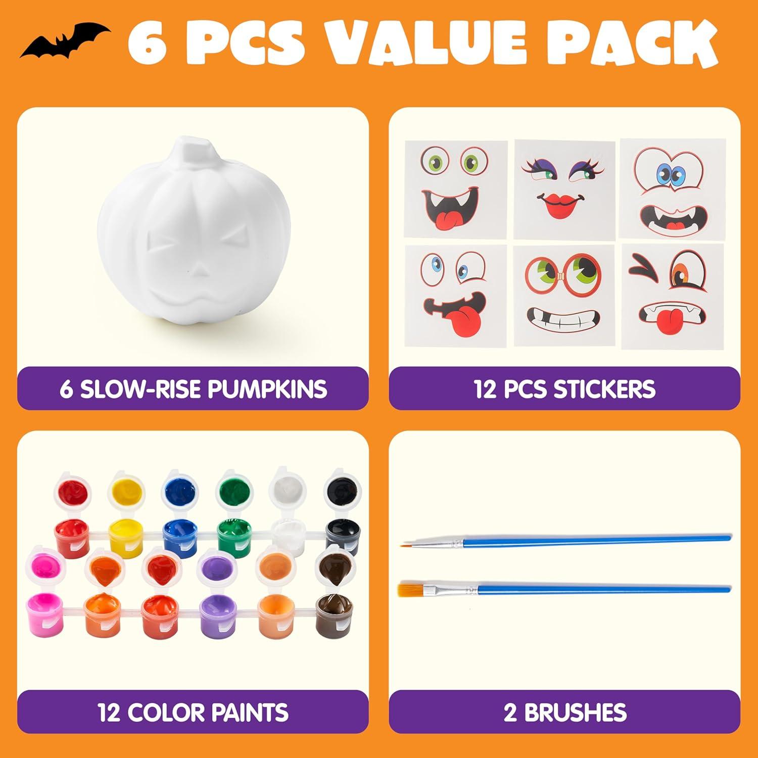 Package Includes: 6 Slow-Rise Foam Pumpkins, 12 Stickers, 12 Paints, 2 Brushes. Everything you need for a pumpkin painting kit! Decorate pumpkins with vibrant colors, playful stickers, or mix both for more fun Halloween arts and crafts for kids.