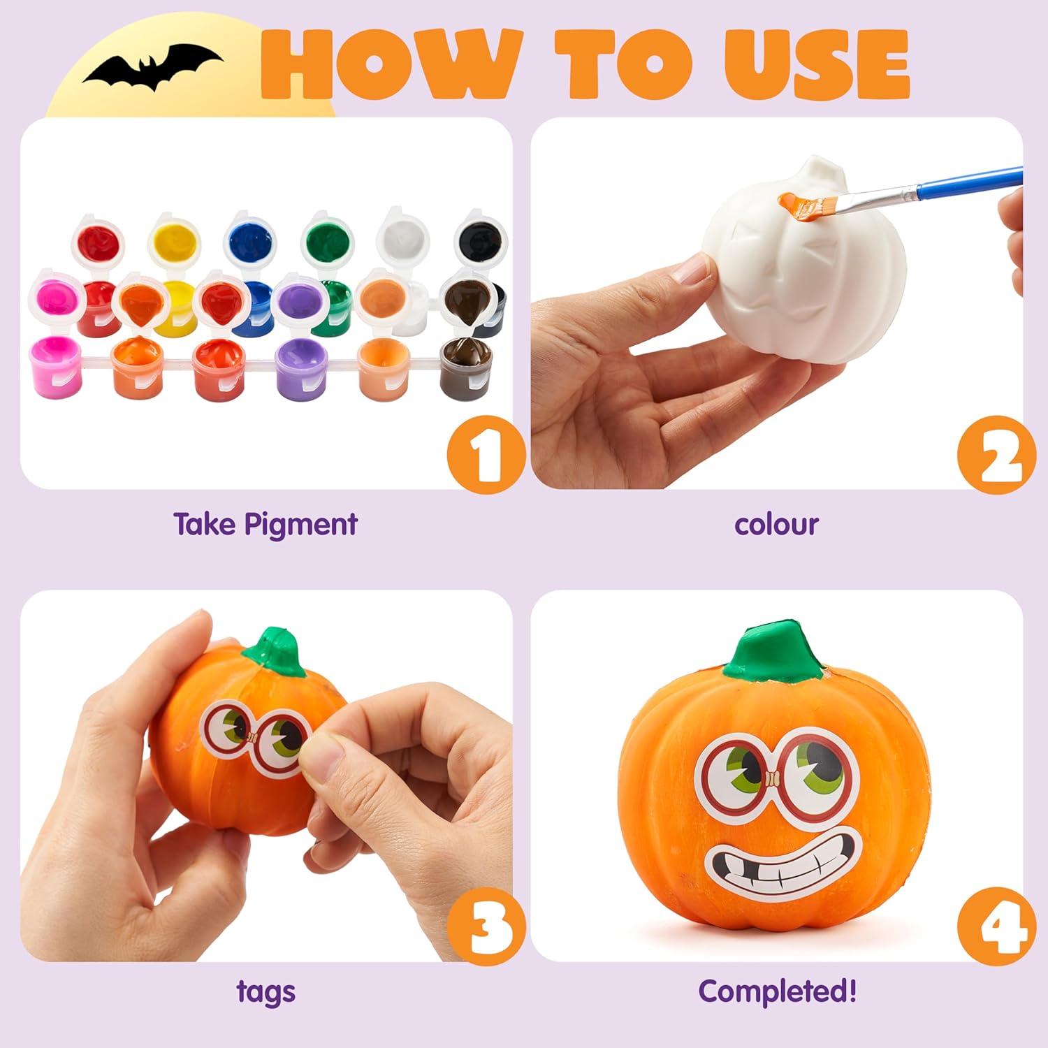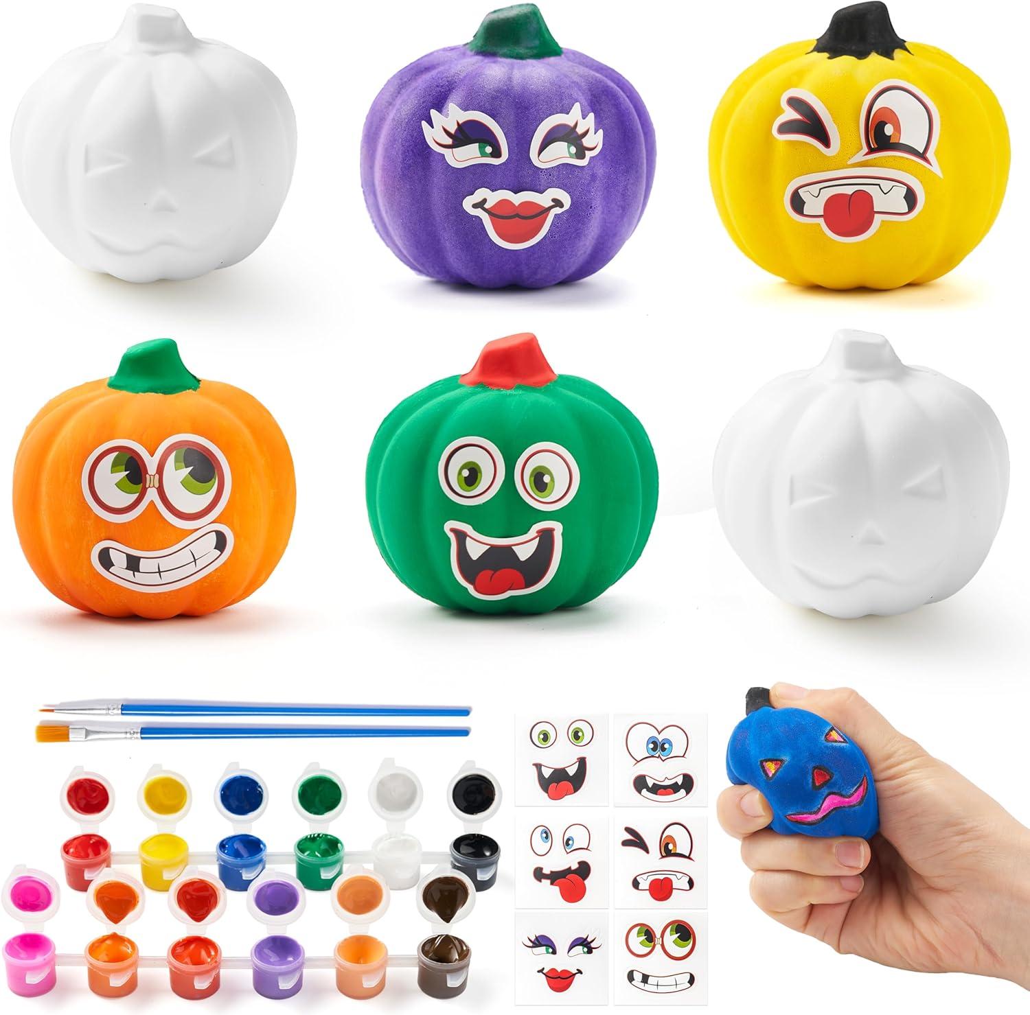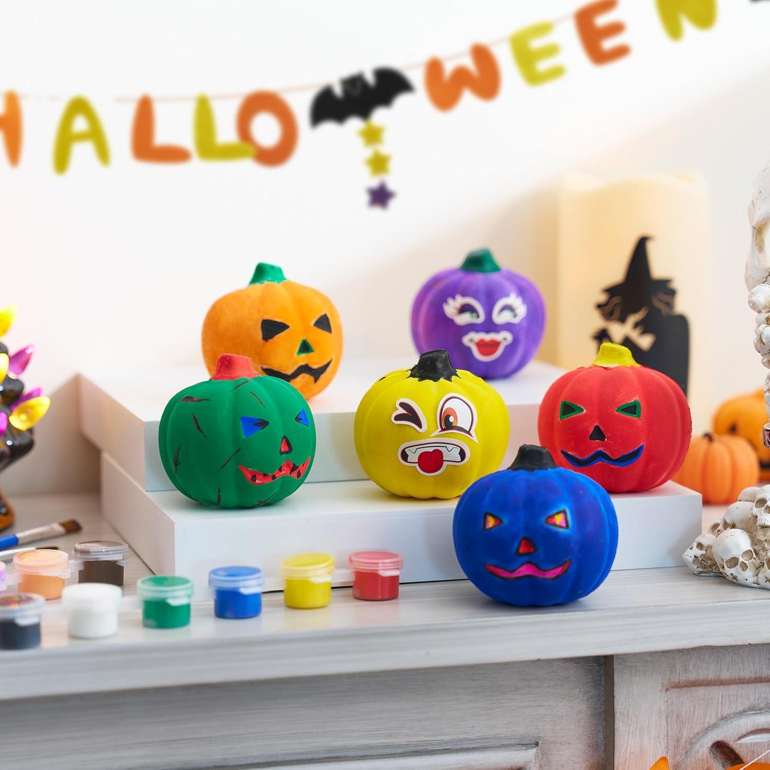 Package Includes: 6 Slow-Rise Foam Pumpkins, 12 Stickers, 12 Paints, 2 Brushes. Everything you need for a pumpkin painting kit! Decorate pumpkins with vibrant colors, playful stickers, or mix both for more fun Halloween arts and crafts for kids.