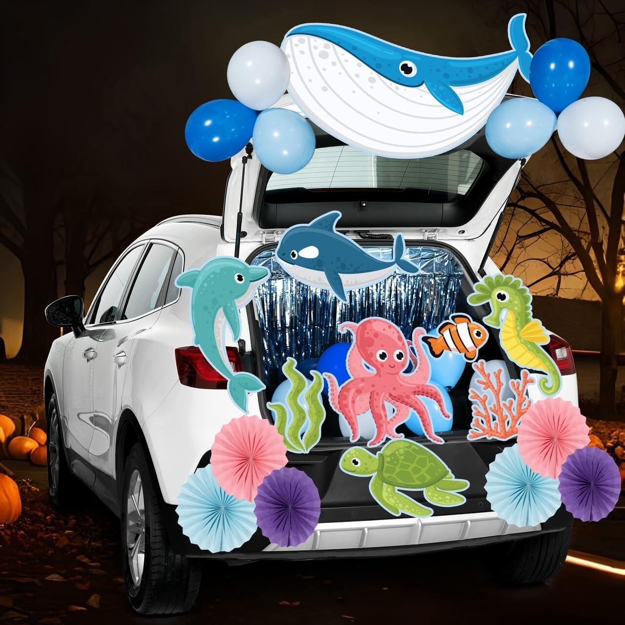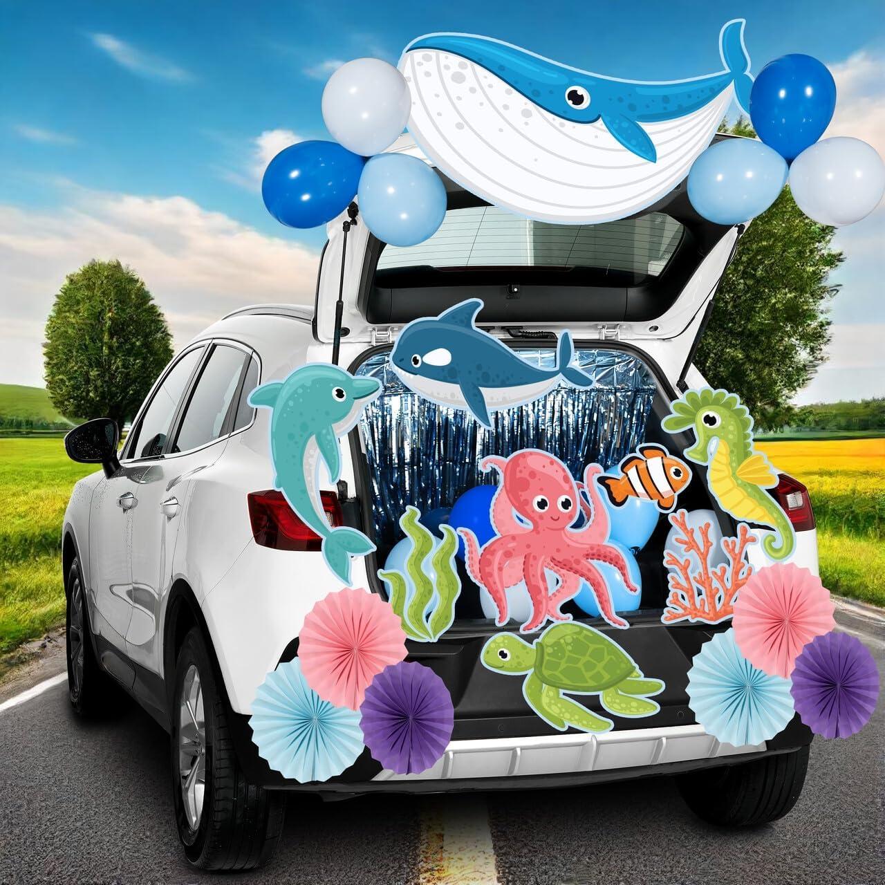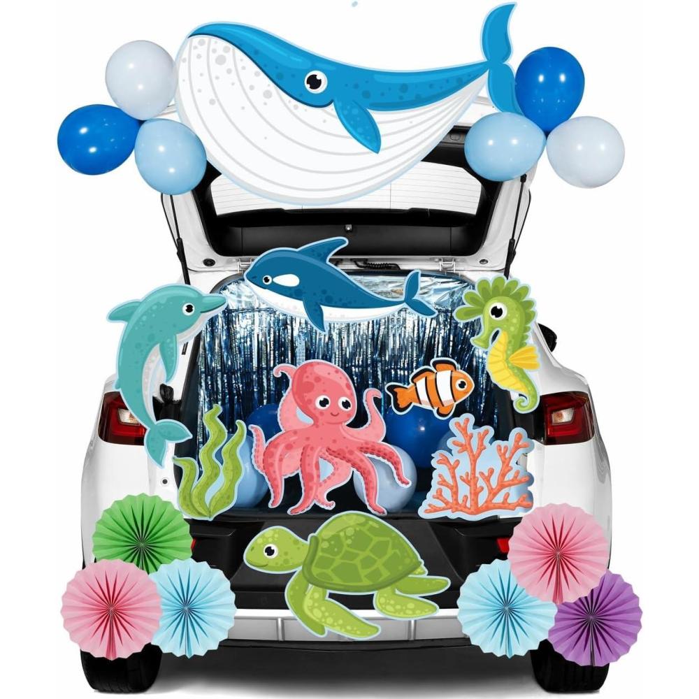SUPER VALUE PACK: This kit has 76 pcs, including 9 cardboards (1 whale, 1 dolphin, 1 clownfish, 1 shark, 1 octopus, 1 seahorse, 1 turtle, 1 coral, 1 seaweed), 12 balloons (3 blue colors, 4 of each color), 1 blue metal tassel (108.3″*27.6″), 6 paper fan flowers (2 light blue, 2 light purple, 2 light pink, 12″), 48 traceless adhesive stickers, giving you a perfect shark set to decorate your car with. This is a great value pack that will help you create a unique Halloween decoration for your car.