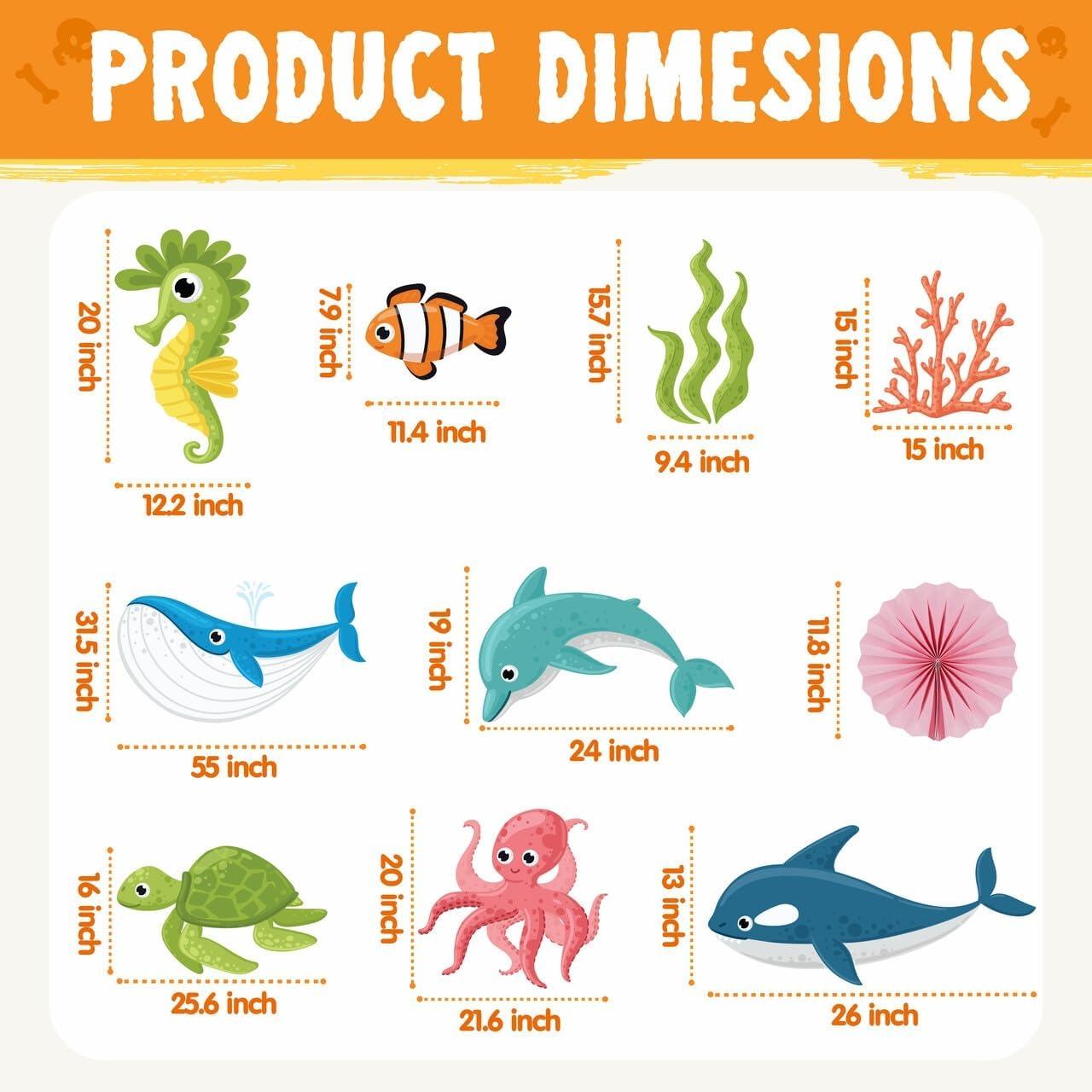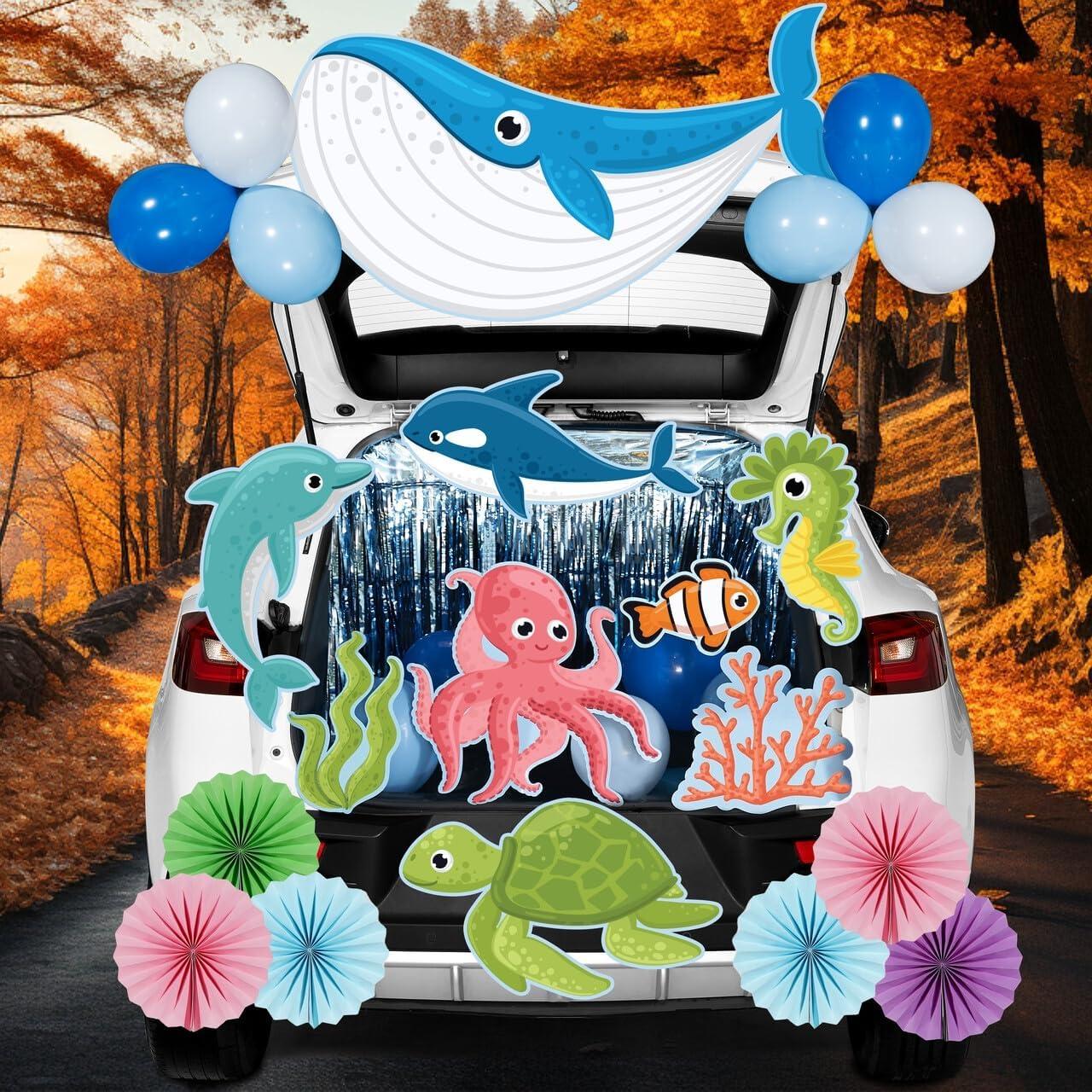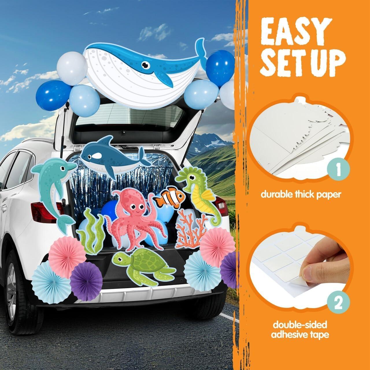 SUPER VALUE PACK: This kit has 76 pcs, including 9 cardboards (1 whale, 1 dolphin, 1 clownfish, 1 shark, 1 octopus, 1 seahorse, 1 turtle, 1 coral, 1 seaweed), 12 balloons (3 blue colors, 4 of each color), 1 blue metal tassel (108.3″*27.6″), 6 paper fan flowers (2 light blue, 2 light purple, 2 light pink, 12″), 48 traceless adhesive stickers, giving you a perfect shark set to decorate your car with. This is a great value pack that will help you create a unique Halloween decoration for your car.
