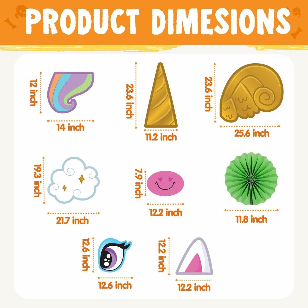 Super Value Pack: Get ready for a roaring good time with this super value pack! It includes 2 unicorn eye cards, 2 ear cards, 2 wings cards, 2 cloud cards, 1 nose card, 1 horn card, 1 bangs card, three 12″ diameter paper flowers (green, pink, blue), 12 latex balloons (purple, blue, orange, green 4 colors * 3 groups), 1 gold tassel, 5 colored paper tassel knots (1 each of blue, pink, green, purple, and yellow), 48 traceless adhesive stickers (0.8”*1.2”), ensuring your celebration is truly unforgettable!