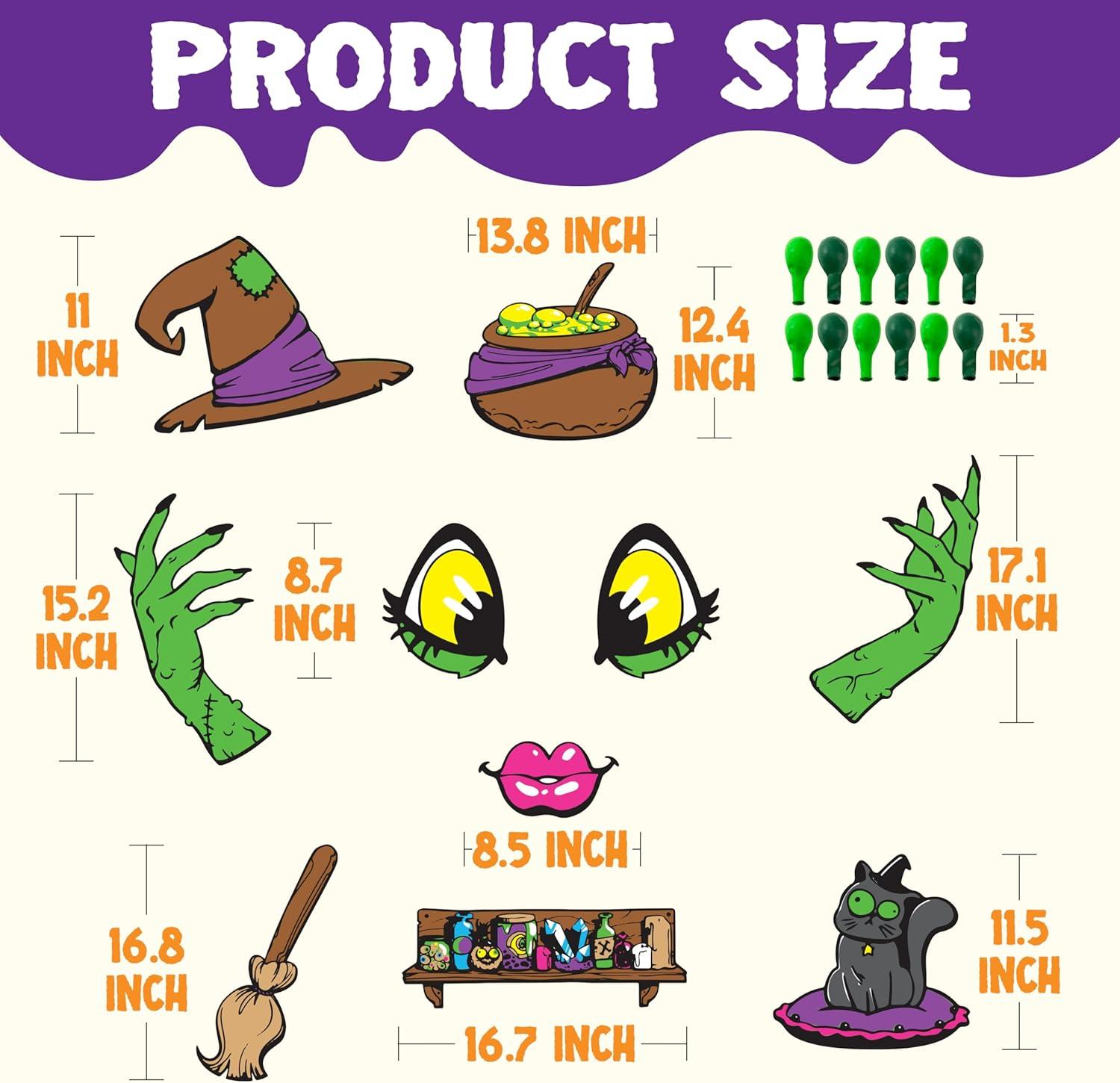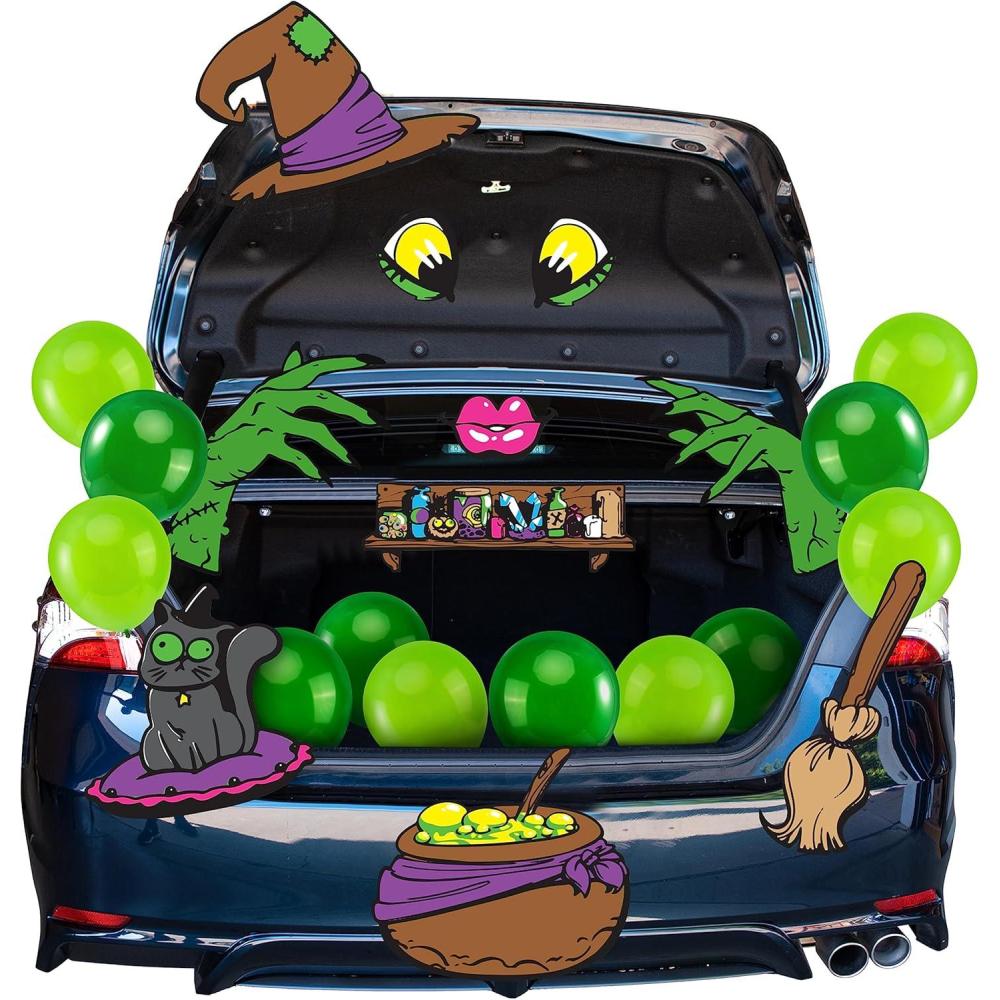 SUPER VALUE PACK: Trick out your car for Halloween and decorate it with our witch trunk or treat car decorations kit which includes 10 PVC (2 eyes-8.7″, a witch hat-11″, a broom-16.8”, a mouth-8.5″, a black cat-11.5″, a bracket-16.7″, a cauldron-13.8″*12.4″, left hand-15.2″, right hand-17.1″), 12 balloons (6 dark green, 6 light green), double-sided stickers.