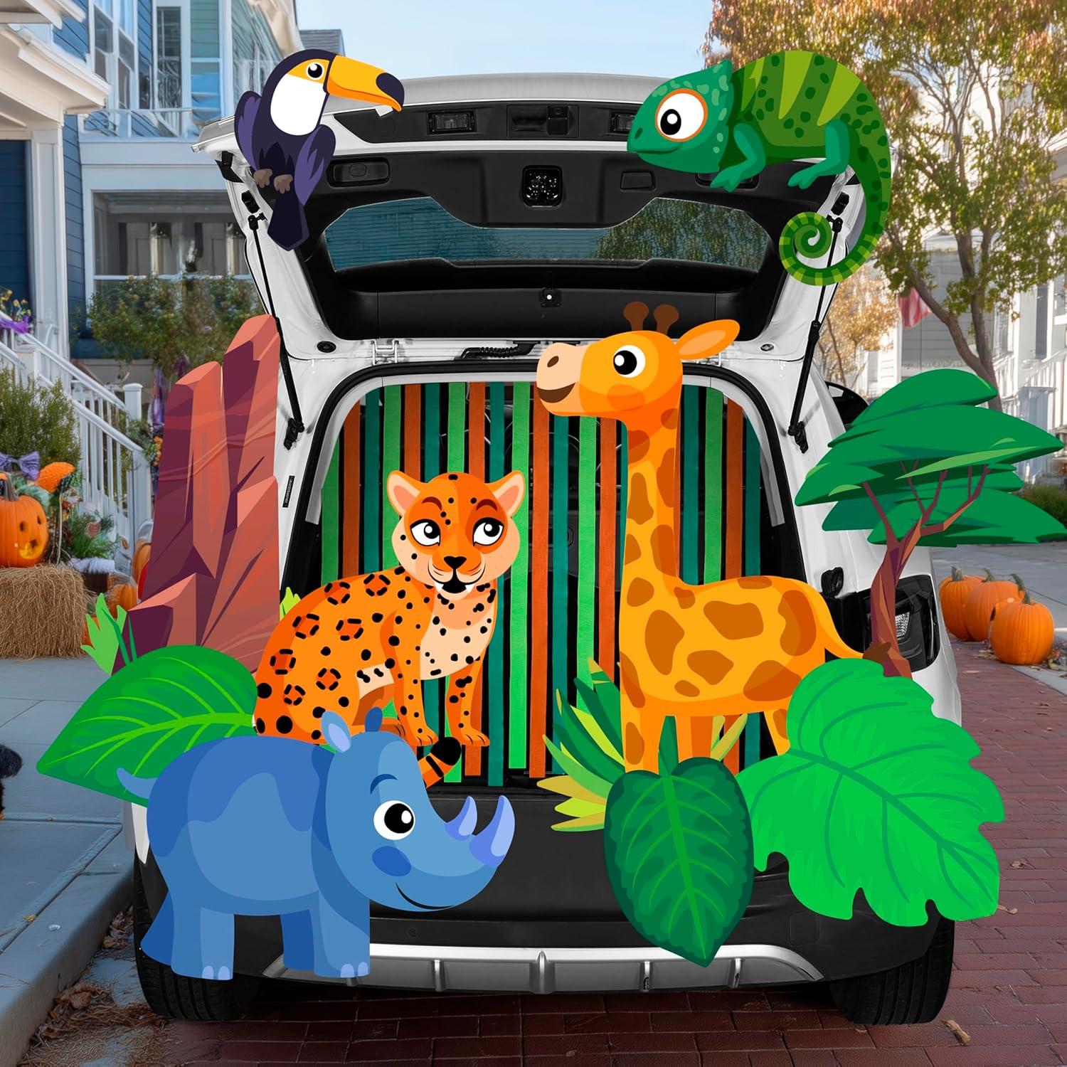 Jungle Theme: Dive into a wild wonderland! The kit includes towering jungle vines, exotic animal cutouts (think Rhinoceros, Giraffe, Parrot!), and leafy backdrops . Ideal for jungle trunk or treat car decorations kit lovers.