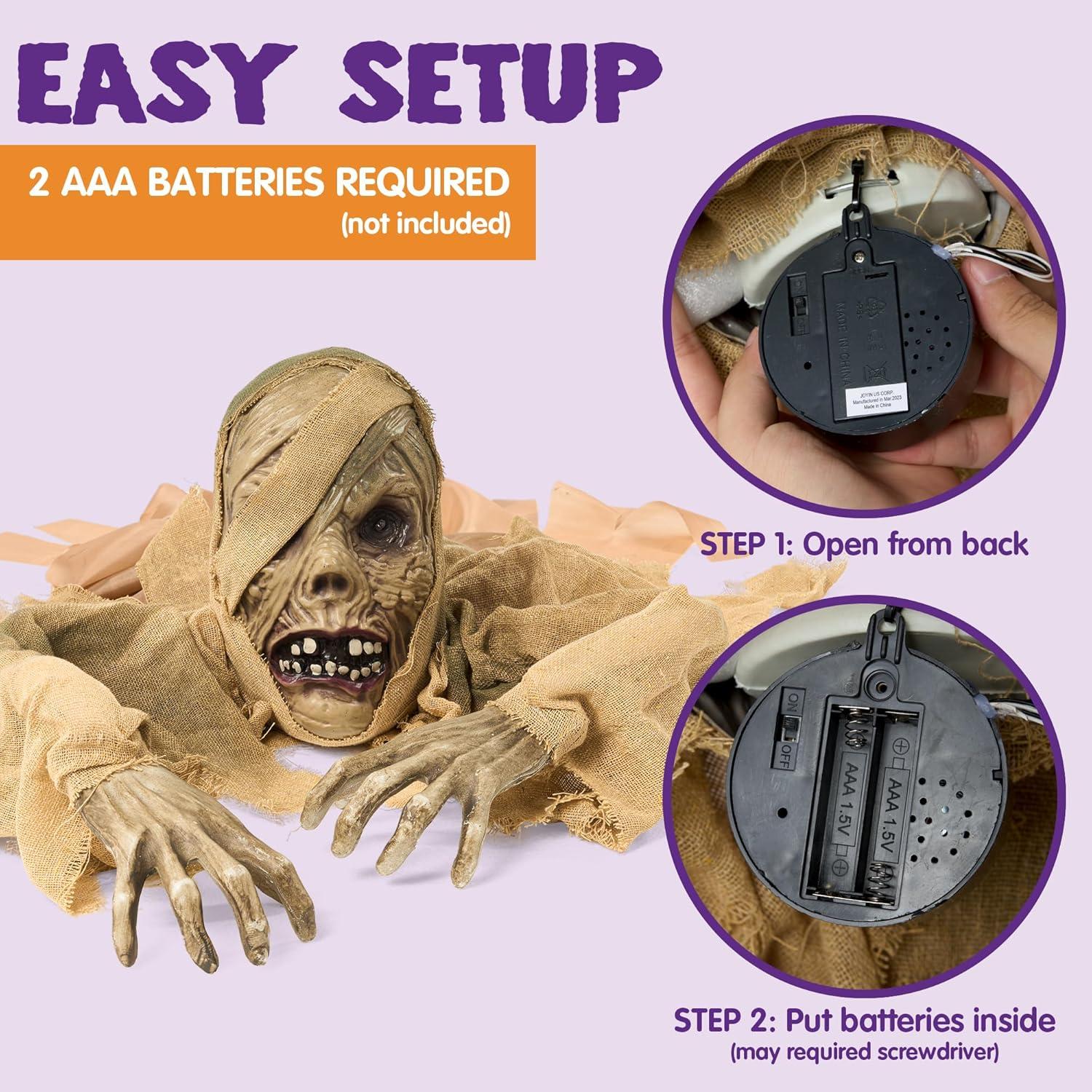 Sound activated: the zombie groundbreaker is equipped with a sound sensor that will activate the scary lights in its eyes, and he would make moaning noises when it detects sound within 30 inches, so it's recommended that it can be placed at doorways or stairs where is easy to make noise. 2 AAA batteries required (not included)