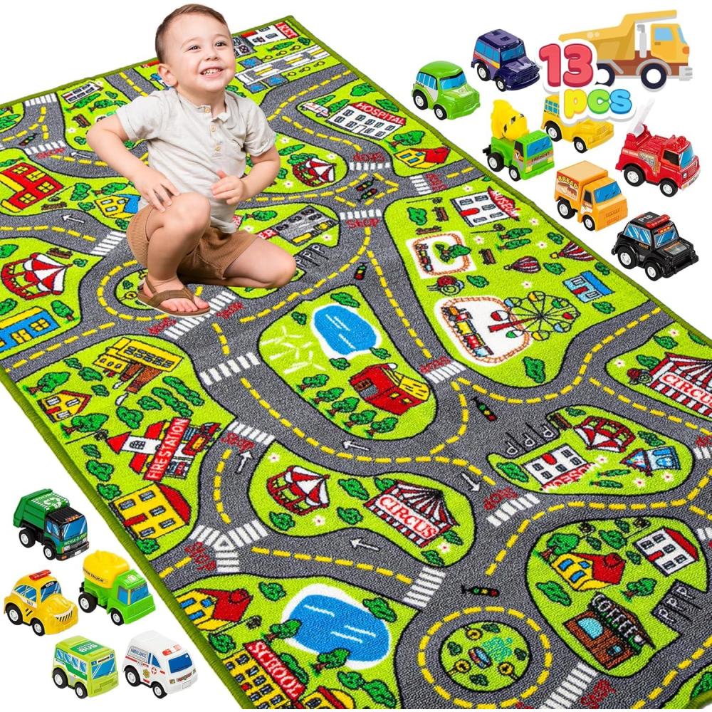 COMPREHENSIVE SET. Playmat City Life Carpet Playmat includes 58.5″ x 31.5″ carpet playmat and 12 pieces friction-powered cars, fire truck, police car, transport truck, school bus, ambulance, garbage truck, shuttle, and more. This City Rug includes a Hospital, a School, an Airport and so much more!