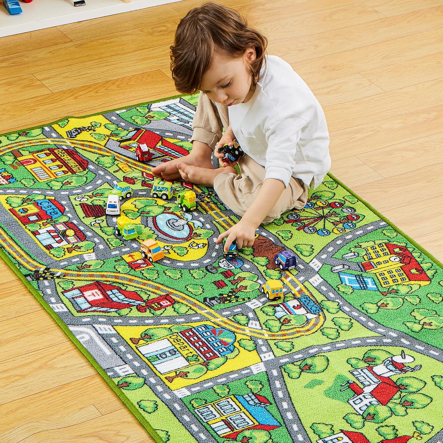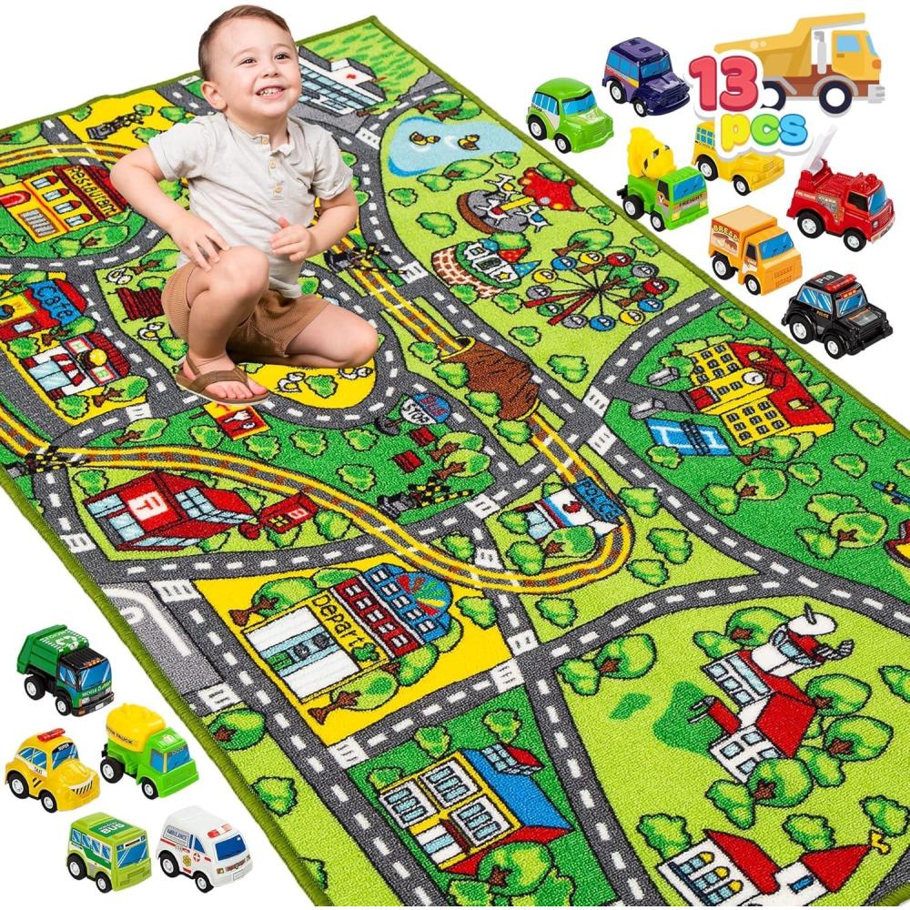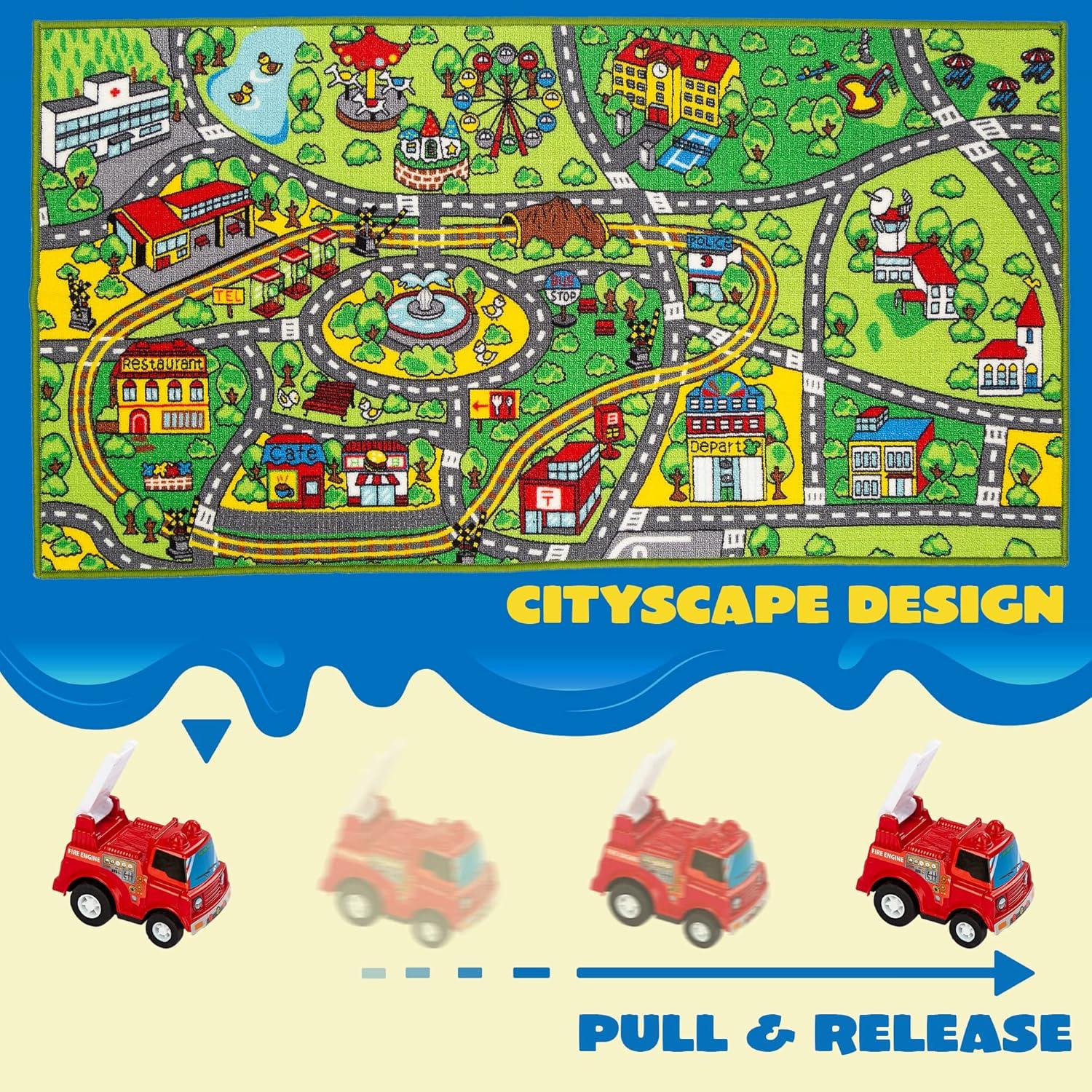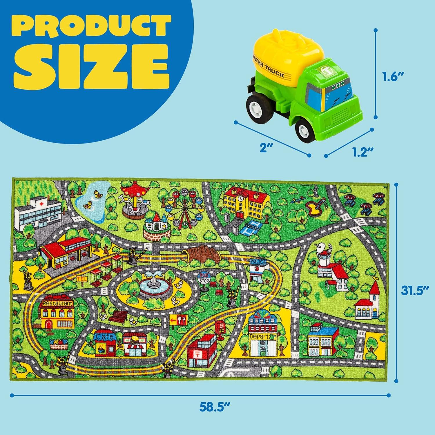 JOYIN Kids Play Rugs - 12 Pull-Back Vehicle Set - Durable Carpet Playmat Rug - City Pretend Play - Toddler Car Track Rug(Community view)