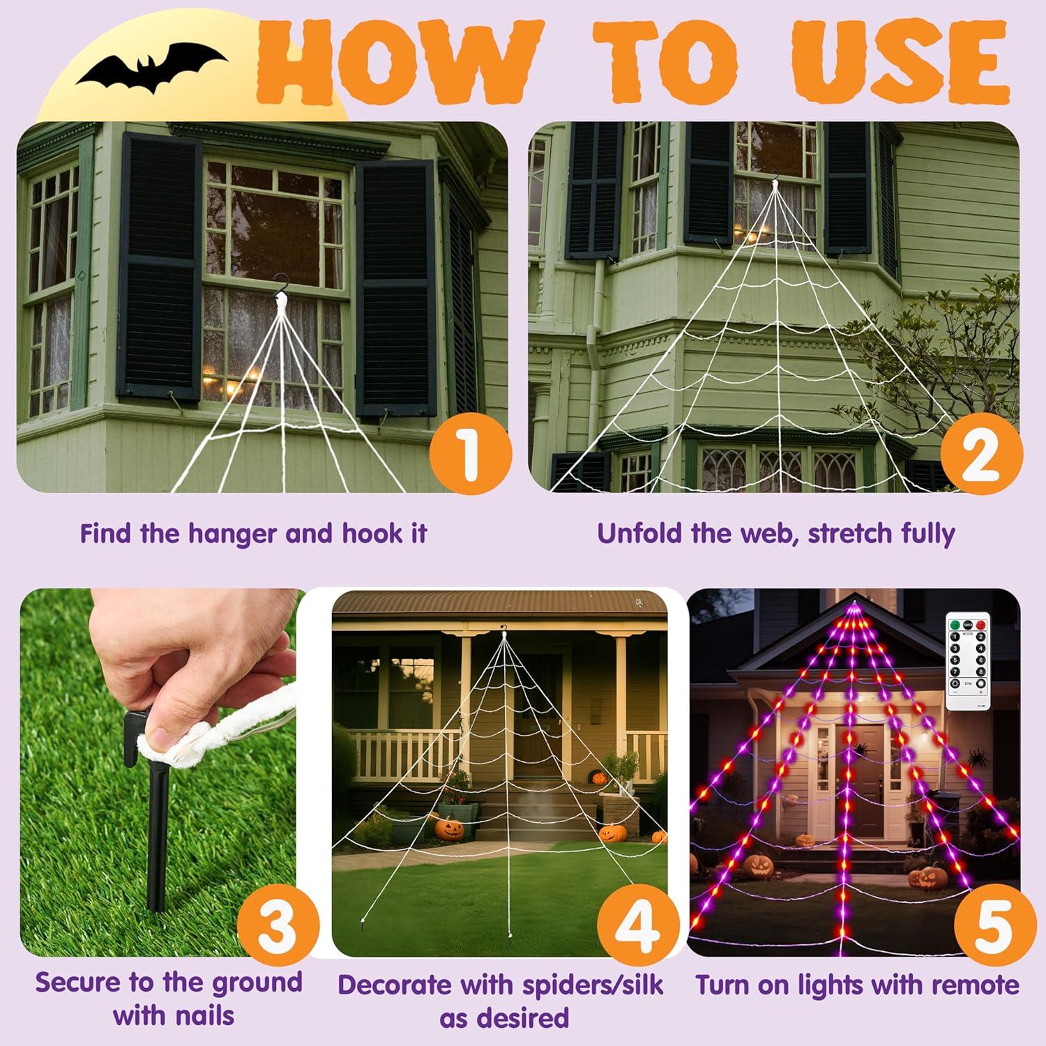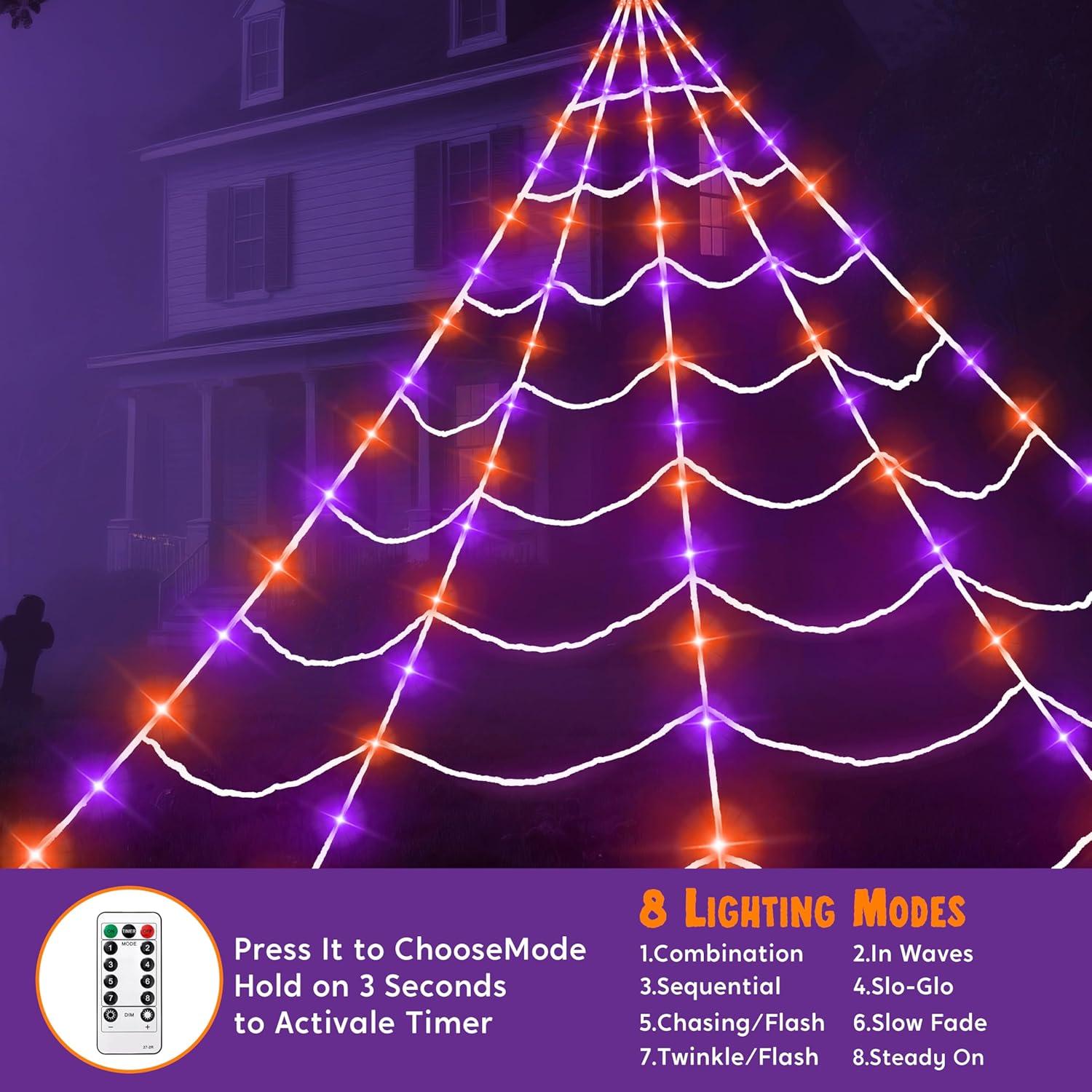 Unmissable Eye-Catching Prop: The glowing 250 purple and orange LEDs create a mesmerizing spider web decoration that dazzles trick-or-treaters and neighbors.
