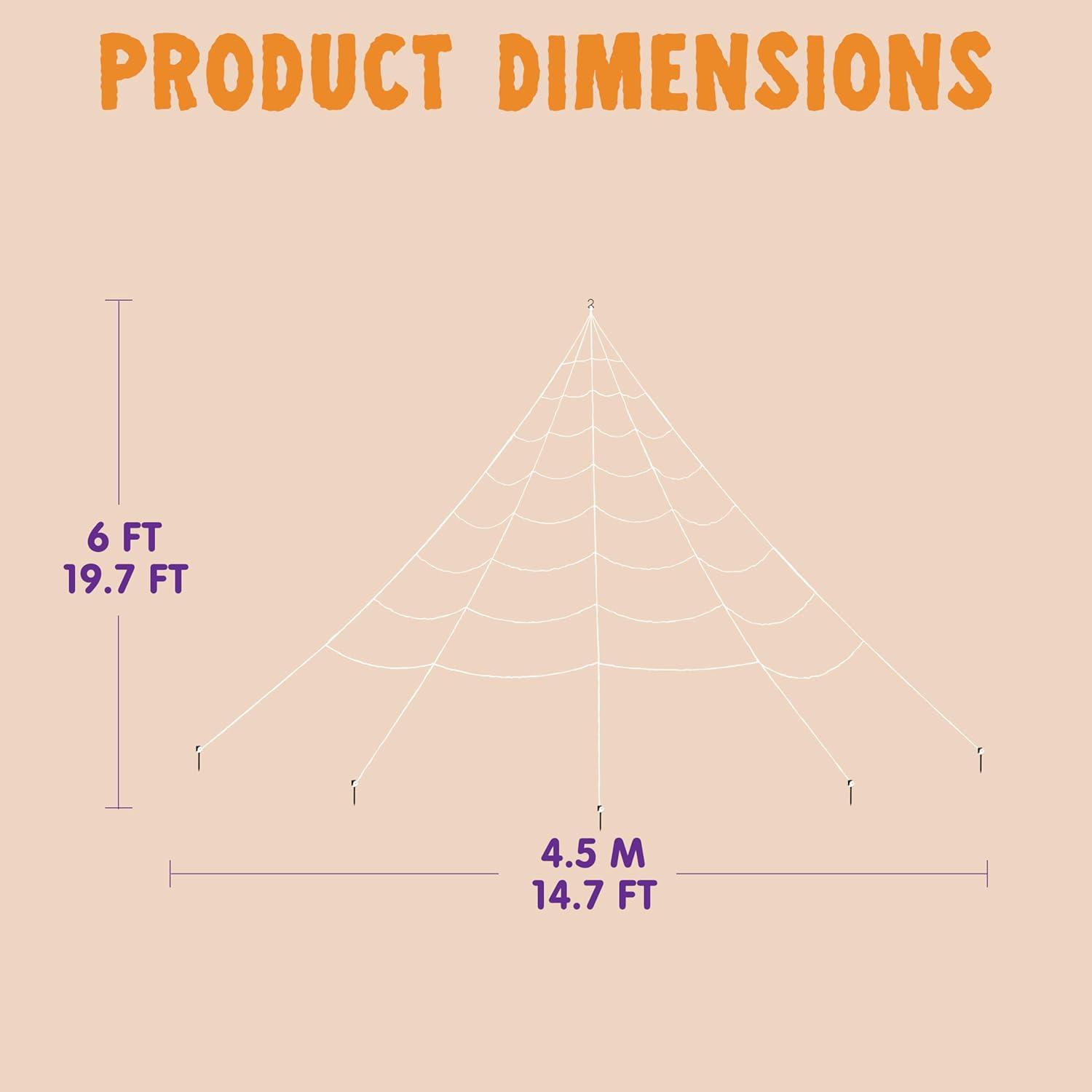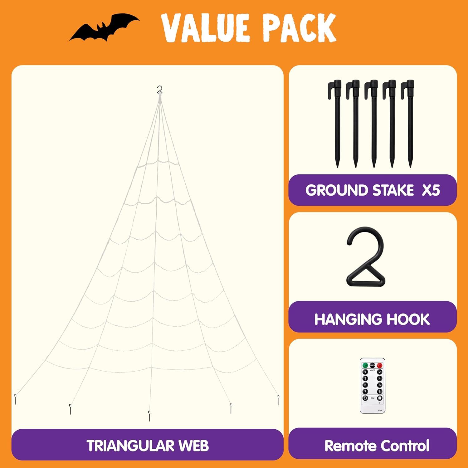 Comprehensive Halloween Set: Includes a 19.7 x 14.7 FT triangular spider web with 250 LED Lights, remote control, and 5 ground stakes for effortless installation. Ideal for lawns, fences, or walls as outdoor Halloween lights or indoor Halloween decorations.