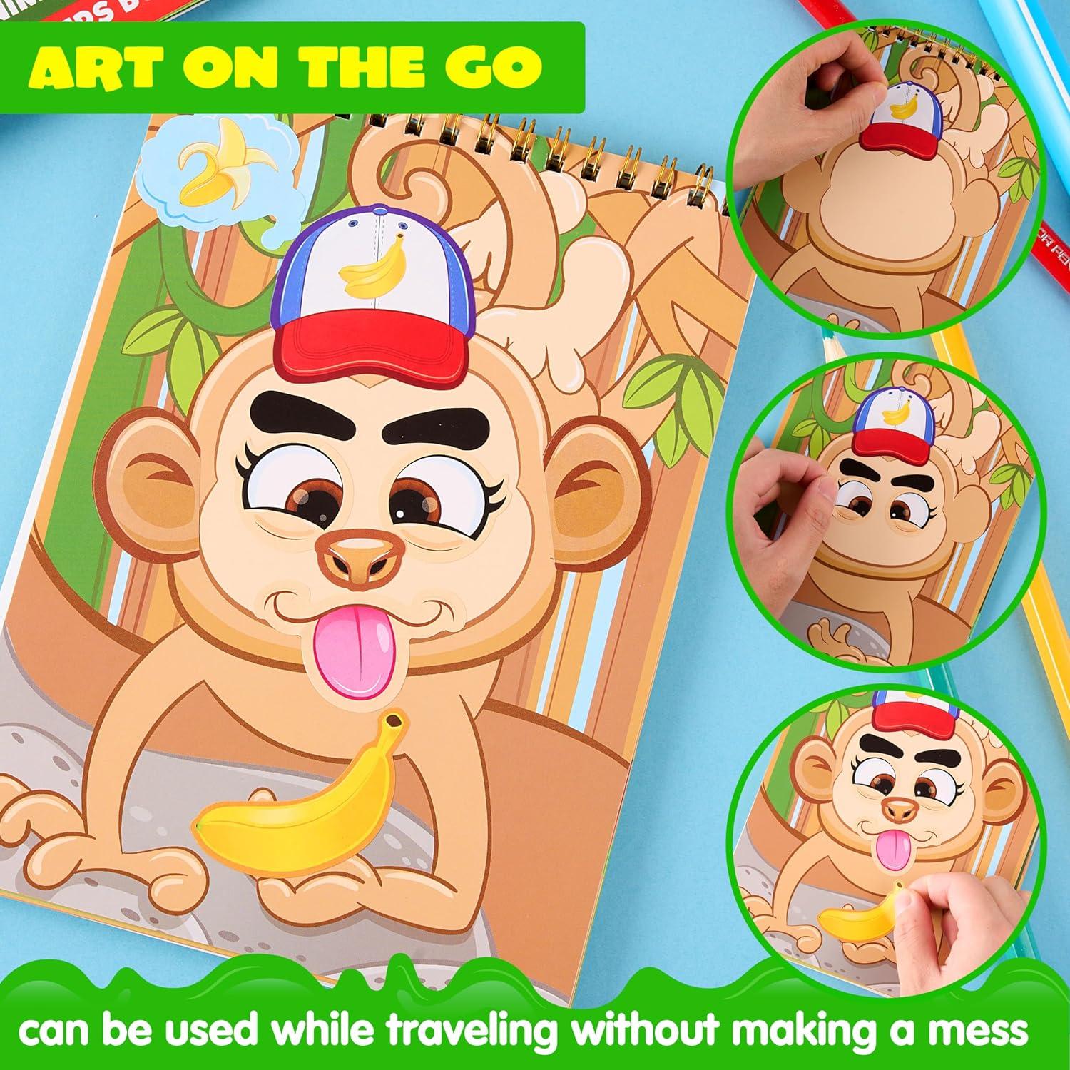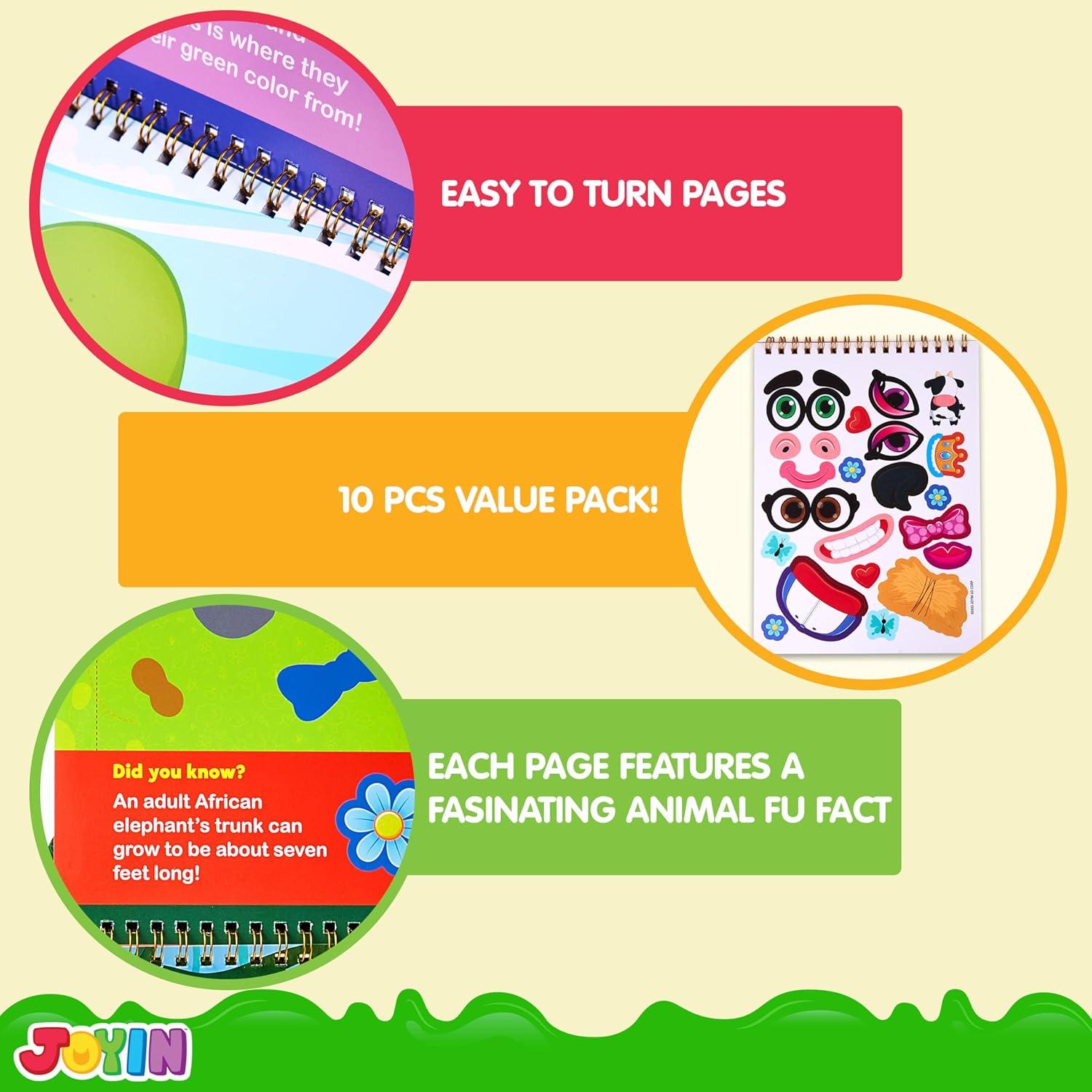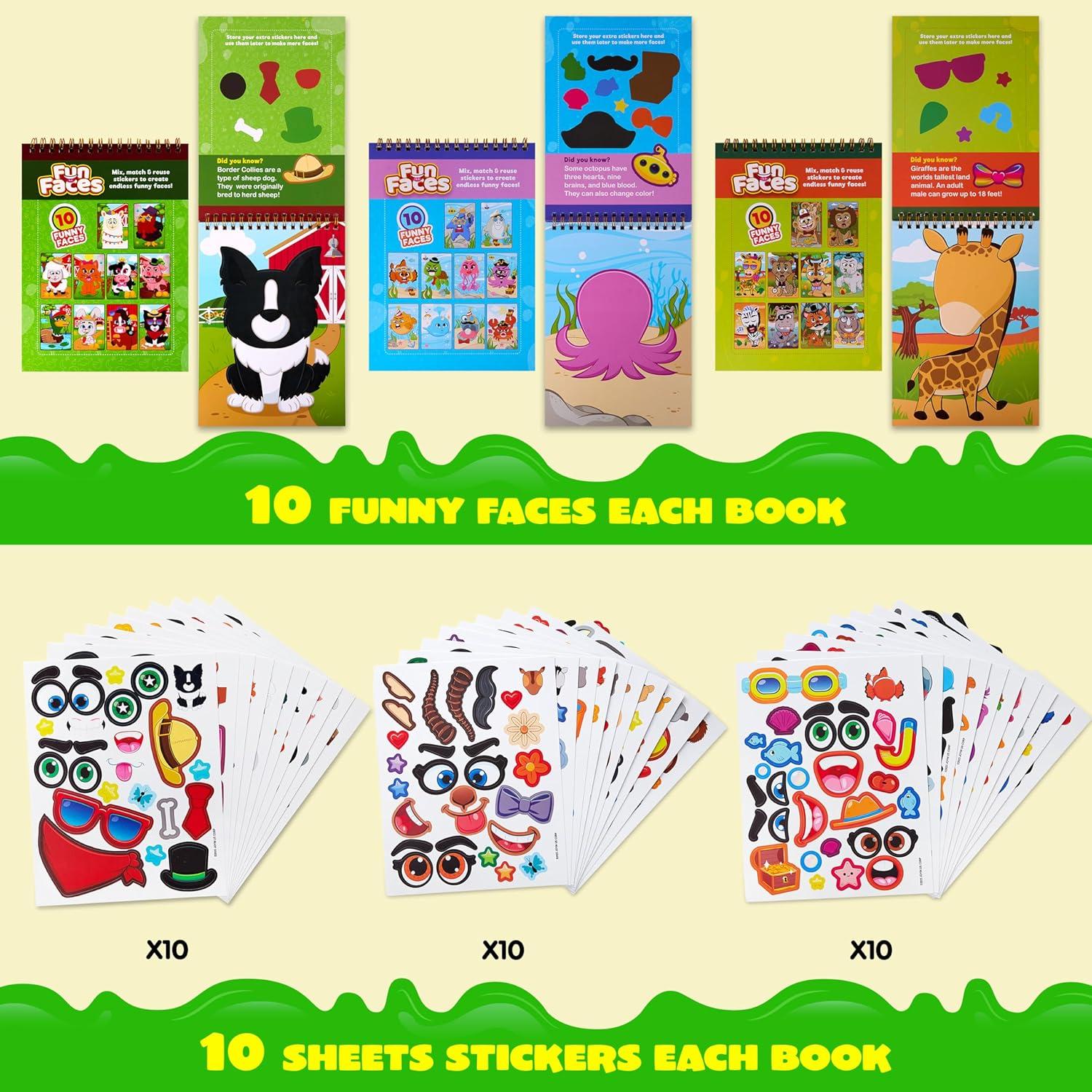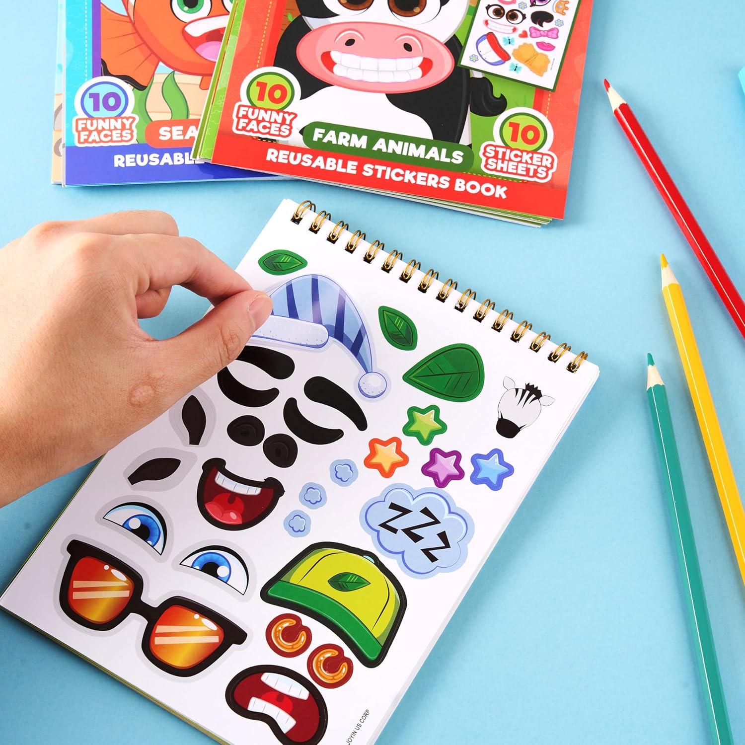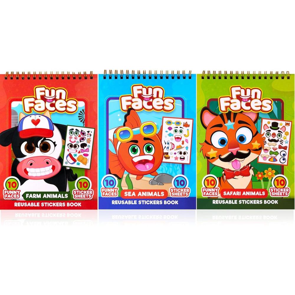 FUN ANIMAL THEMES: Set of 3 reusable travel activity Books (Safari, Farm, Sea).Animal faces to complete include cow, pig, lion, duck,monkey,cheetah,zebra,clownfish, and more REUSABLE STICKER BOOKS:Each with 10 faces and 10 sheets of reusable cling stickers, providing hours of creative fun for your child. TRAVEL-FRIENDLY AND EDUCATIONAL: Our Make a Face Book Set is easy for kids to use, making it a convenient and educational travel toy for kids. GREAT FOR ART AND IMAGINATION: Our reusable sticker books encourage creativity and imagination in kids, helping them develop their artistic skills and express themselves through play. PREFECT FOR GIFT:A great gift for kids, ages 2 to 6, for hands-on, screen-free play