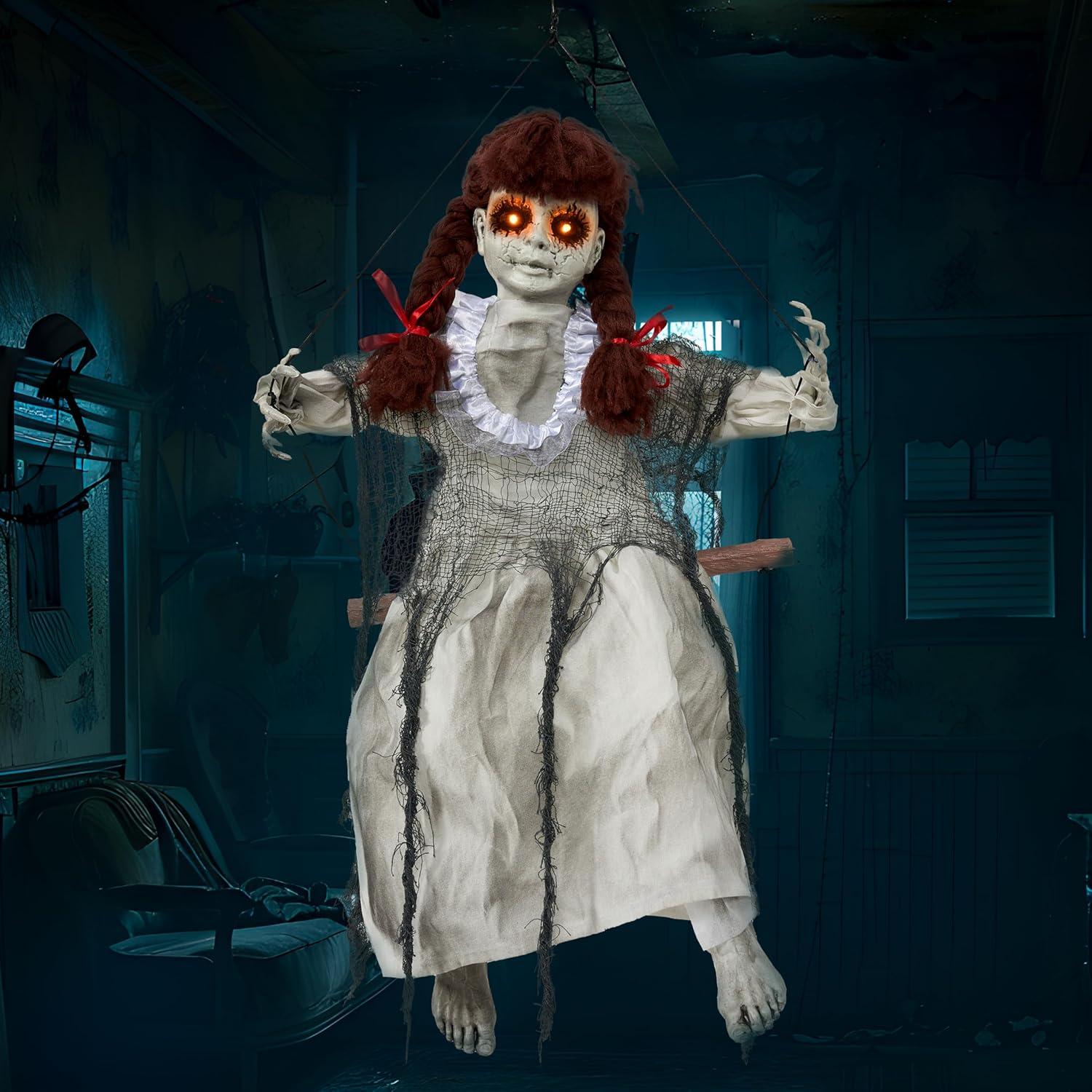 JOYIN Scary Halloween Decorations Outdoor, Halloween Hanging Scary Swing Girl Decorations Winging White Doll with Creepy Sound and Light Up Eyes Sound, Animatronics Hanging Decors Activated(Creepy Brown hair Girl)
