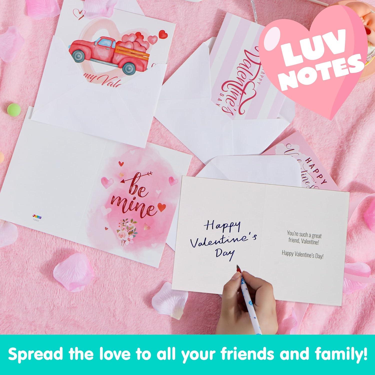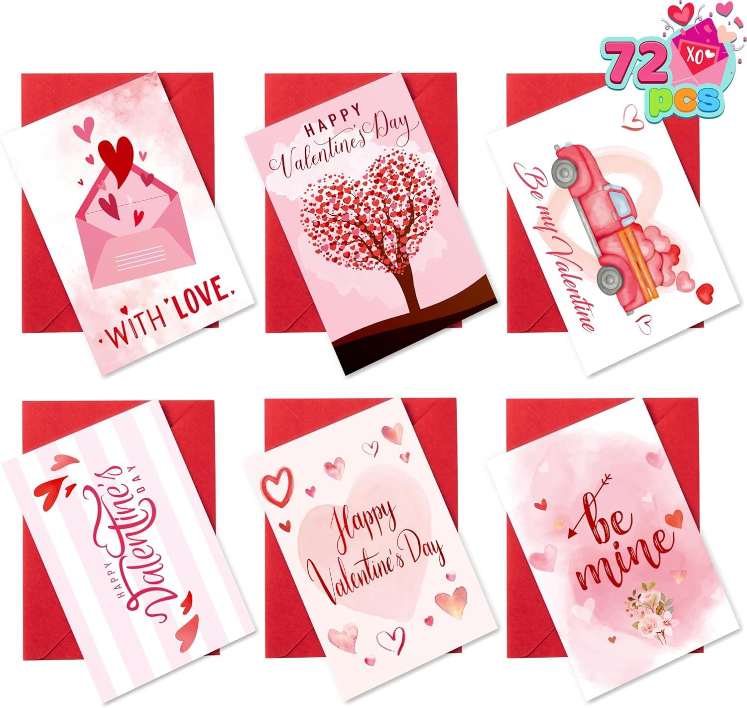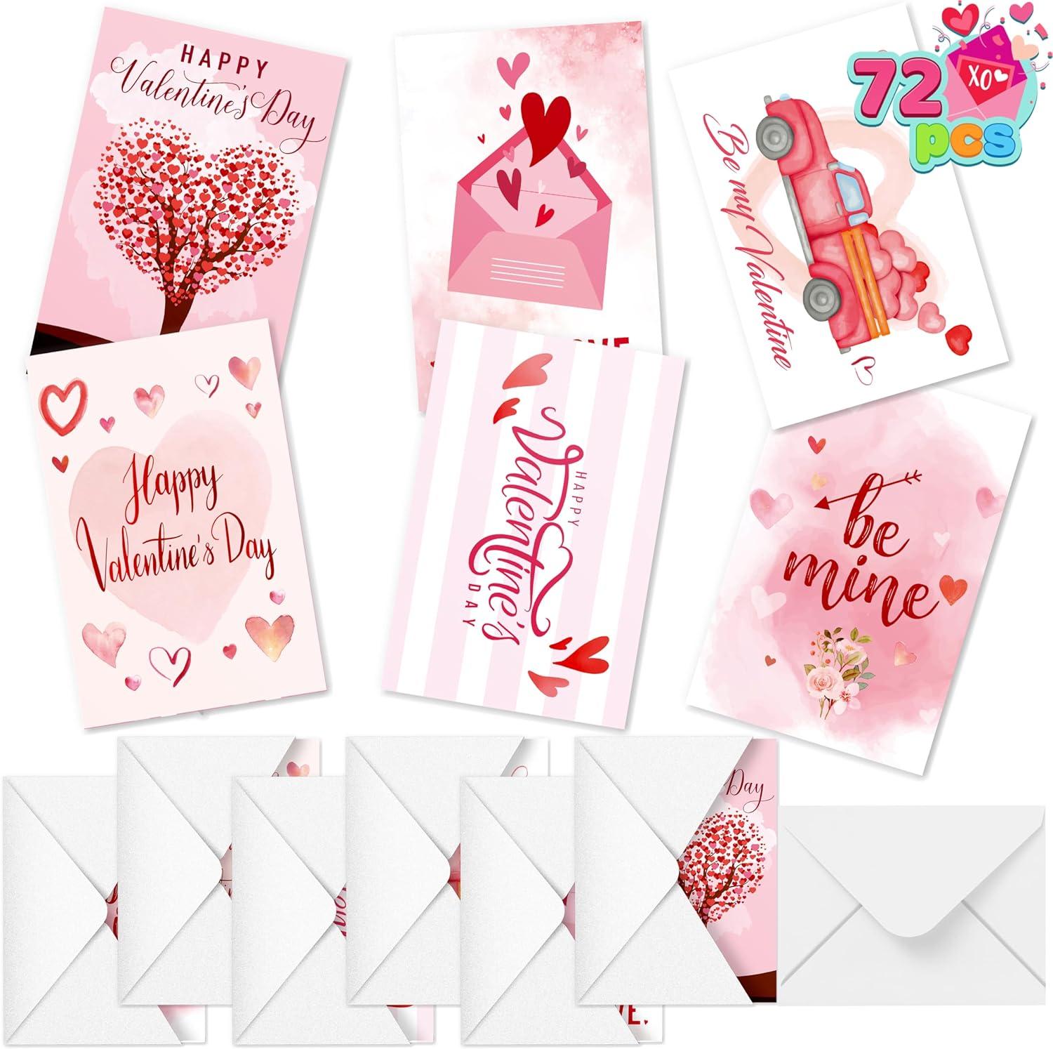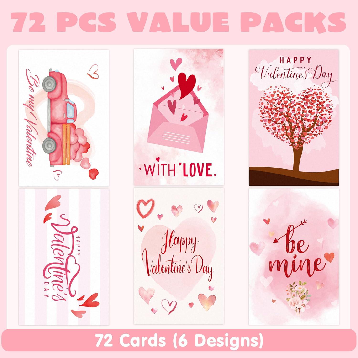 SUPER VALUE PACK. Our Valentine's Card includes 72 Pcs Hearts Day Light Pink Valentine's Day Greeting Cards. Our greeting cards with envelopes have 6 different designs. These measures 6.1 inches tall X 4inches width (after folded).