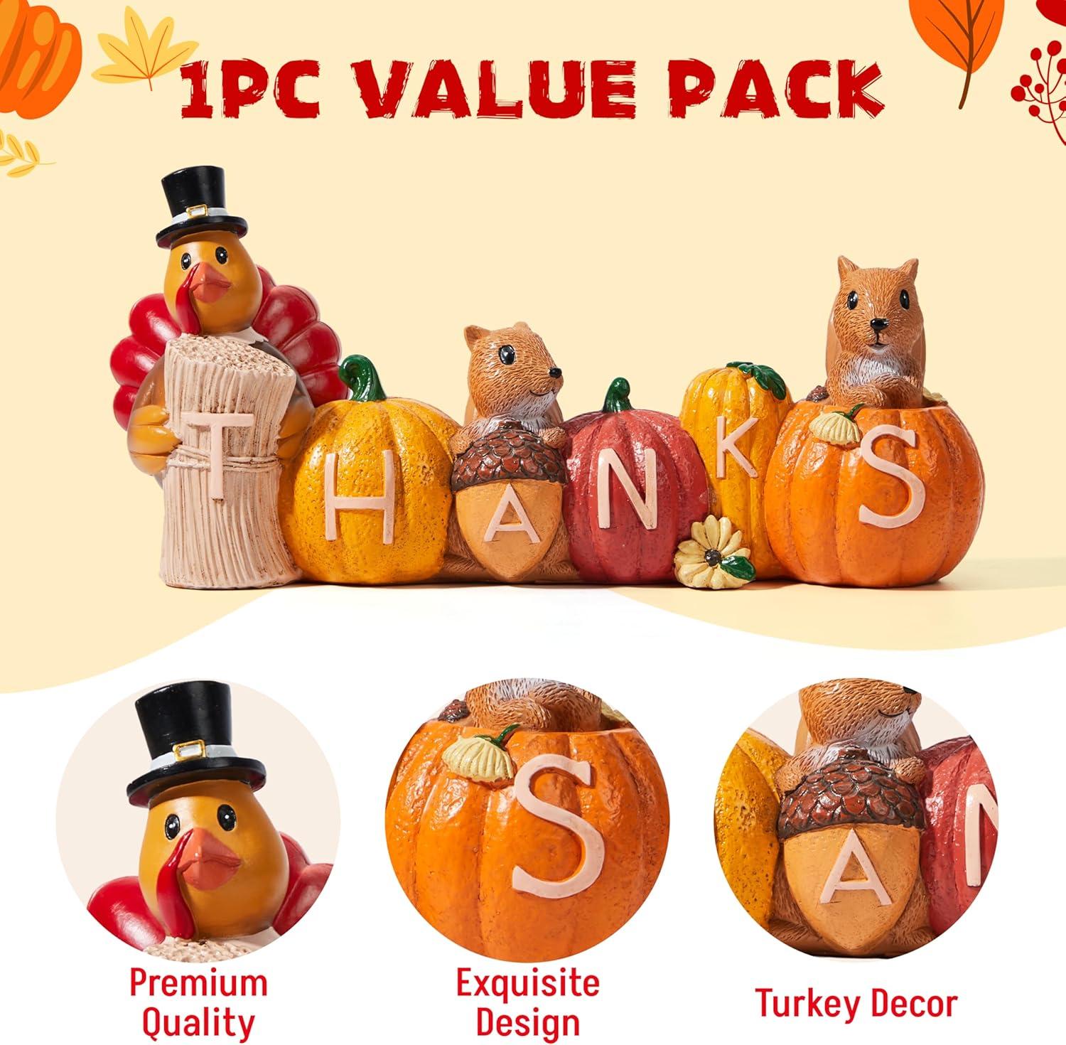 UNIQUE DESIGN. This set of seasonal home ornaments are made of resin and are hand-painted. Every pumpkin figurine has a distinct shape and is carved with one letter from “THANKS”. These resin decor figurines will give your guests some visual enjoyment for your Thanksgiving celebration. It is good at increasing the festive and warm atmosphere of the season.