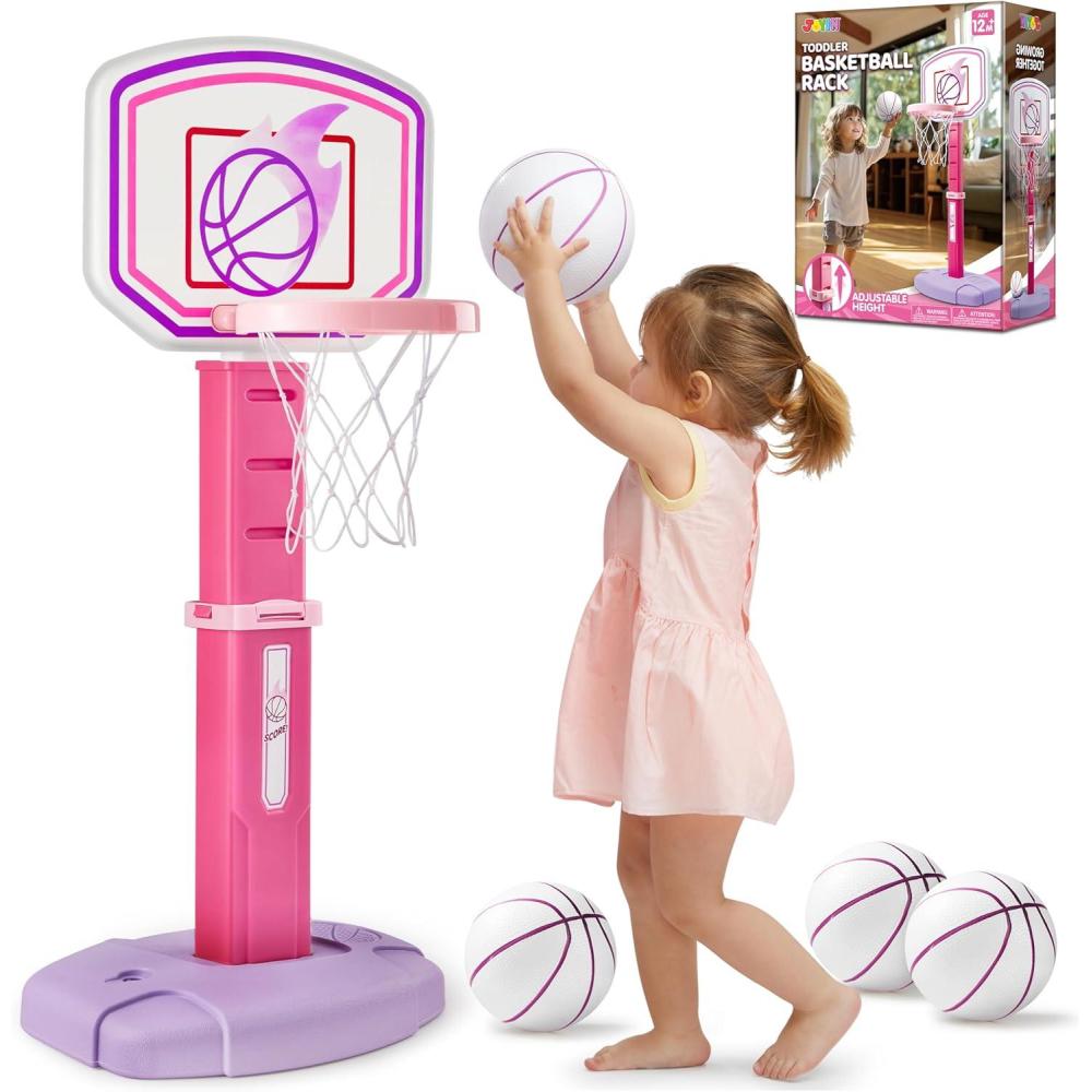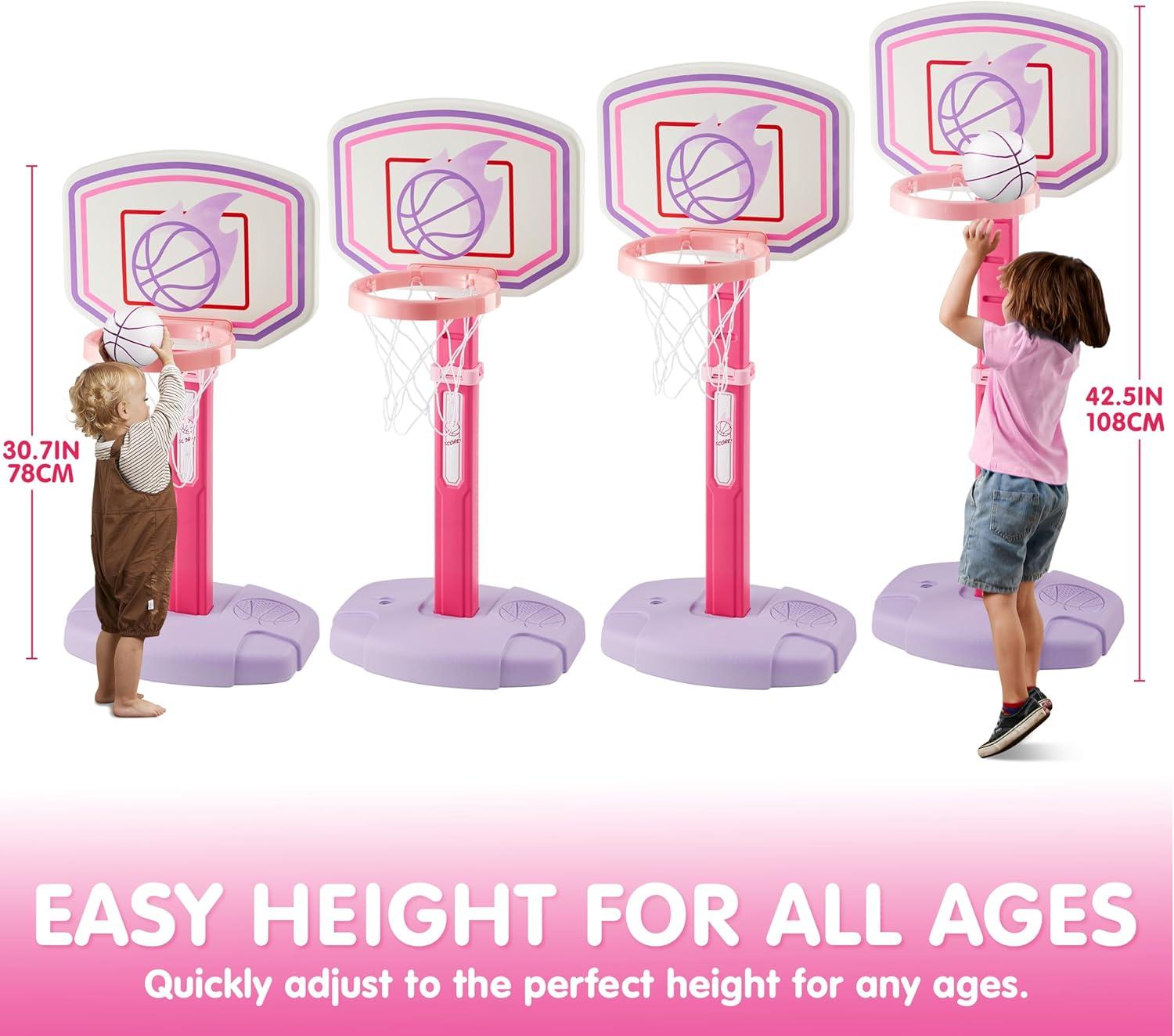 JOYIN Toddler Basketball Hoop Indoor, Adjustable Basketball Goal for Kids with 4 Balls, Game Toys for Playroom Pool Outdoor, Birthday Gift for Baby Boys Girls Age 1 2 3 4 - Air Pump Included(Pink and Purple)