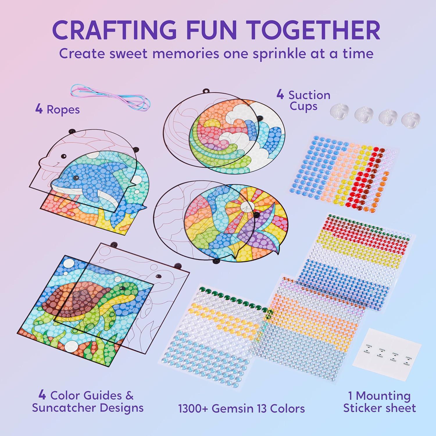 Complete Crafting Experience: Our craft kit includes everything needed for an immediate start. With 4 Suncatcher designs, 4 color guides, 3 Gem sticker sheeets, 6 window paint pens, 4 ropes, and 4 suction cups, your child can dive into the world of sparkling window art immediately