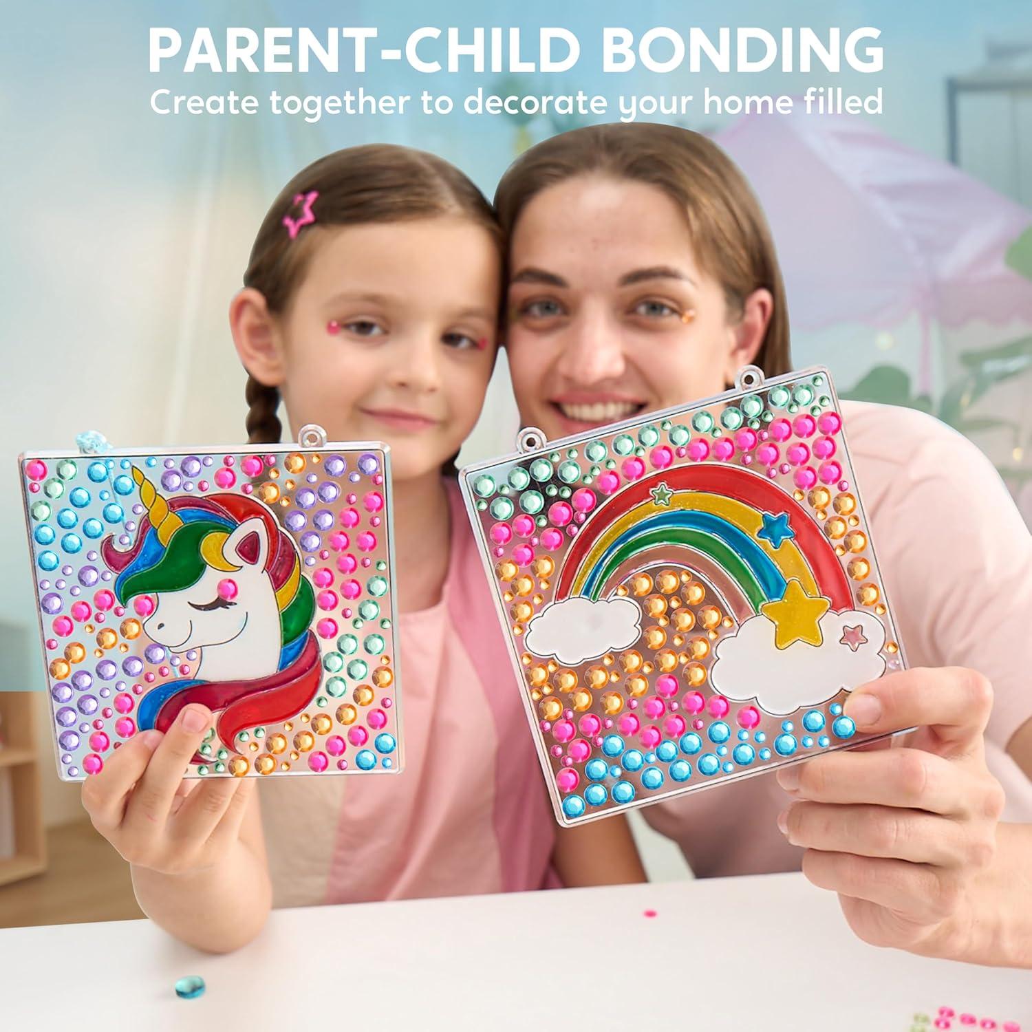 Complete Crafting Experience: Our craft kit includes everything needed for an immediate start. With 4 Suncatcher designs, 4 color guides, 3 Gem sticker sheeets, 6 window paint pens, 4 ropes, and 4 suction cups, your child can dive into the world of sparkling window art immediately