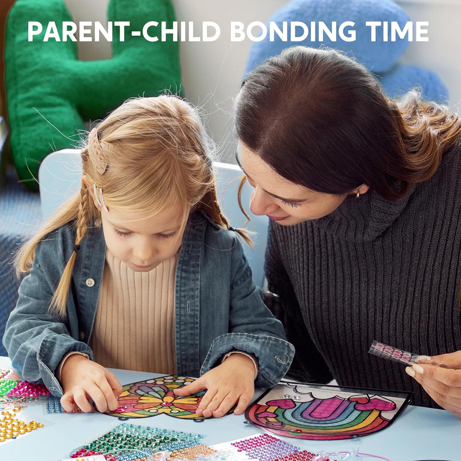 Complete Crafting Experience: Our craft kit includes everything needed for an immediate start. With 4 pre-printed window designs, 4 color guides, over 1200 gemstone stickers in 9 colors and 2 sizes, 4 ropes, and 4 suction cups, your child can dive into the world of sparkling window art immediately