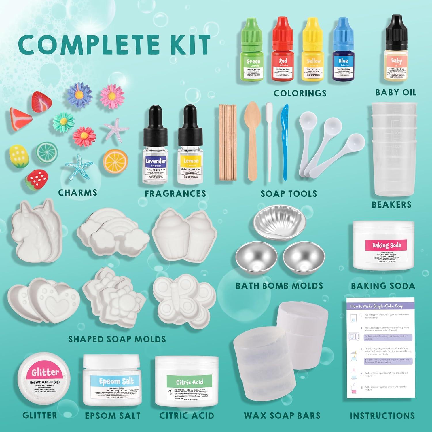 COMPLETE KIT & SUPER VALUE PACK. This kit includes everything you need for DIY bath bombs and soap. It includes citric acid, sodium bicarbonate, epsom salt, liquid colorings, fragrances, baby oil, soap wax blocks, glitter, surprise charms. It comes with multiple tools, including 12 single-sided soap molds, 2 bath bomb ball mold, 3 teaspoons, 4 beakers, 10 pop sticks, pipette, wooden spa spoon, gift bag, instruction. This kit creates real science fun for kids.