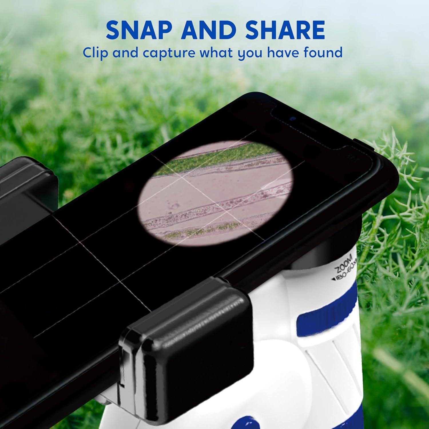 Convenient Phone Holder: Featuring a removable phone holder, this microscope enables kids to effortlessly capture their observations and take photos of what they see through the lens. This makes each discovery interactive and enjoyable. This functionality encourages children to document their findings and share their exciting scientific adventures with family and friends.