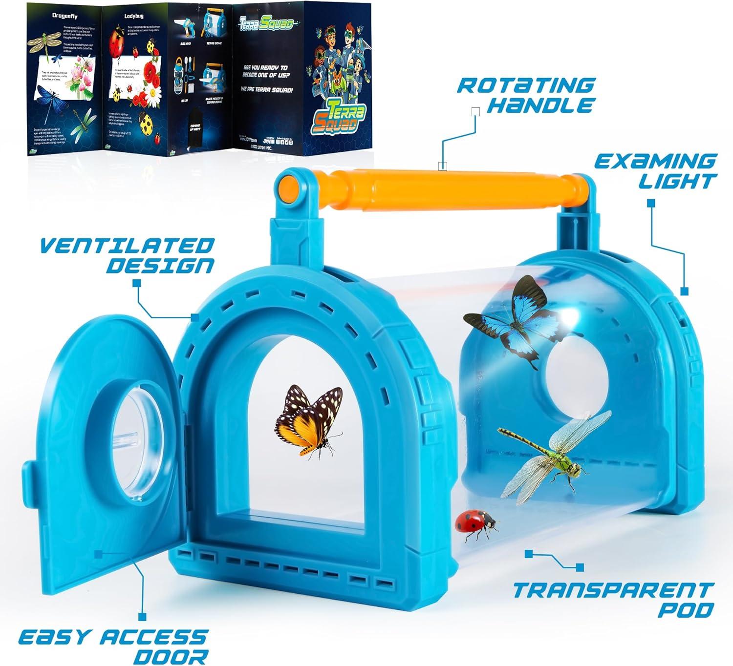Critter Barn Habitat with LED Lights: This carry-on observation insect collection kit features embedded LED lights, an observation door with an embedded magnifying lens, and provides a safe and comfortable environment for your child's captured insects.