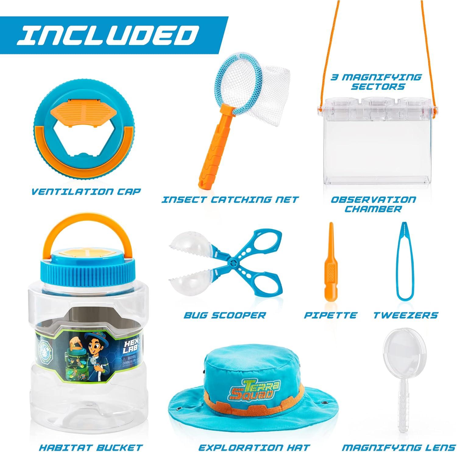 Ultimate Bug-Hunting Adventure Kit: The Play-Act HexLab Bug Catcher with Habitat Bucket is an 9-piece set that turns bug-catching and nature exploration into an exciting and captivating journey, inspiring kids to step outside, explore, and unleash their inner bug-hunting hero! The set includes 1 bug habitat bucket,1 magnifying lens, 1 bug tong, 1 tweezer, 1 pipette, 1 bug observation chamber with strap, 1 butterfly net, 1 activity booklet and an exploration hat.