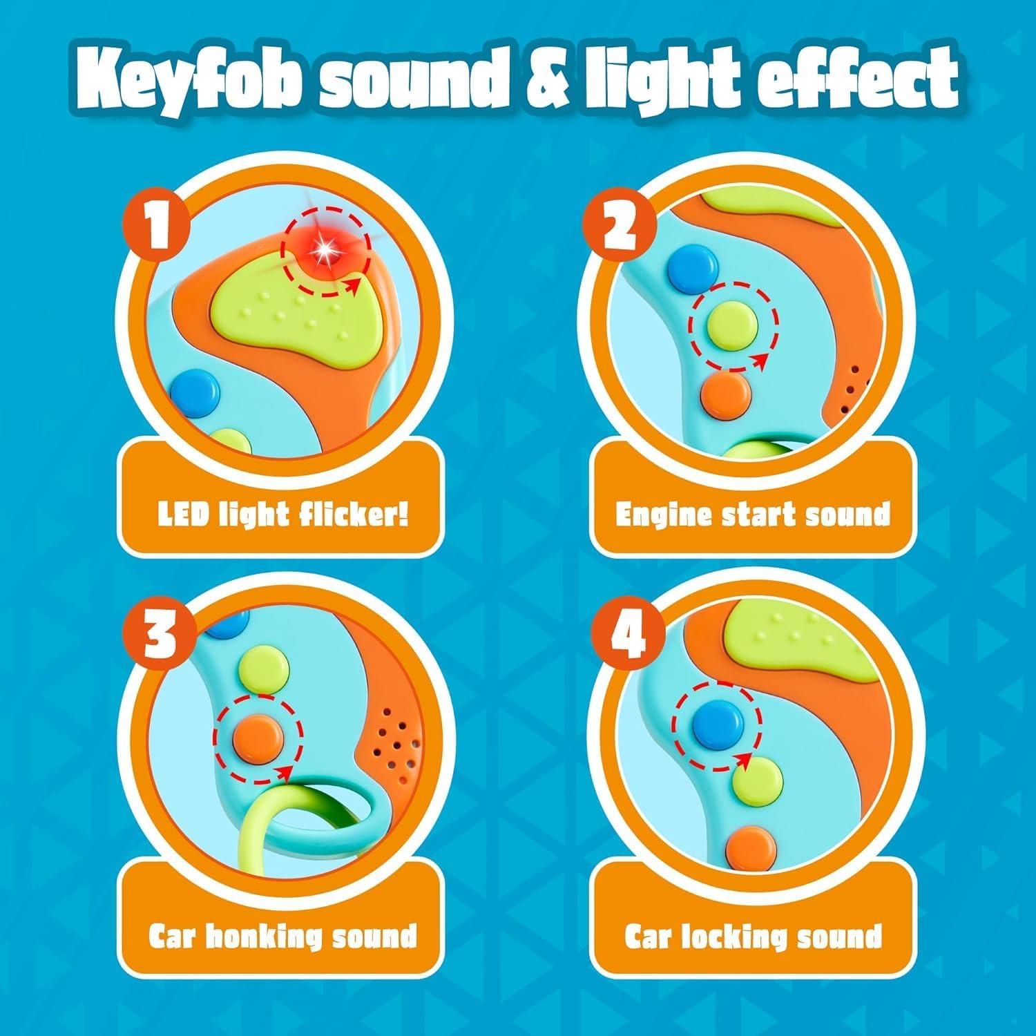 Sound Effects: Toy Mobile Phone (Requires 3 AAA Batteries Not Included) Talks Back to Kids with14 Different Unique Phrases and Music When Touched. Electronic Toy Keyfob (Requires 3 L44 Batteries Included) Features Colorful Press Buttons with Three Different Car Sounds.