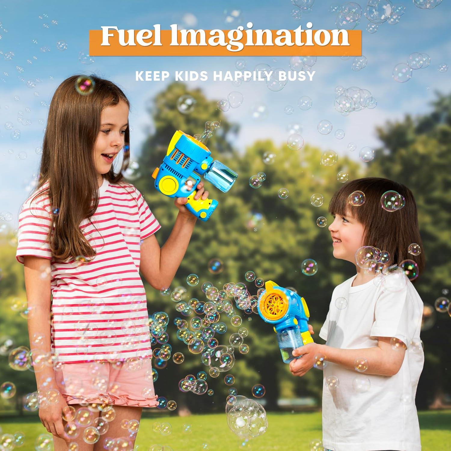 COMPREHENSIVE SET. Automatic Bubble Gun for Kids includes 2 pcs 3-color bubble gun,2 bottle 118 ml bubble solution and 4 packs of 12ml concentrated bubble solution, battery included.