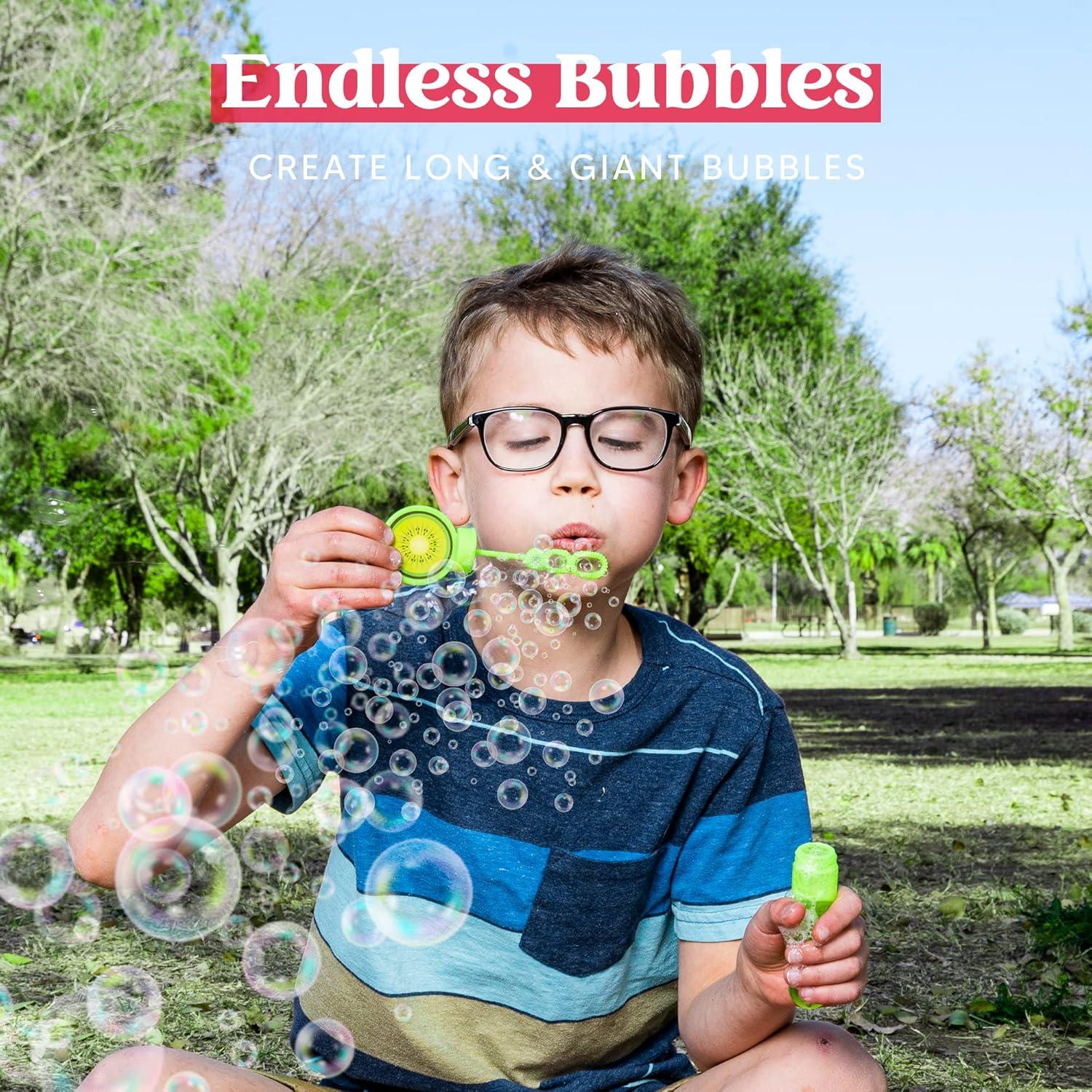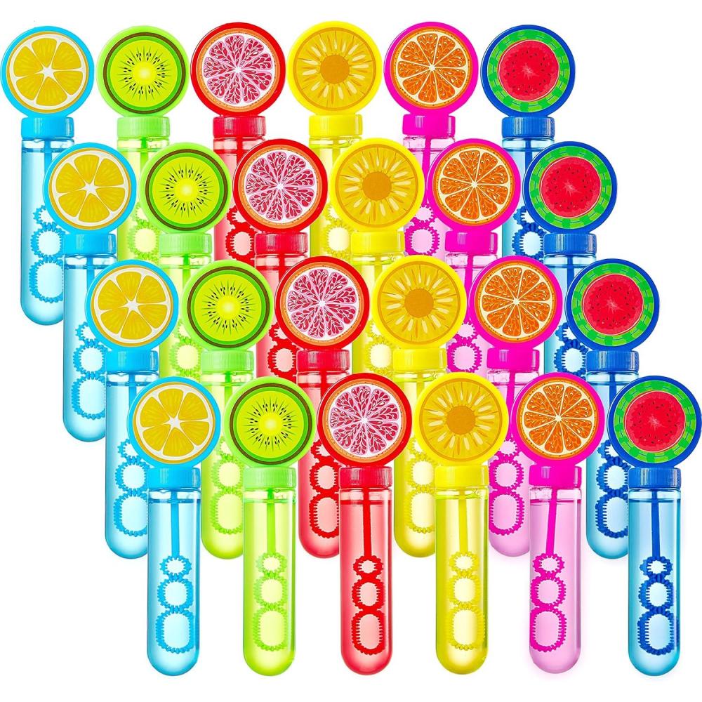 SUPER VALUE PACK. Our Colorful Fruit bubbles pack includes 24 Pack 1oz Assorted Fruit Top Bubble Tubes with Prefill Bubble Solution. These come with 6 Colorful sticker patterns: watermelon, lemon, orange, kiwi, pineapple, grapefruit.