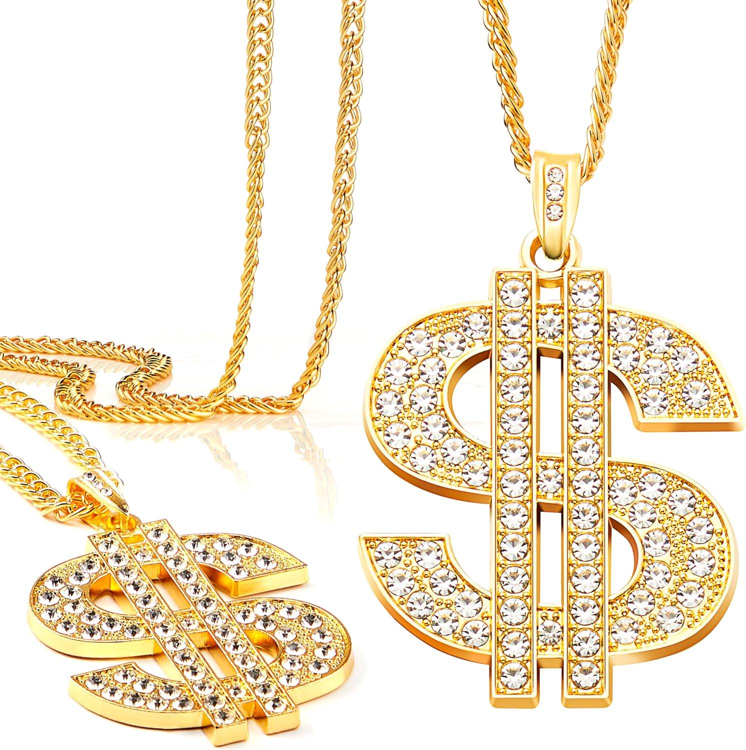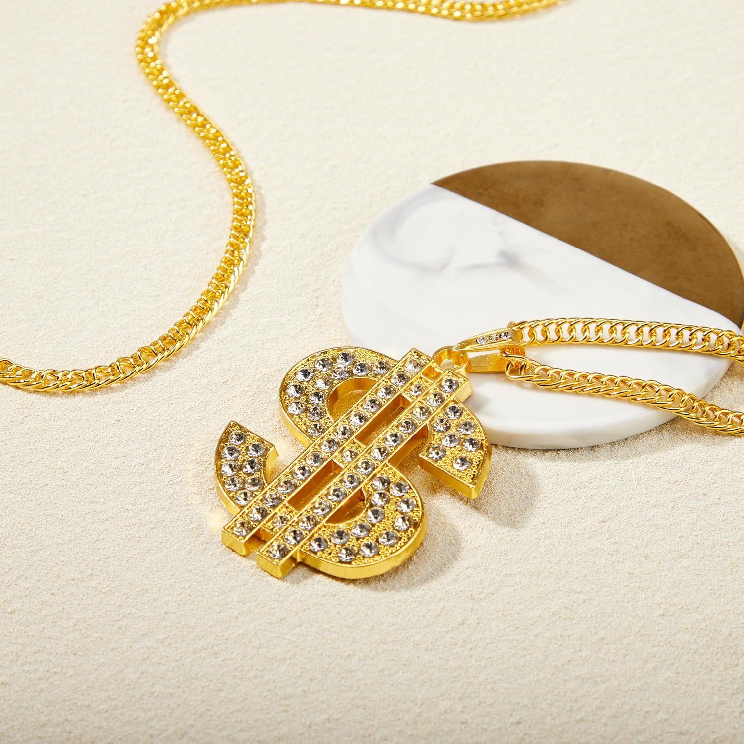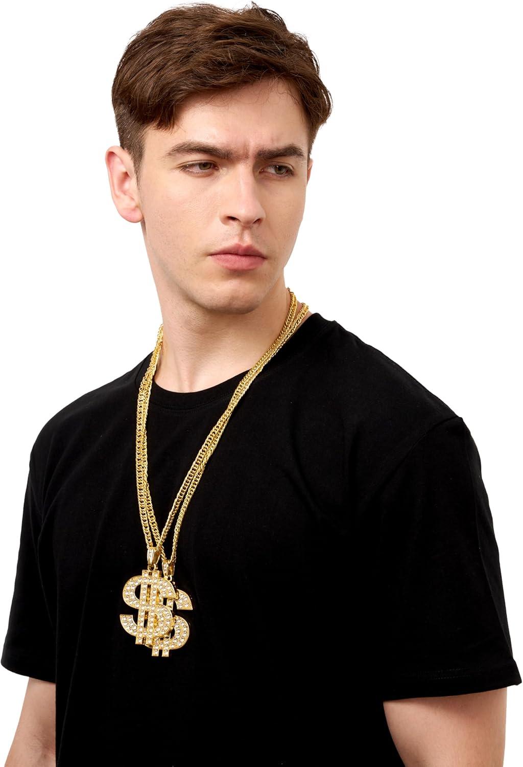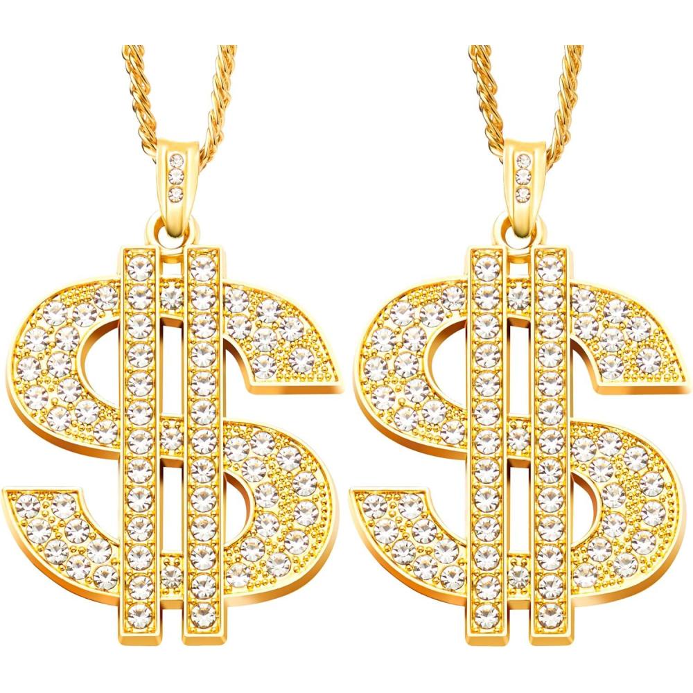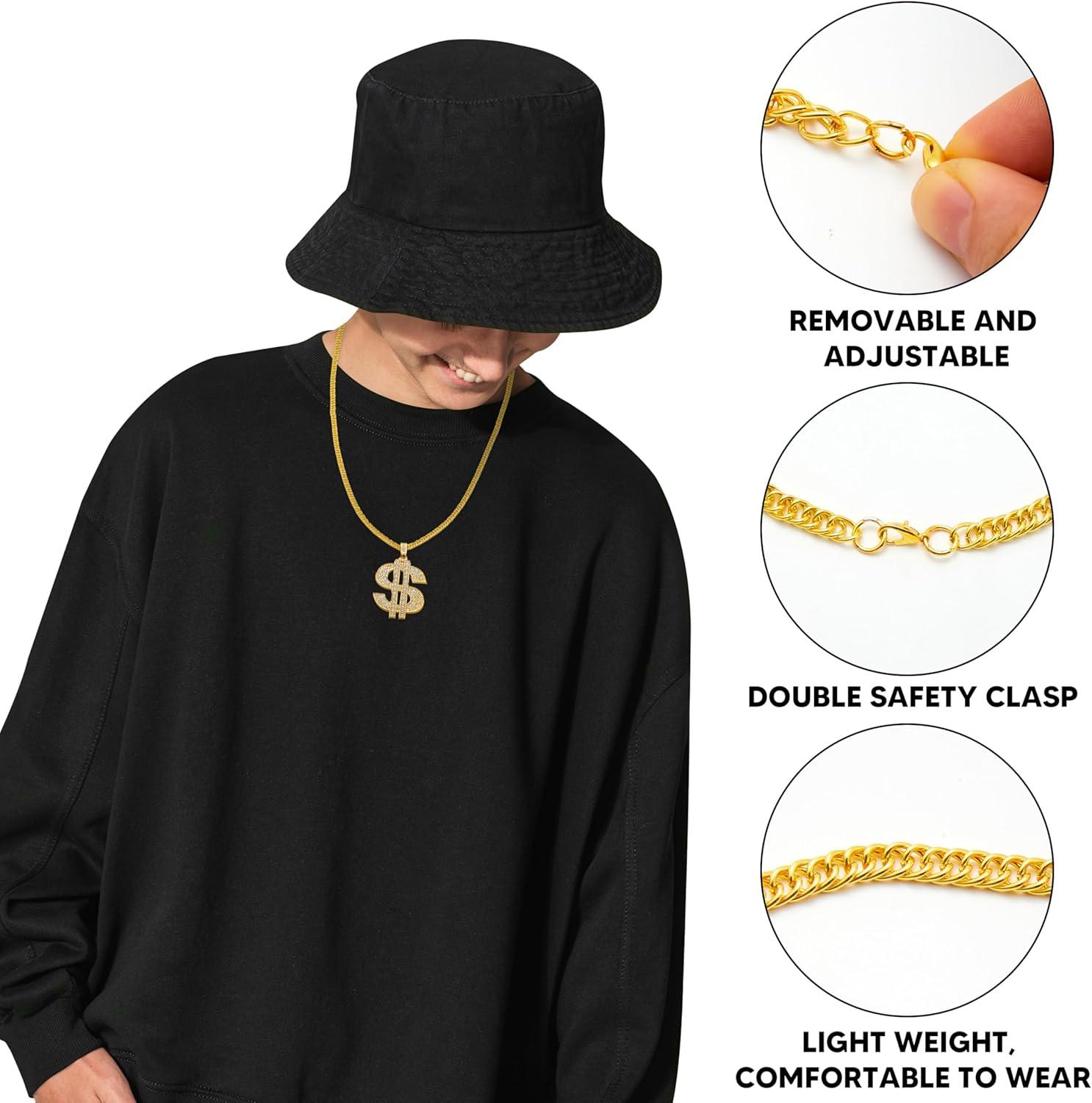 Unique Design. Our Gold Dollar Chain Accessories Set includes 2 pcs costume chains. Stand out with our eye-catching Hip Hop Necklace, featuring a rapper chain necklace design for a bold and stylish look. Enhance your Halloween experience with this fun and festive accessory, perfect for adding a touch of Hip Hop flair to your costume