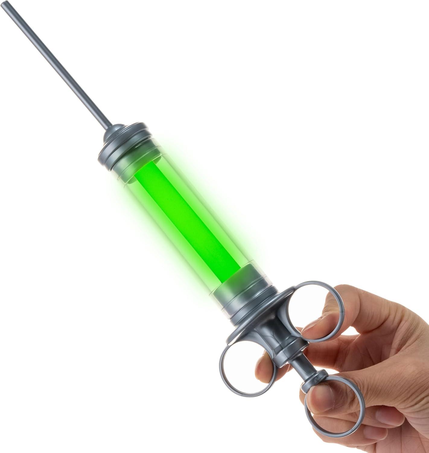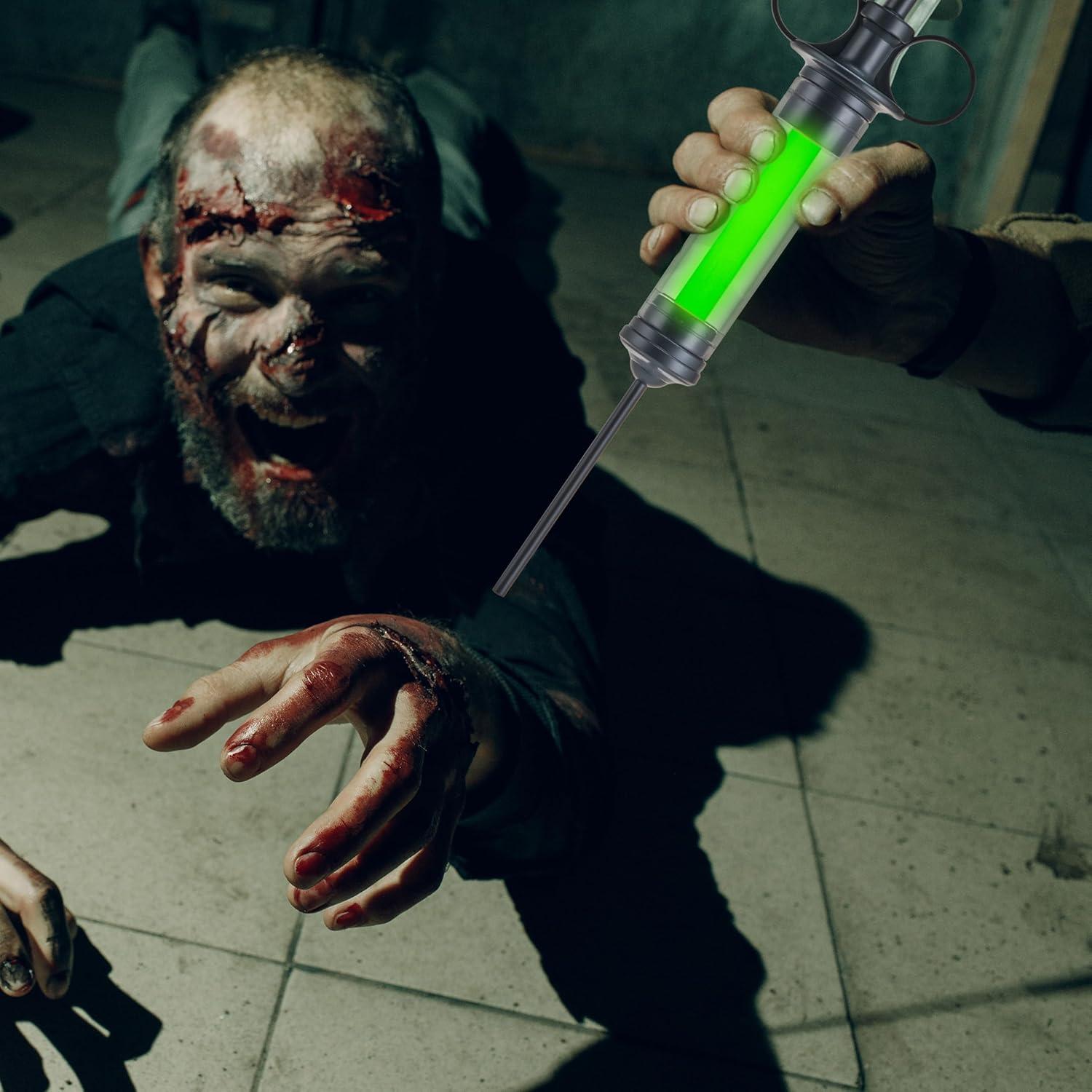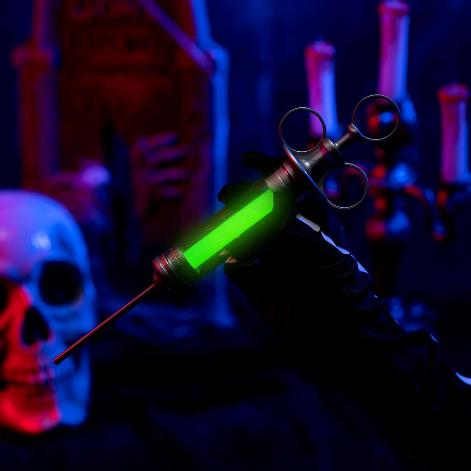 Perfect Accessory. Each package contains a 14.5 inch radioactive glowing syringes costume accessory. Pretend as a mad scientist or plague doctor with this green glowing syringe, adding a sinister touch to your Halloween scary costume ensemble.