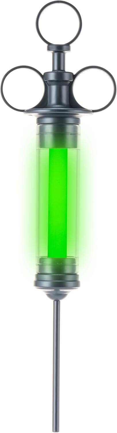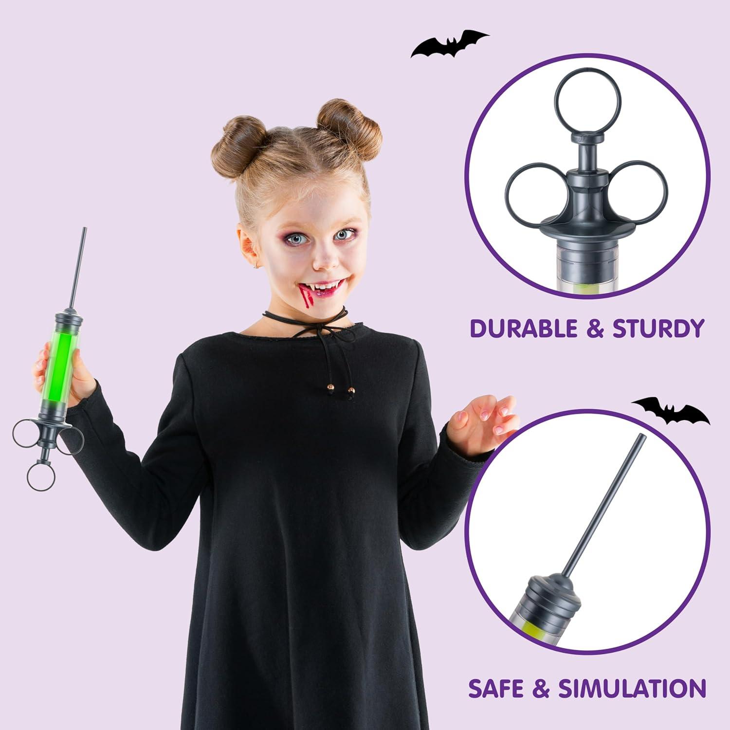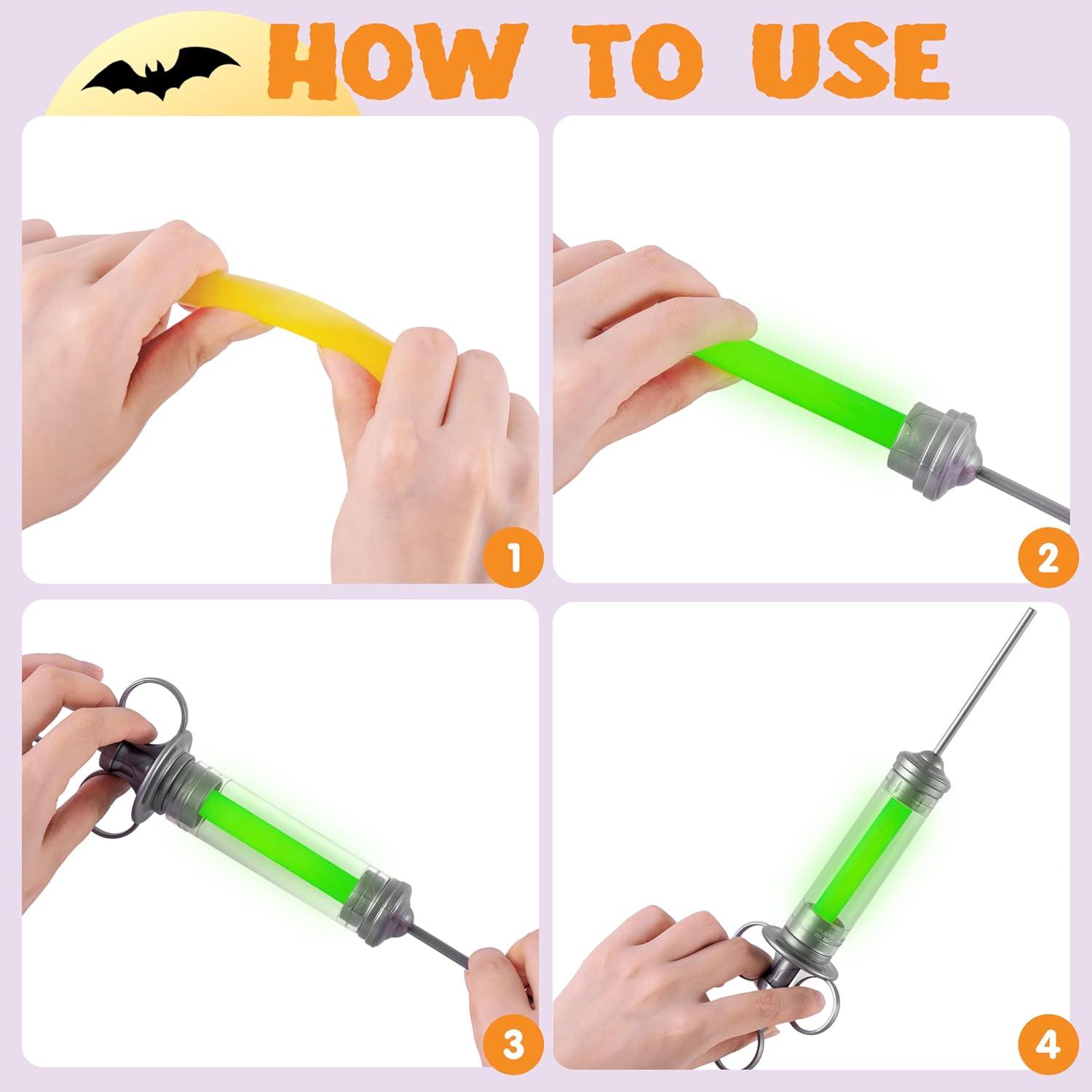 Perfect Accessory. Each package contains a 14.5 inch radioactive glowing syringes costume accessory. Pretend as a mad scientist or plague doctor with this green glowing syringe, adding a sinister touch to your Halloween scary costume ensemble.